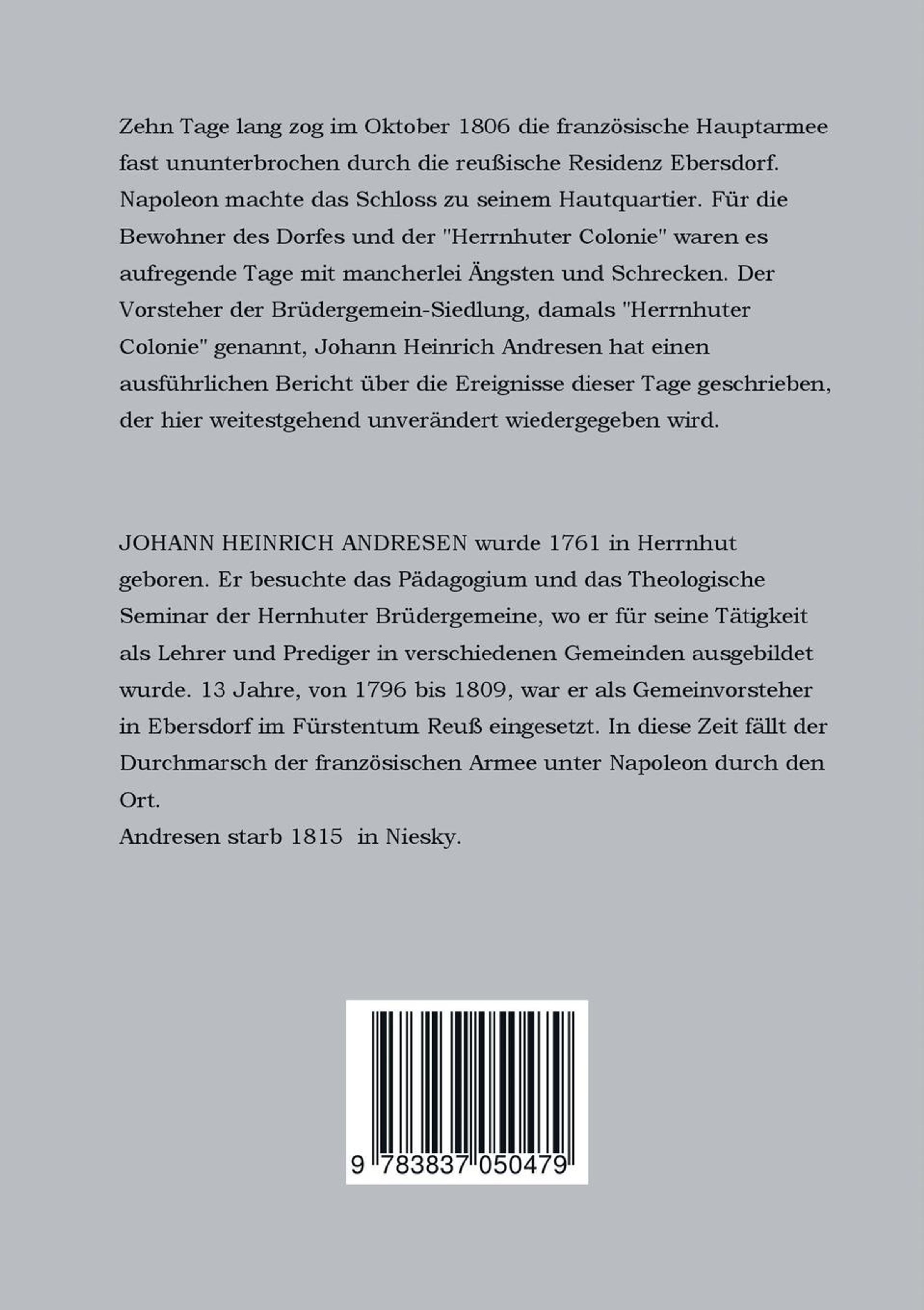 Zehn Tage lang zog im Oktober 1806 die französische Hauptarmee fast ununterbrochen durch die preußische Residenz Ebersdorf. Napoleon machte das Schloss zu seinem Hautquartier. Für die Bewohner des Dorfes und der "Herrnhuter Colonie" waren es aufregende Tage mit mancherlei Ängsten und Schrecken. Der damalige Vorsteher der Brüdergemein-Siedlung "Herrnhuter Colonie" Johann Heinrich Andresen hat einen ausführlichen Bericht über die Ereignisse dieser Tage geschrieben, der hier weitestgehend unverändert wiedergegeben wird.