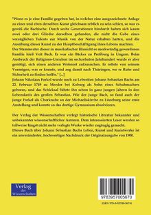 \"Wenn es je eine Familie gegeben hat, in welcher eine ausgezeichnete Anlage zu einer und eben derselben Kunst gleichsam erblich zu sein schien, so war es gewiß die Bachische. Durch sechs Generationen hindurch haben sich kaum zwei oder drei Glieder derselben gefunden, die nicht die Gabe eines vorzüglichen Talents zur Musik von der Natur erhalten hatten, und die Ausübung dieser Kunst zu der Hauptbeschäftigung ihres Lebens machten. Der Stammvater dieser in musikalischer Hinsicht so merkwürdig gewordenen Familie hieß Veit Bach. Er war ein Bäcker zu Preßburg in Ungarn. Beim Ausbruch der Religions-Unruhen im sechzehnten Jahrhundert wurde er aber genötigt, sich einen anderen Wohnort aufzusuchen. Er rettete von seinem Vermögen, was er konnte, und zog damit nach Thüringen, wo er Ruhe und Sicherheit zu finden hoffte.\" [...] Johann Nikolaus Forkel wurde noch zu Lebzeiten Johann Sebastian Bachs am 22. Februar 1749 zu Meeder bei Koburg als Sohn eines Schuhmachers geboren, und das Schicksal führte ihn schon in ganz jungen Jahren in den Lebenskreis des großen Sebastian. Wie der junge Bach, so fand auch der junge Forkel als Chorknabe an der Michaeliskirche zu Lüneburg seine erste Anstellung und konnte so das dortige Gymnasium absolvieren.