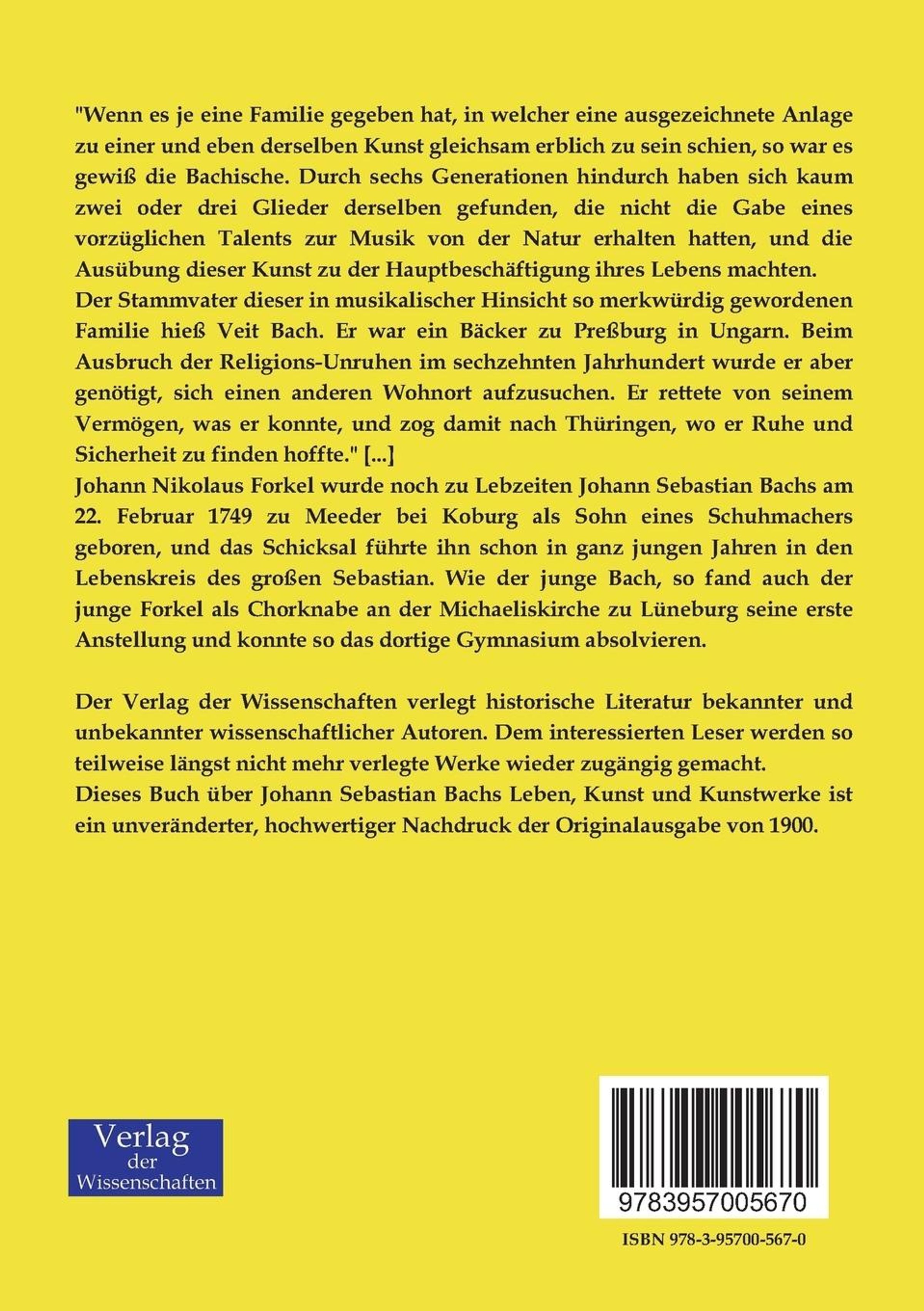 Der Verlag der Wissenschaften verlegt historische Literatur bekannter und unbekannter wissenschaftlicher Autoren. Dem interessierten Leser werden so teilweise längst nicht mehr verlegte Werke wieder zugängig gemacht. Dieses Buch über Johann Sebastian Bachs Leben, Kunst und Kunstwerke ist ein unveränderter, hochwertiger Nachdruck der Originalausgabe von 1900.
