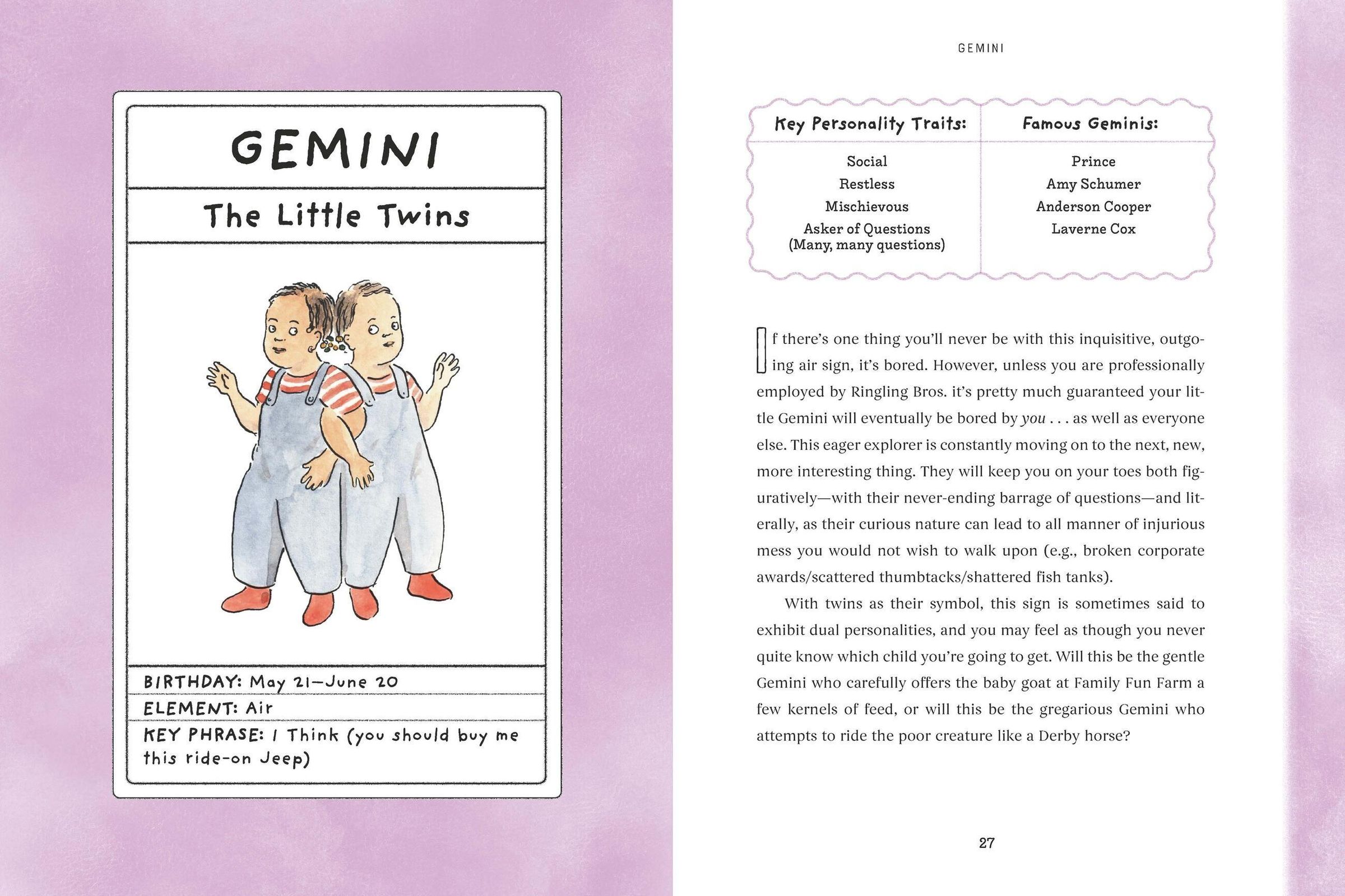 This is a book that lets parents laugh at the sheer insanity of sharing their home with someone who cackles when you break your toe and insists on wearing oven mitts to bed. Blending parental exasperation with cosmic insight, Gohmann breaks down toddler personalities by zodiac sign---offering a starry-eyed (and slightly frazzled) look at the joys and mysteries of raising tiny humans. The profiles of each zodiac sign include sections dedicated to best (and worst!) toddler playdate matches; toddler's preferred music, snacks, and toys; parent-child zodiac compatibility; and hilarious illustrations throughout from cartoonist Emily Flake. Whether you are raising a tenacious Taurus, a balanced Libra, or, yes, a hell-raising Scorpio, this is a book that lets parents laugh at the sheer insanity of sharing their home with a tiny terror.