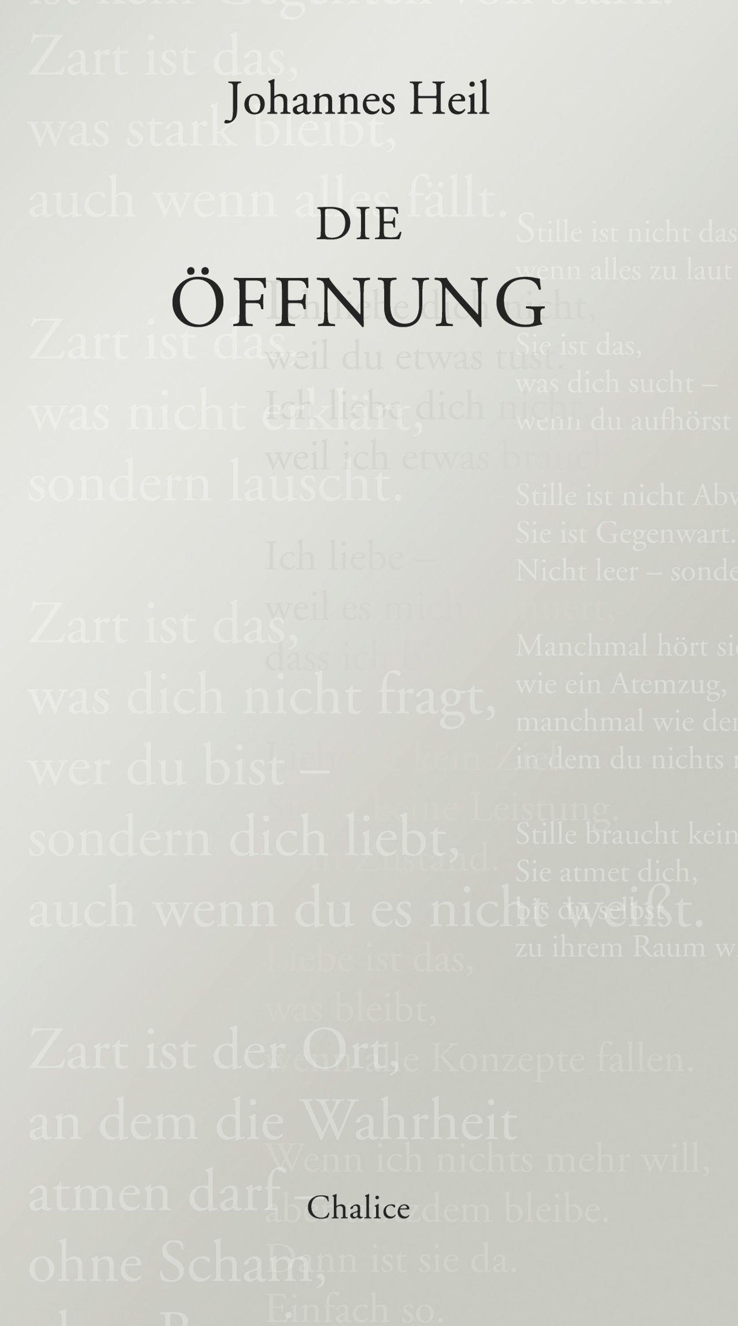 "Johannes Heil, DIE ÖFFNUNG, Chalice" in schwarzer Schrift auf hellem Hintergrund. Verblasste Texte im Hintergrund., Buch