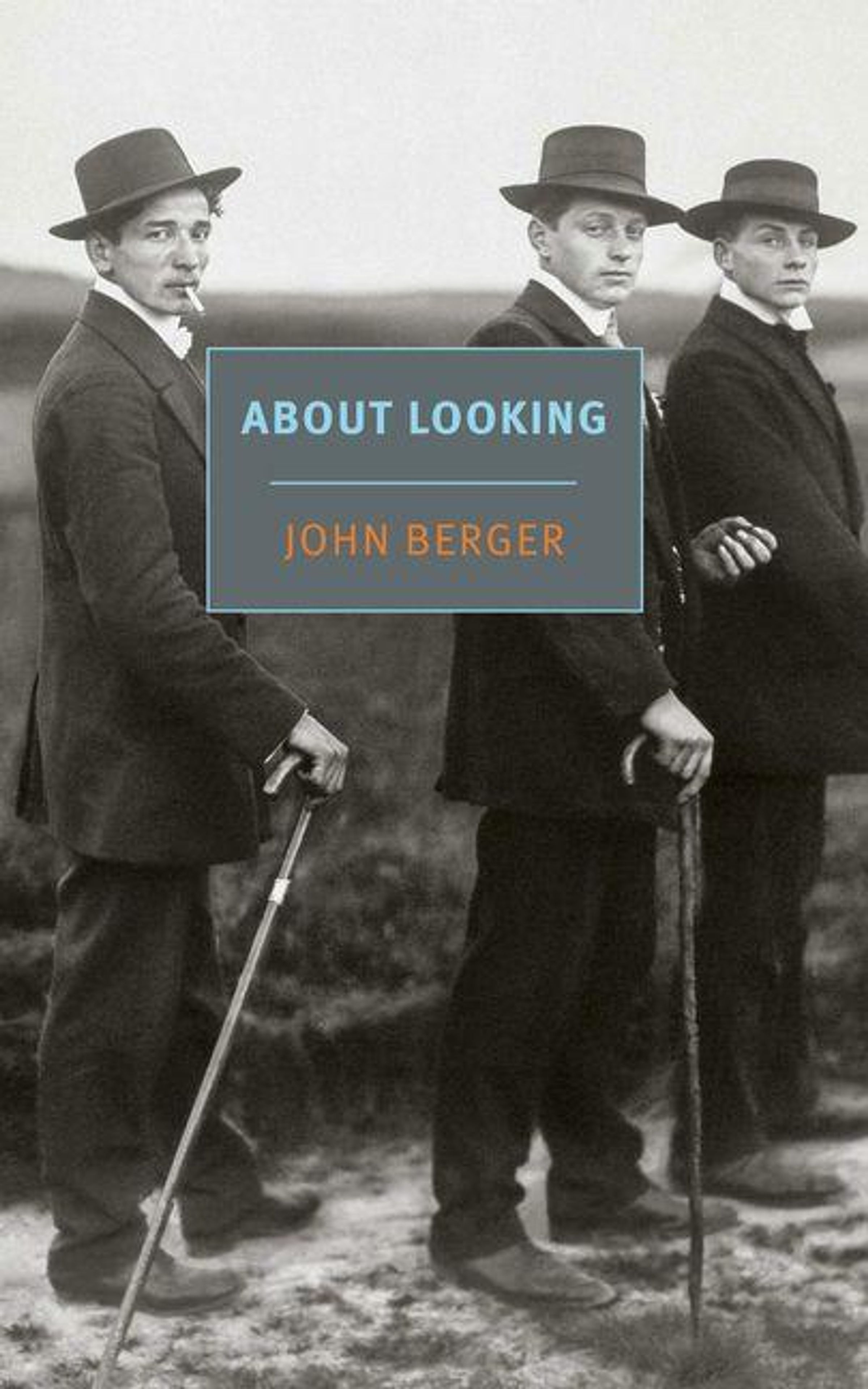 Text: "ABOUT LOOKING" und "JOHN BERGER". Drei junge Männer in Anzügen und Hüten, zwei mit Spazierstöcken, blicken zur Seite., Buch