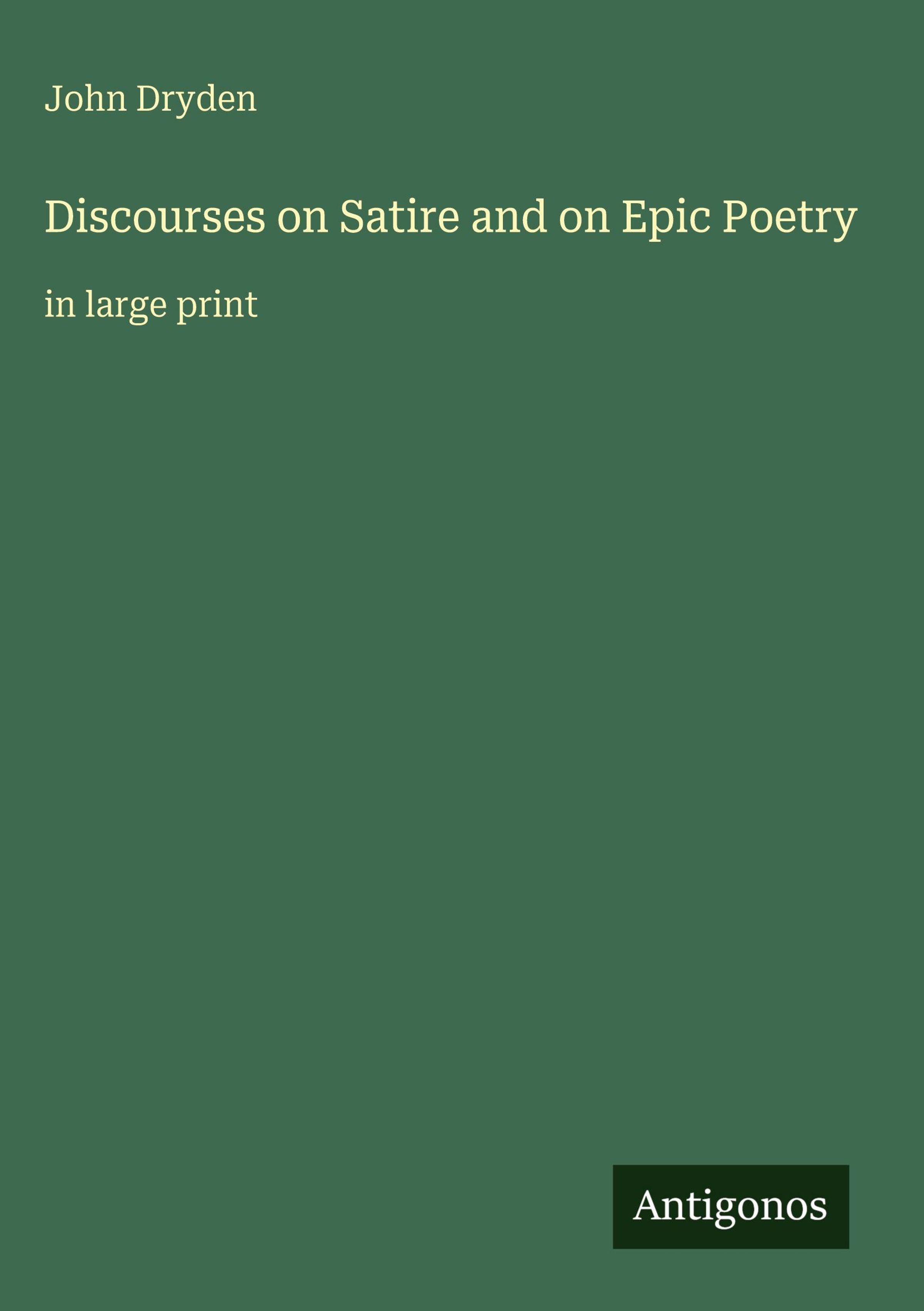John Dryden: Discourses on Satire and on Epic Poetry. Grüne, minimalistische Buchcover mit "Antigonos" Logo., Buch