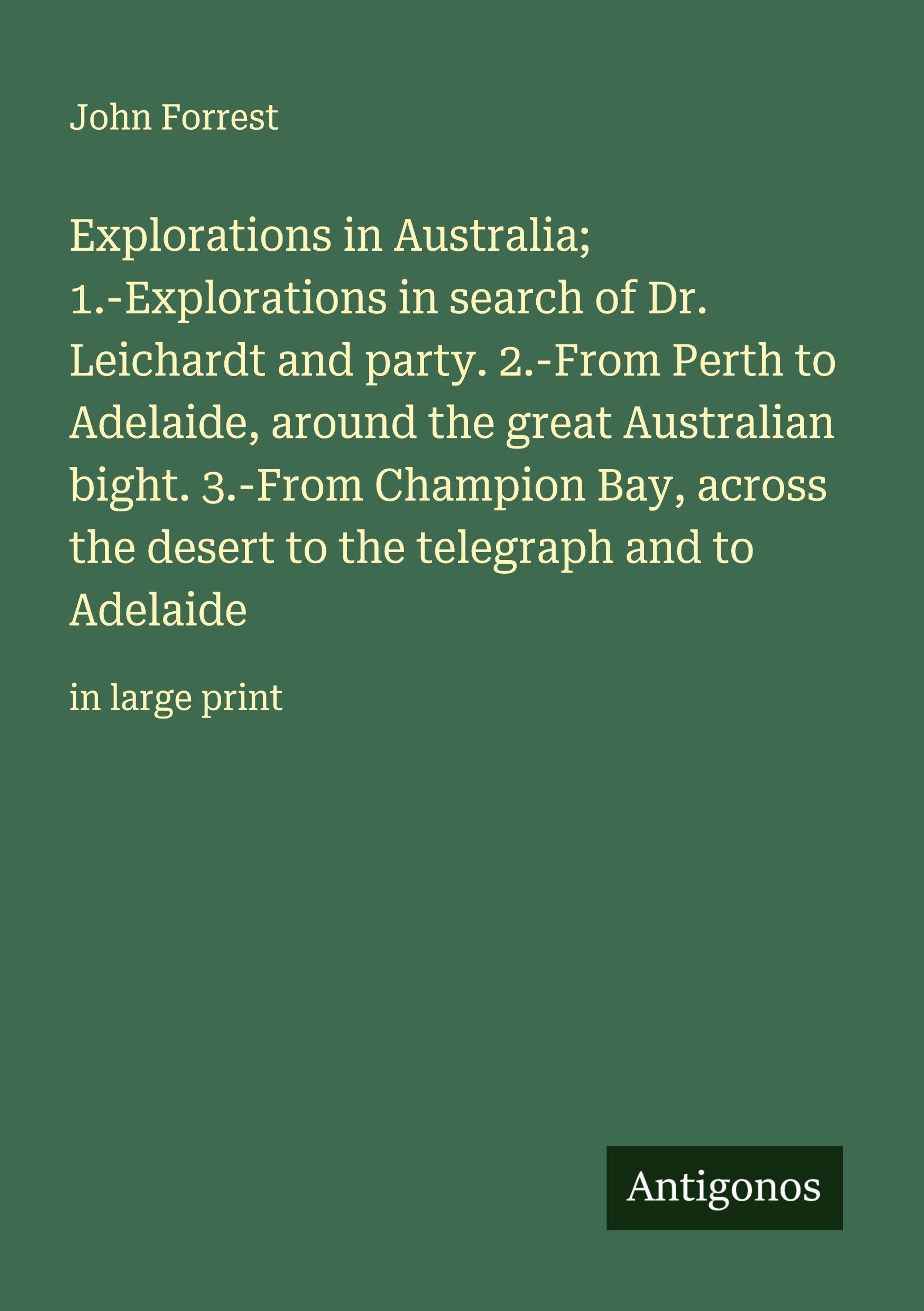 Explorations in Australia; 1.-Explorations in search of Dr. Leichardt and party. 2.-From Perth to Adelaide, around the great Australian bight. 3.-From Champion Bay, across the desert to the telegraph and to Adelaide