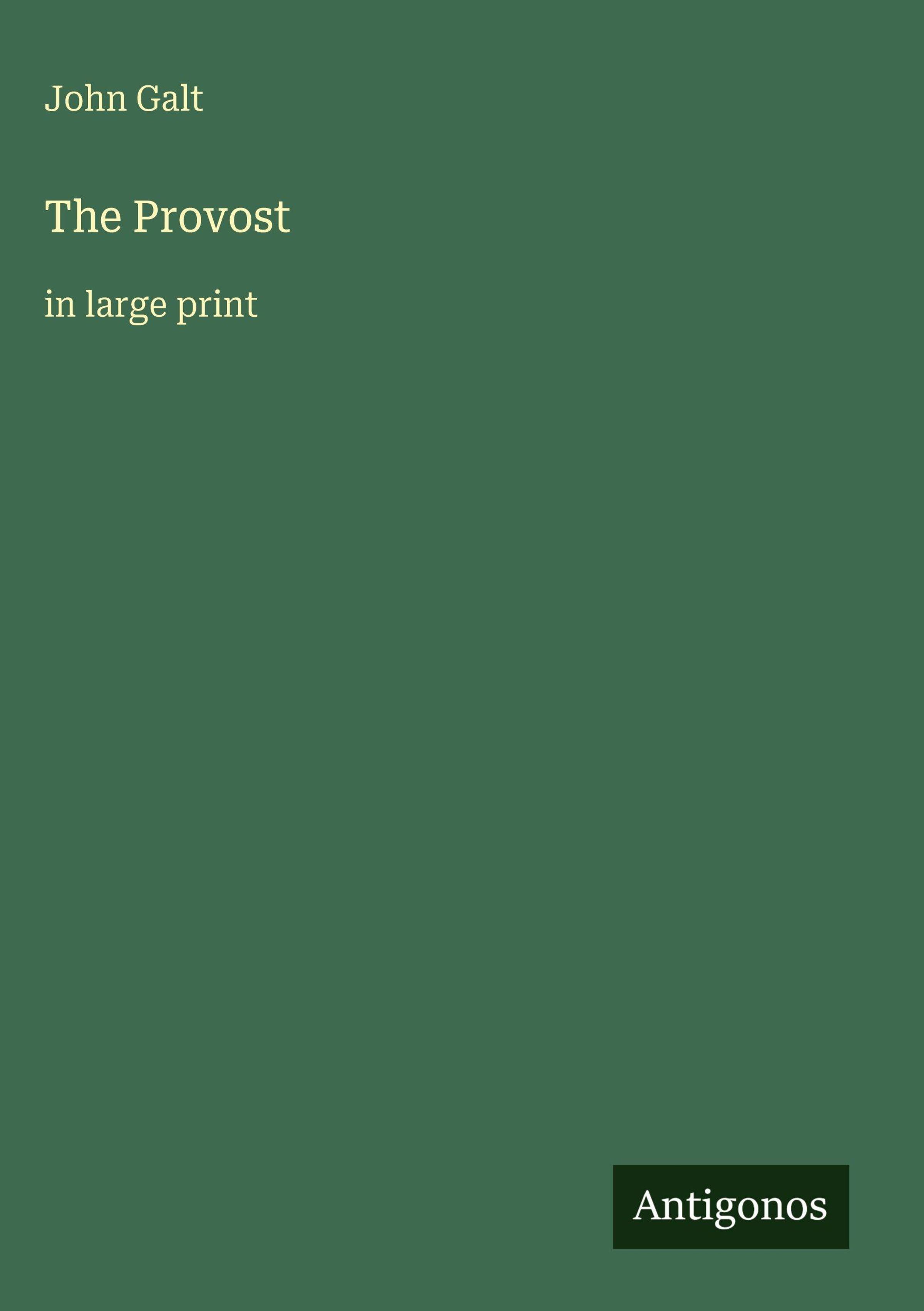 John Galt, The Provost, in large print. Unten steht ein kleines "Antigonos"-Logo auf einem grünen Hintergrund., Buch