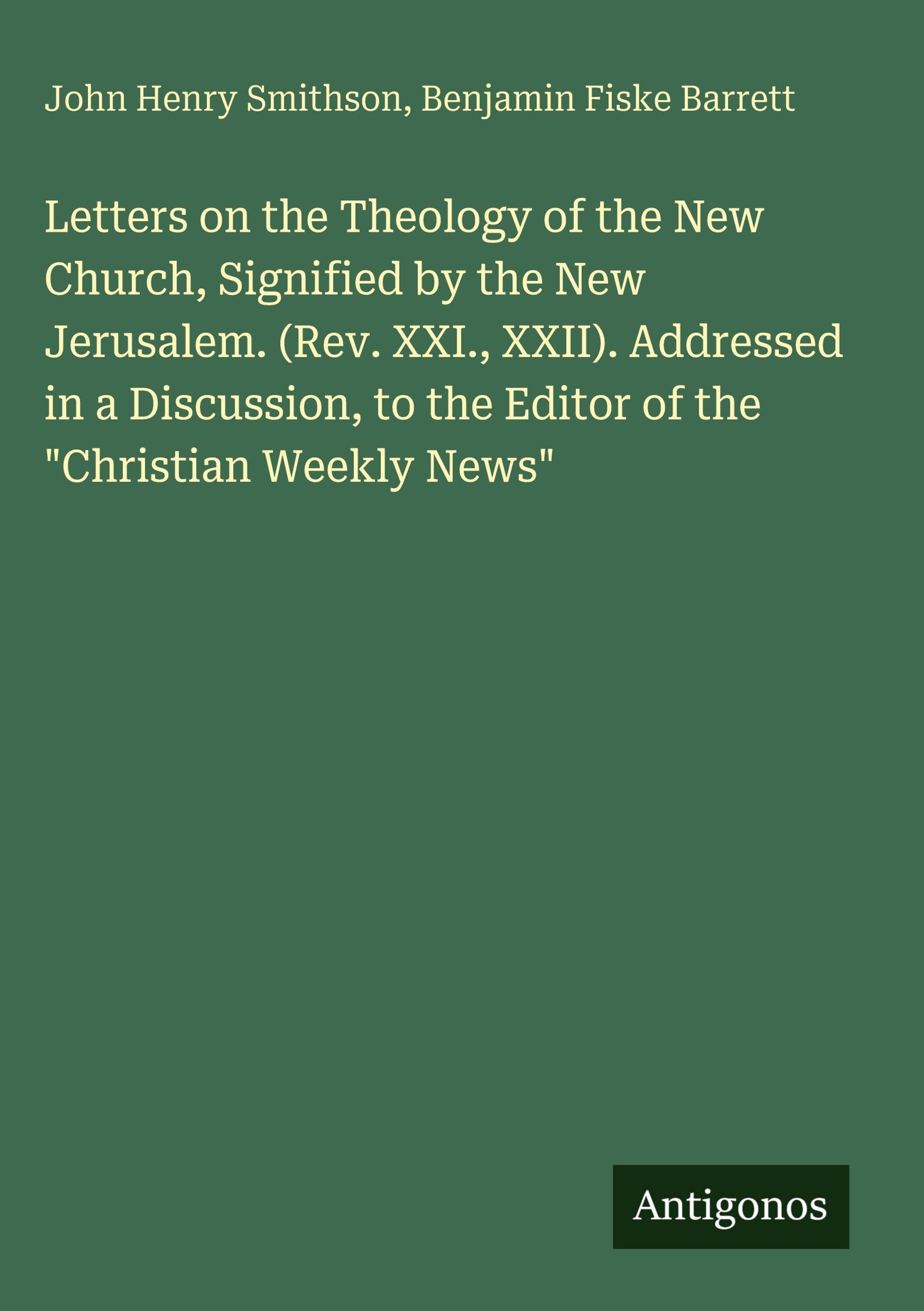 Letters on the Theology of the New Church, Signified by the New Jerusalem. (Rev. XXI., XXII). Addressed in a Discussion, to the Editor of the "Christian Weekly News"