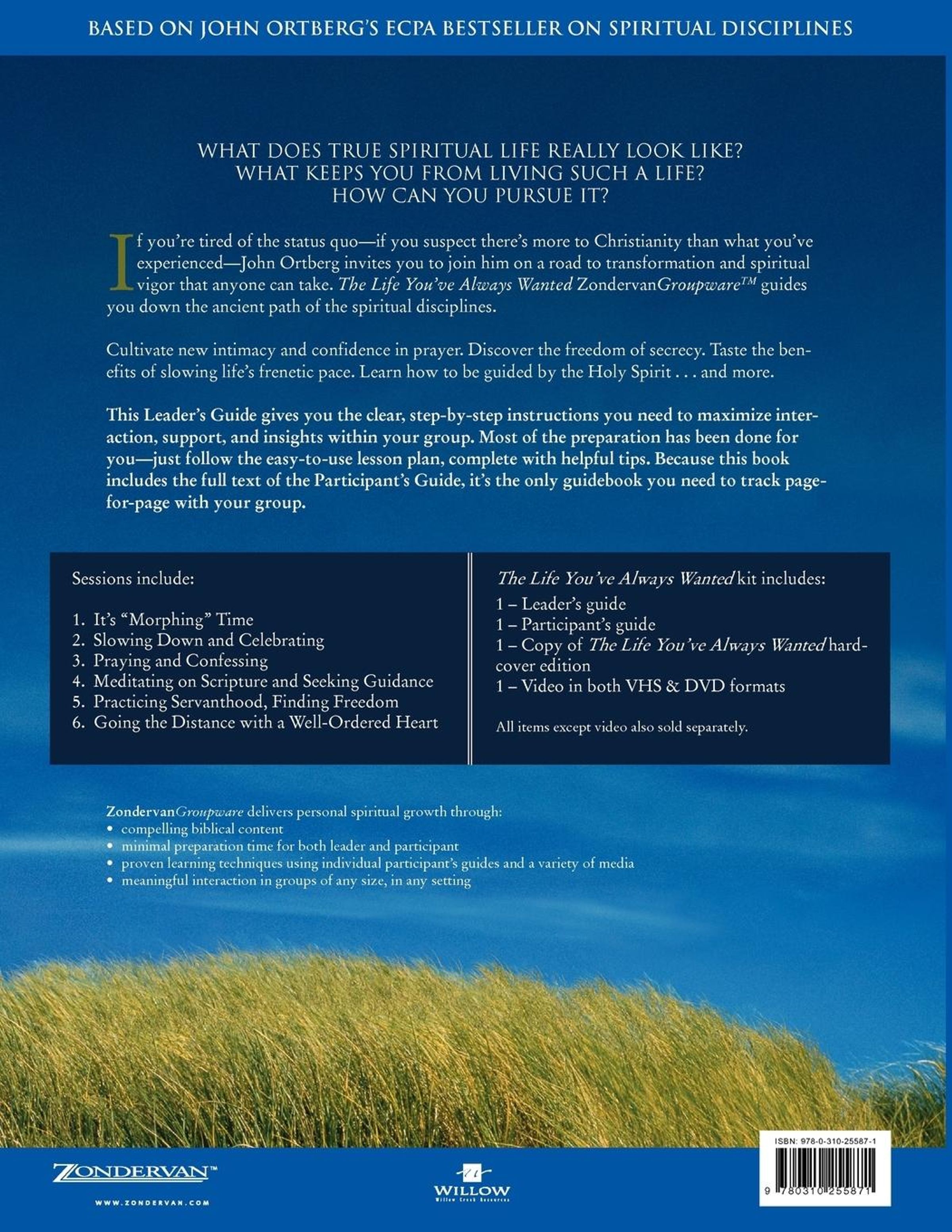 What does the spiritual life really look like? If you're tired of the status quo - if you suspect there's more to Christianity that what you've experienced - John Ortberg invites you to join him on a road to transformation and spiritual vigor that anyone can take. The Life You've Always Wanted video-based Bible study guide you down the ancient path of the spiritual disciplines. This Leader's Guide give you the clear, step-by-step instructions you need to maximize interaction, support, and insights within your group. Most of the preparation has been done for you - just follow the easy-to-use lesson plan, complete with helpful tips. Because this book includes the full text of the Participant's Guide, it's the only guidebook you need to track page-for-page with your group. Cultivate new intimacy and confidence in prayer. Discover the freedom of secrecy. Taste the benefits of slowing life's frenetic pace. Learn how to be guided by the Holy Spirit... and more. Sessions include: It's Morphing Time Slowing Down and Celebrating Praying and Confessing Meditating on Scripture and Seeking Guidance Practicing Servanthood, Finding Freedom Going the Distance with a Well-Ordered Heart
