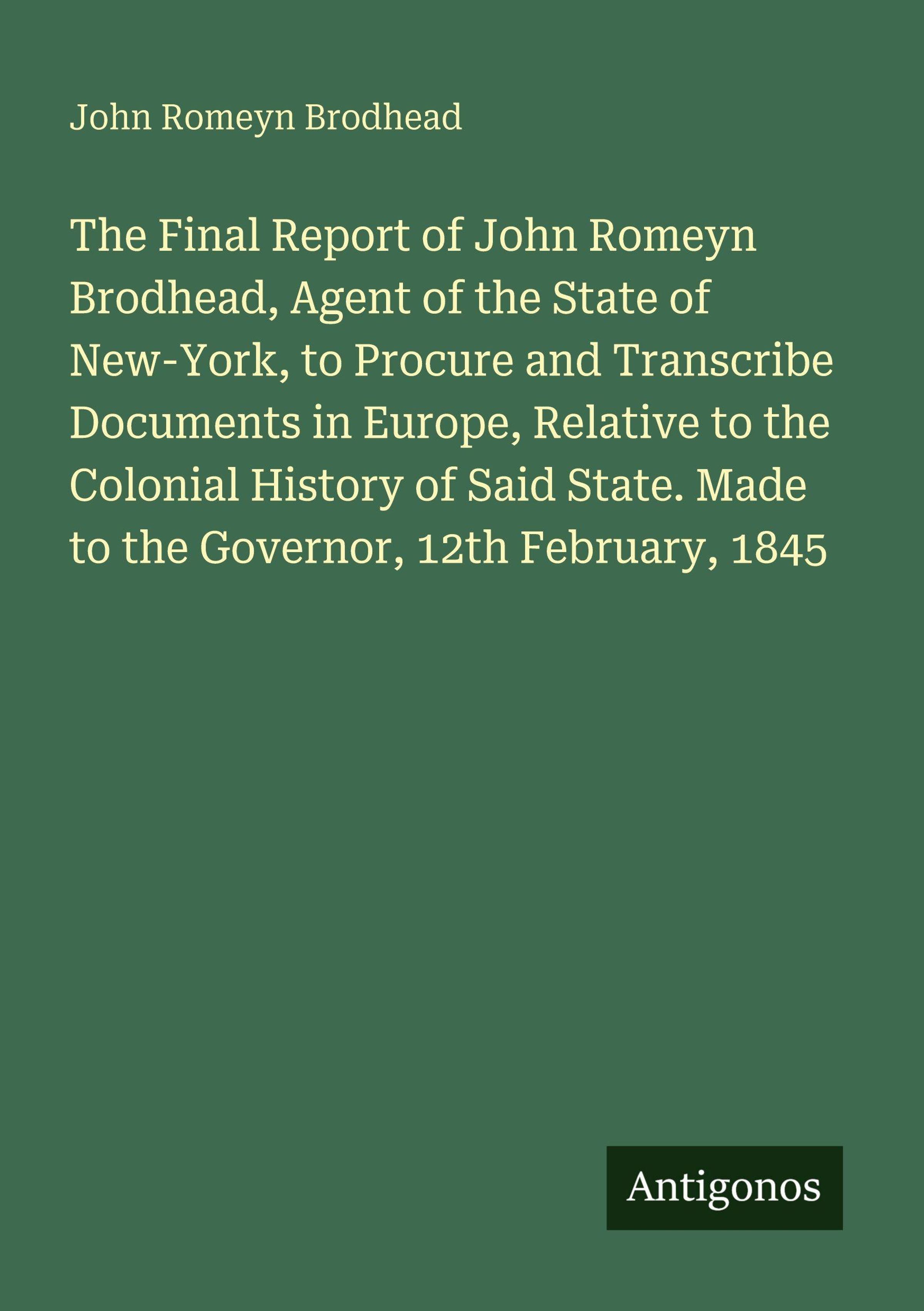 The Final Report of John Romeyn Brodhead, Agent of the State of New-York, to Procure and Transcribe Documents in Europe, Relative to the Colonial History of Said State. Made to the Governor, 12th February, 1845