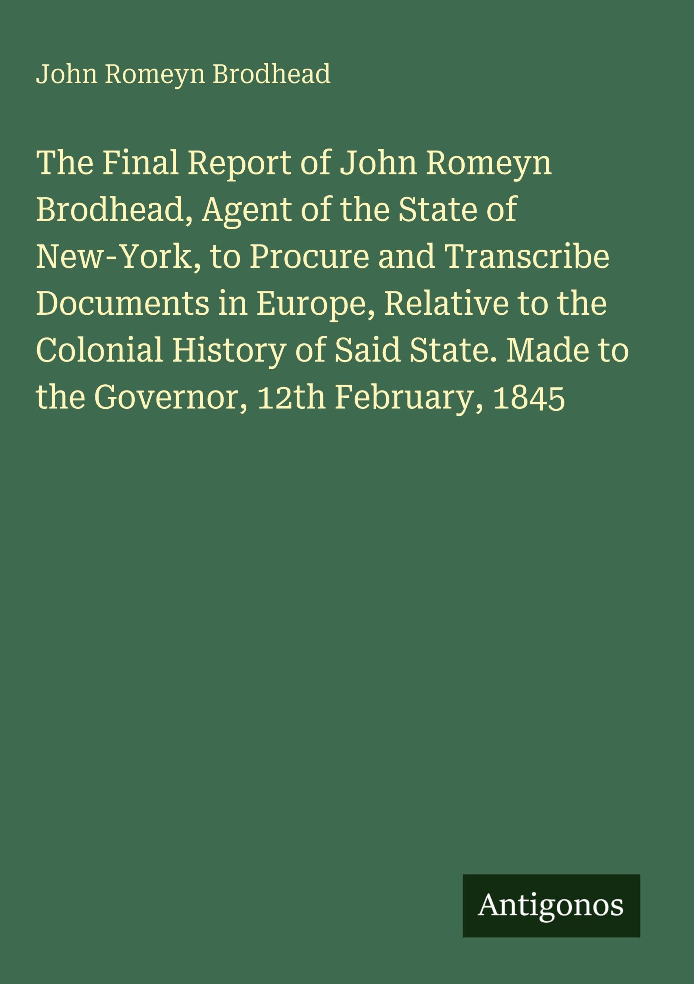 The Final Report of John Romeyn Brodhead, Agent of the State of New-York, to Procure and Transcribe Documents in Europe, Relative to the Colonial History of Said State. Made to the Governor, 12th February, 1845