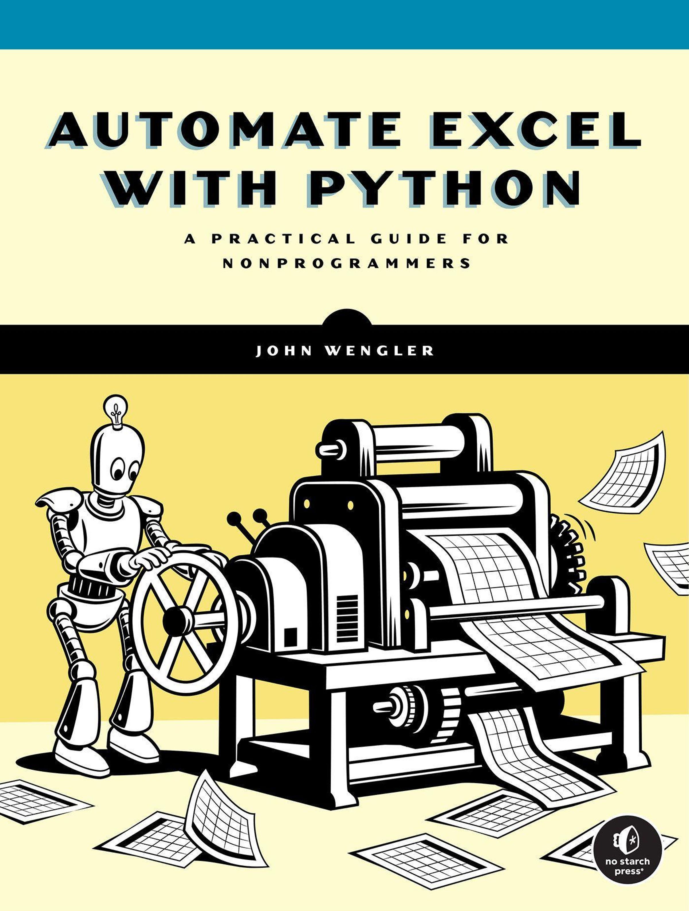 "AUTOMATE EXCEL WITH PYTHON" von John Wengler. Comic-Roboter bedient Druckmaschine voller Tabellenblätter., Buch