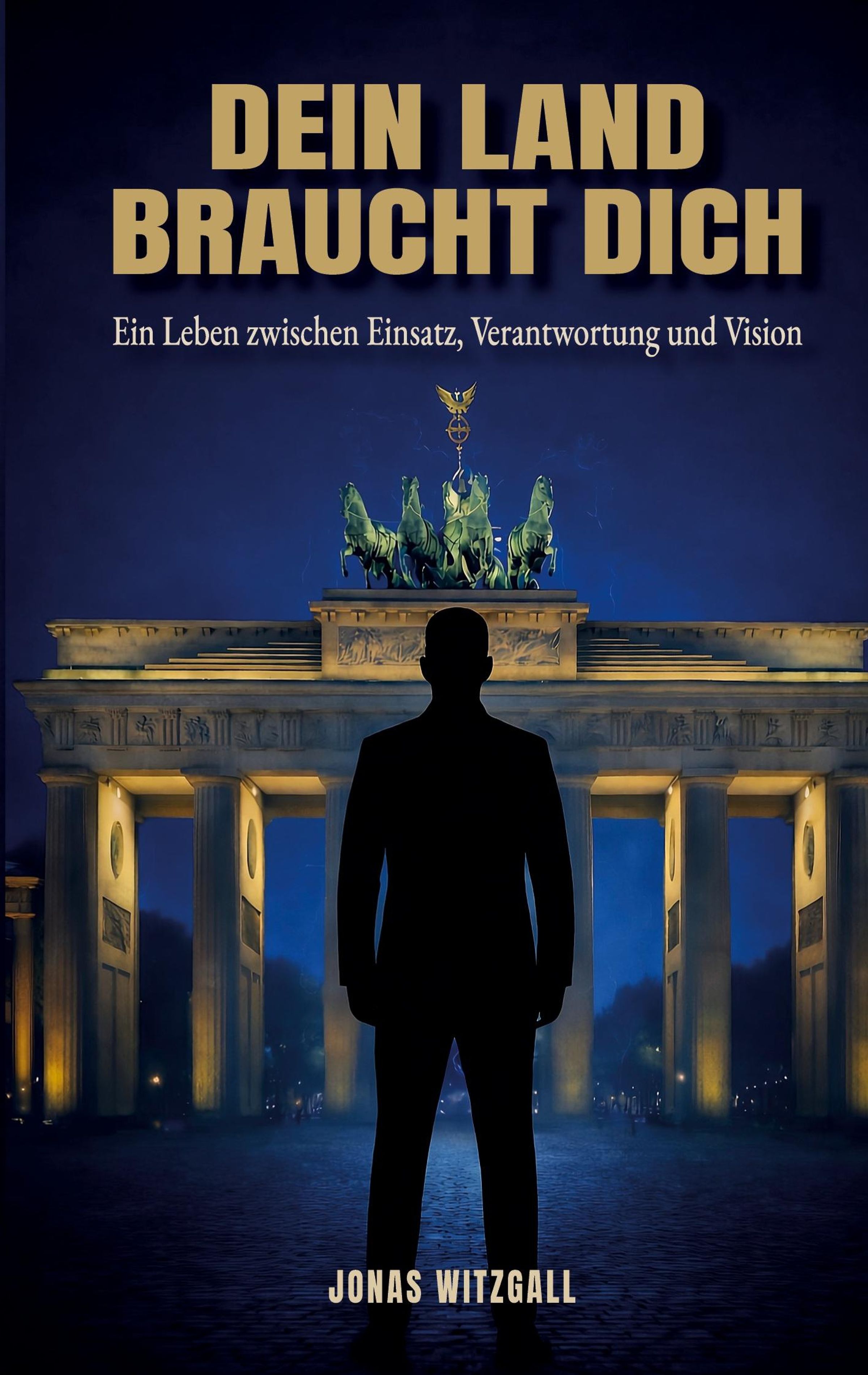 "DEIN LAND BRAUCHT DICH. Ein Leben zwischen Einsatz, Verantwortung und Vision. Jonas Witzgall." Silhouette vor Brandenburger Tor., Buch