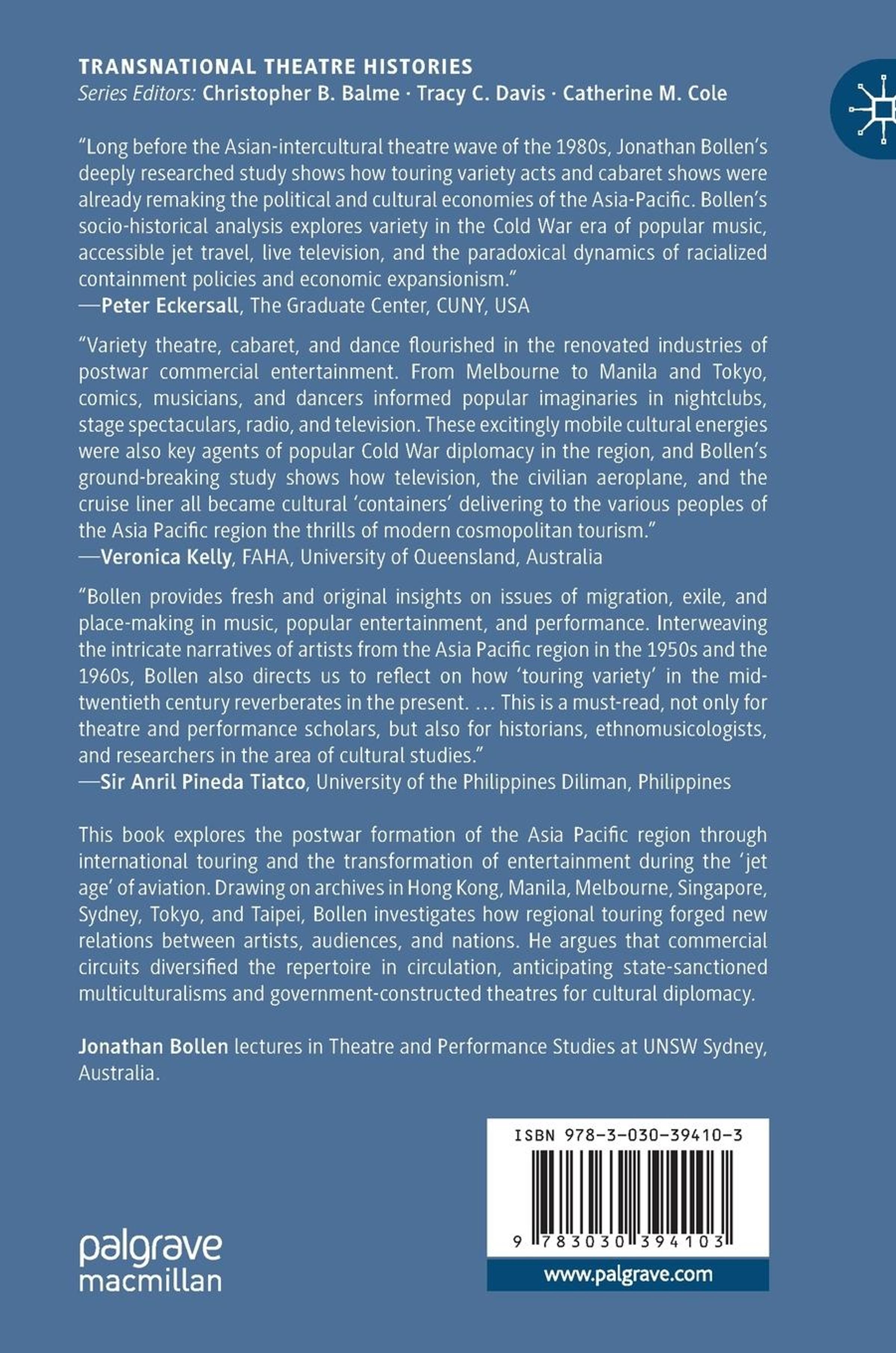 Aviation extended the horizon of international touring across Asia and the Pacific in the 1950s and 1960s. Nightclubs in Hong Kong, Manila, Melbourne, Singapore, Sydney, Tokyo, and Taipei presented an international array of touring acts. This book investigates how this happened. It explores the post-war formation of the Asia Pacific region through international touring and the transformation of entertainment during the jet age of aviation. Drawing on archival research across the region, Bollen investigates how touring variety forged new relations between artists, audiences, and nations. Mapping tours and tracing networks by connecting fragments, he reveals how versatile artists translated repertoire in circulation as they toured, and how entrepreneurial endeavours harnessed the production of national distinction to government agendas. He argues that touring variety on commercial circuits diversified the repertoire in regional circulation, anticipating the diversity emerging in state-sanctioned multiculturalisms, and driving the government-construction of national theatres for cultural diplomacy.