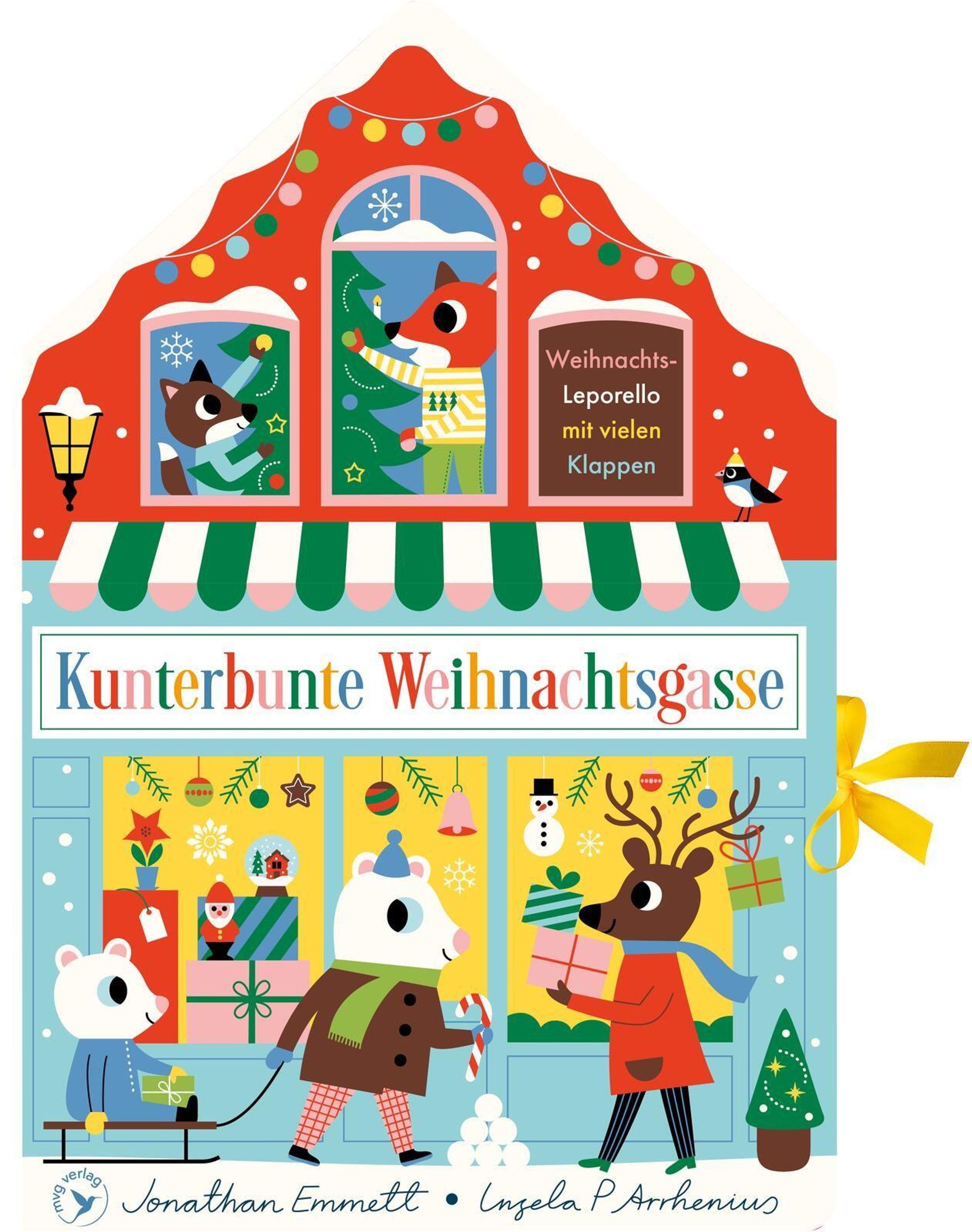 "Kunterbunte Weihnachtsgasse", "Weihnachts-Leporello mit vielen Klappen". Illustration: Tiere dekorieren, Geschenke, Schneemänner., Buch