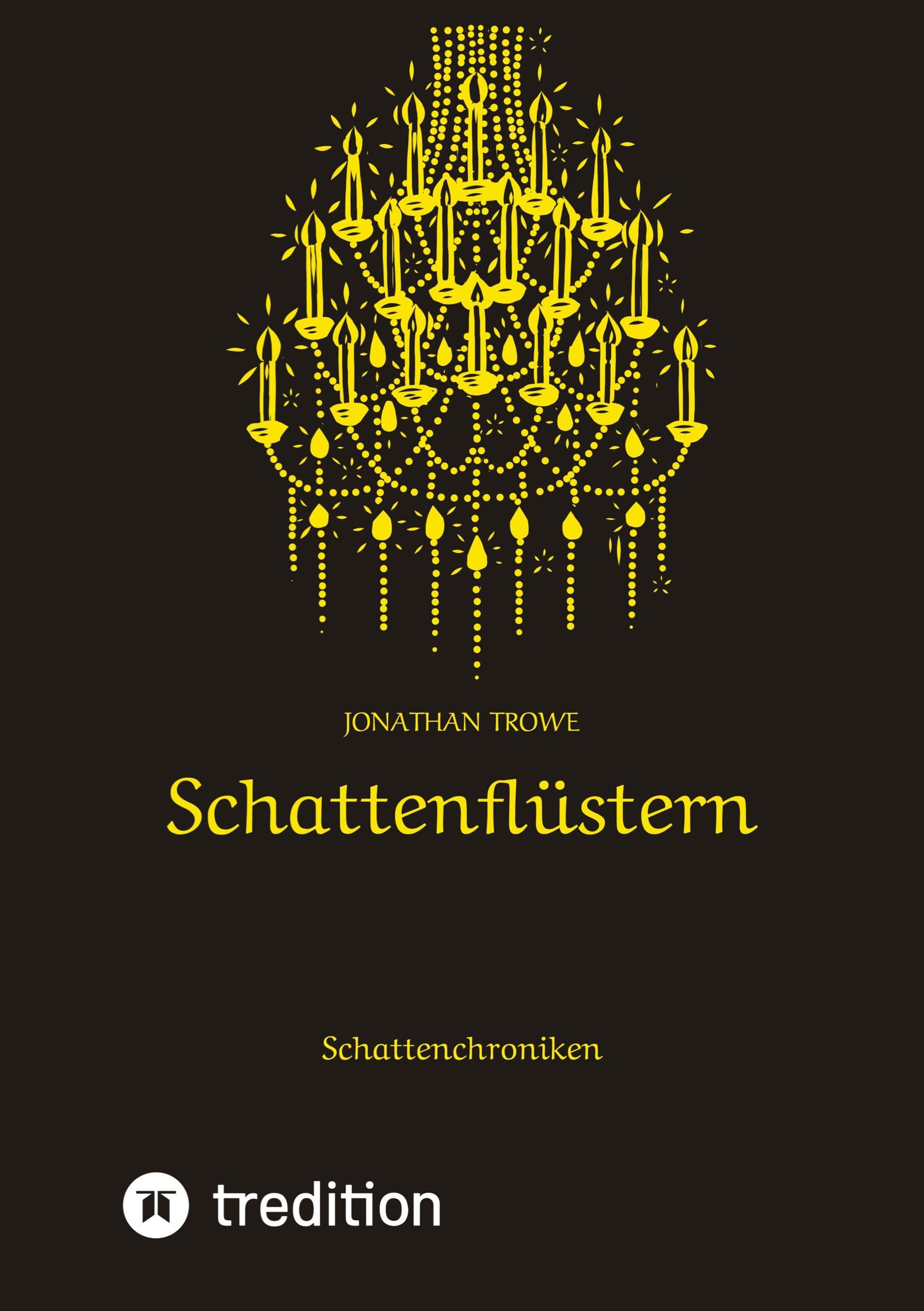 "Jonathan Trove: Schattenflüstern. Schattenchroniken." Gelbe Illustration eines Kronleuchters auf schwarzem Hintergrund. Logo unten., Buch