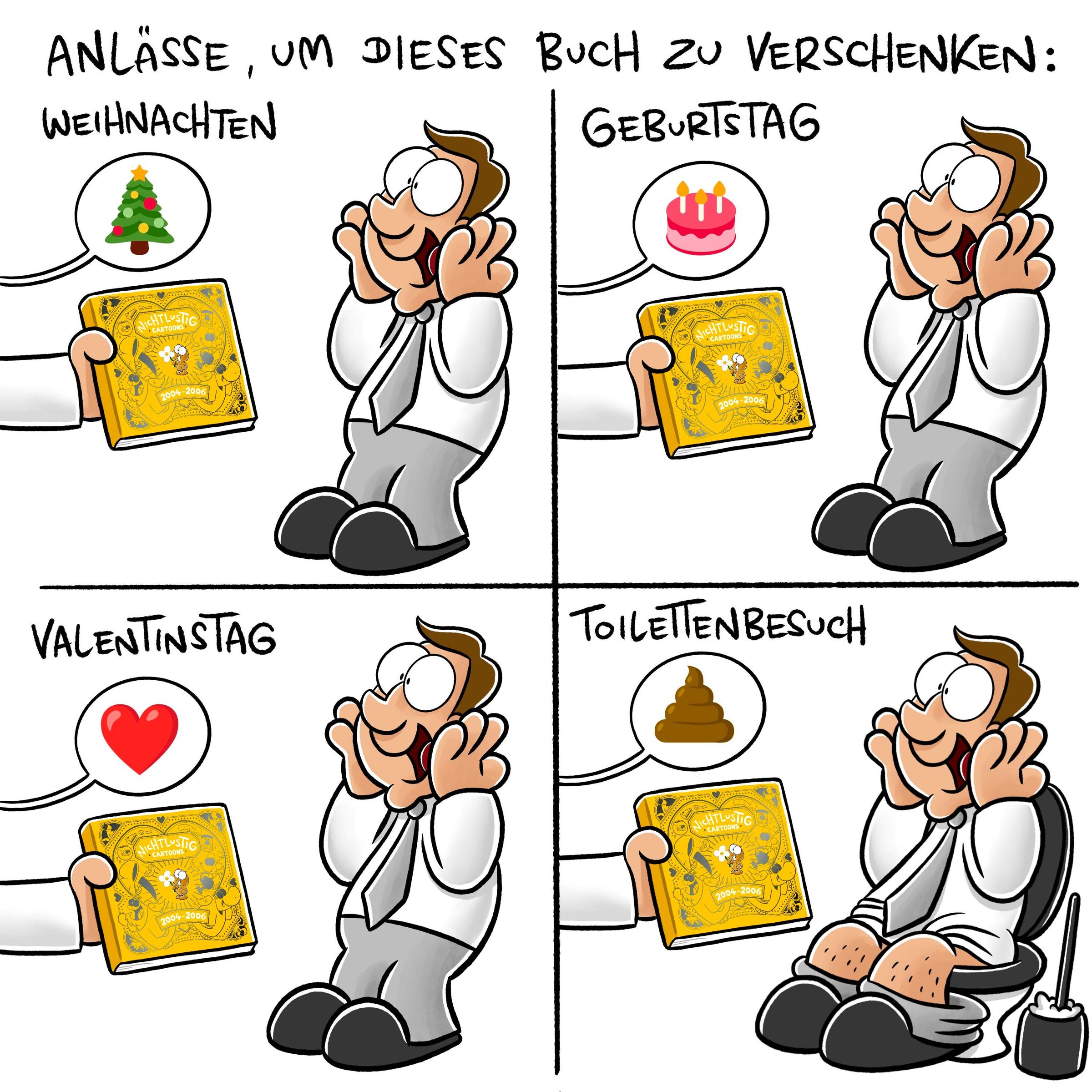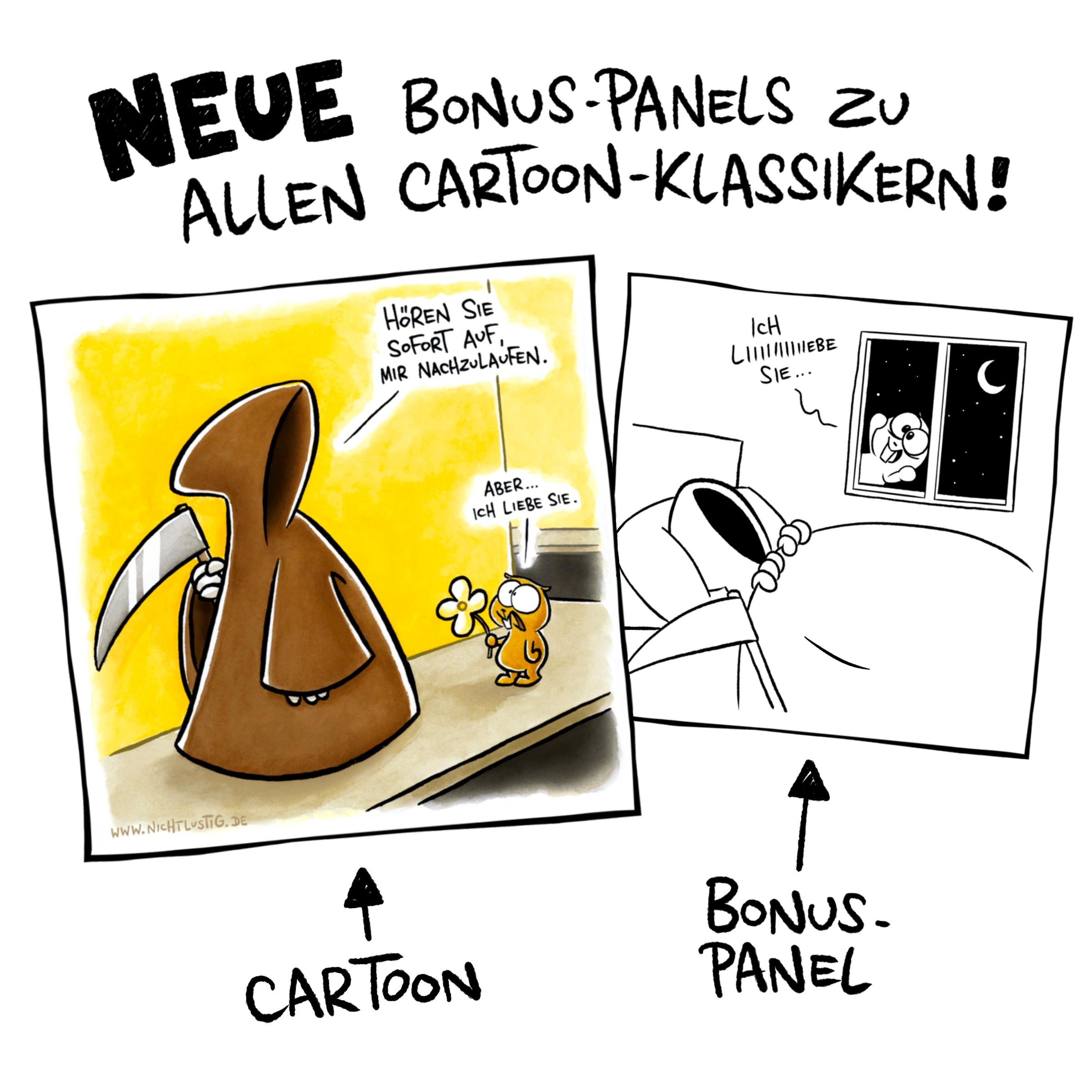 Joscha Sauer hat ausserdem für ALLE Cartoons in diesem Buch zusätzliche Bonus-Panels gezeichnet, also eine kleine Fortsetzung mit extra Lacher für jeden Cartoon. So können auch NICHTLUSTIG-Fans der ersten Stunde die Cartoon-Klassiker noch mal ganz neu entdecken.