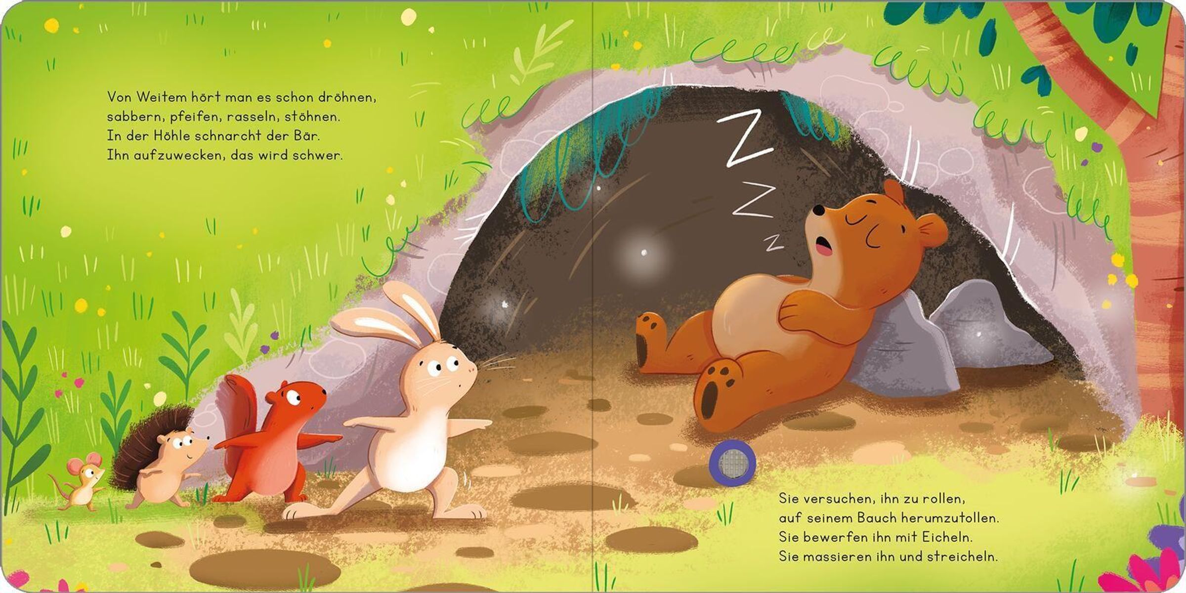 In diesem kunterbunten Pappbilderbuch wird eine lustige Geschichte rund um das Frühlingserwachen der Tiere erzählt und dem Bären, der den Frühling fast verschläft. Die perfekte Kombination aus witzig gereimter Geschichte und abwechslungsreichen Sounds. Beim Drücken auf die Soundpunkte werden insgesamt 5 Geräusche ausgelöst. Den Abschluss bildet ein Frühlingslied zum Anhören und Mitsummen. So wird der Frühling für jedes Kind zu einem absoluten Highlight! Das liebevoll gestaltete Soundbuch eignet sich für Kleinkinder ab 18 Monaten.