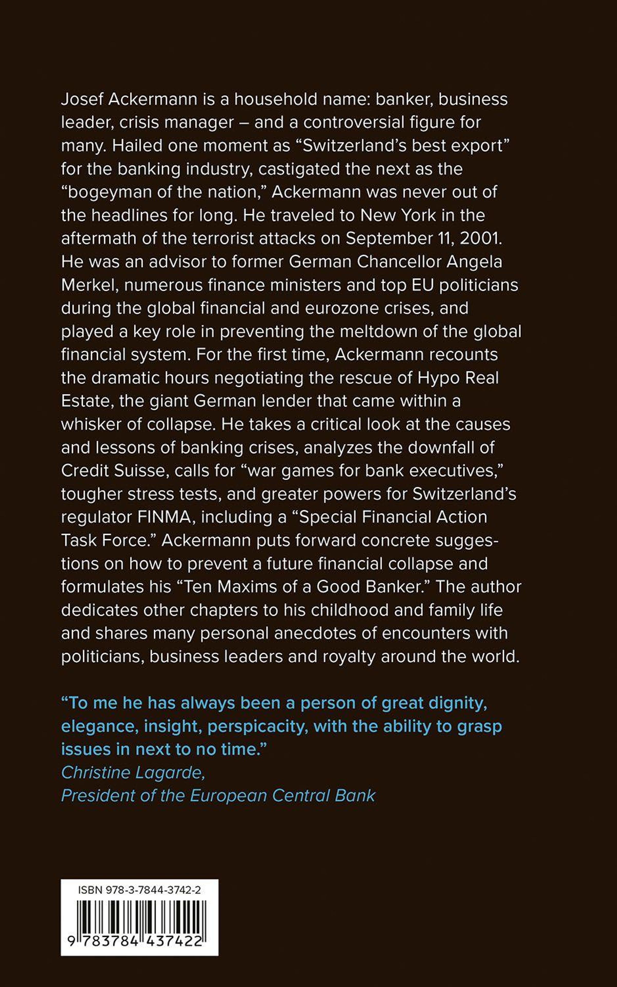 Josef Ackermann is a household name: banker, business leader, crisis manager - and a controversial figure for many. Hailed one moment as "Switzerland's best export" for the banking industry, castigated the next as the "bogeyman of the nation," Ackermann was never out of the headlines for long. He traveled to New York in the aftermath of the terrorist attacks on September 11, 2001. He was an advisor to former German Chancellor Angela Merkel, numerous finance ministers and top EU politicians during the global financial and eurozone crises, and played a key role in preventing the meltdown of the global financial system. For the first time, Ackermann recounts the dramatic hours negotiating the rescue of Hypo Real Estate, the giant German lender that came within a whisker of collapse. He takes a critical look at the causes and lessons of banking crises, analyzes the downfall of Credit Suisse, calls for "war games for bank executives," tougher stress tests, and greater powers for Switzerland's regulator FINMA, including a "Special Financial Action Task Force." Ackermann puts forward concrete suggestions on how to prevent a future financial collapse and formulates his "Ten Maxims of a Good Banker." The author dedicates other chapters to his childhood and family life and shares many personal anecdotes of encounters with politicians, business leaders and royalty around the world.
