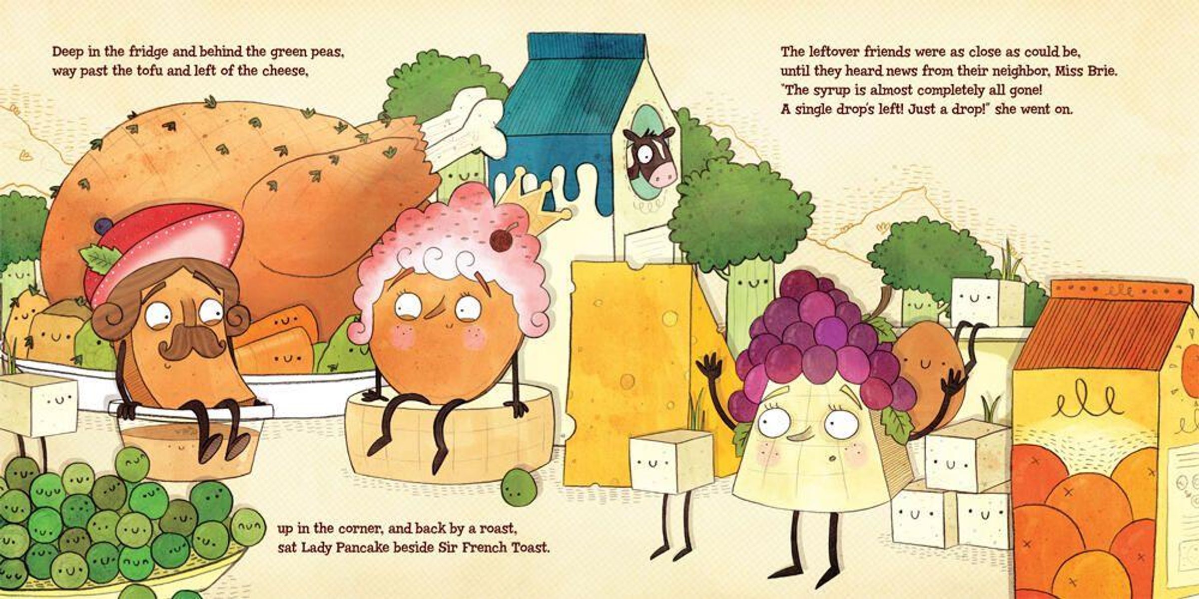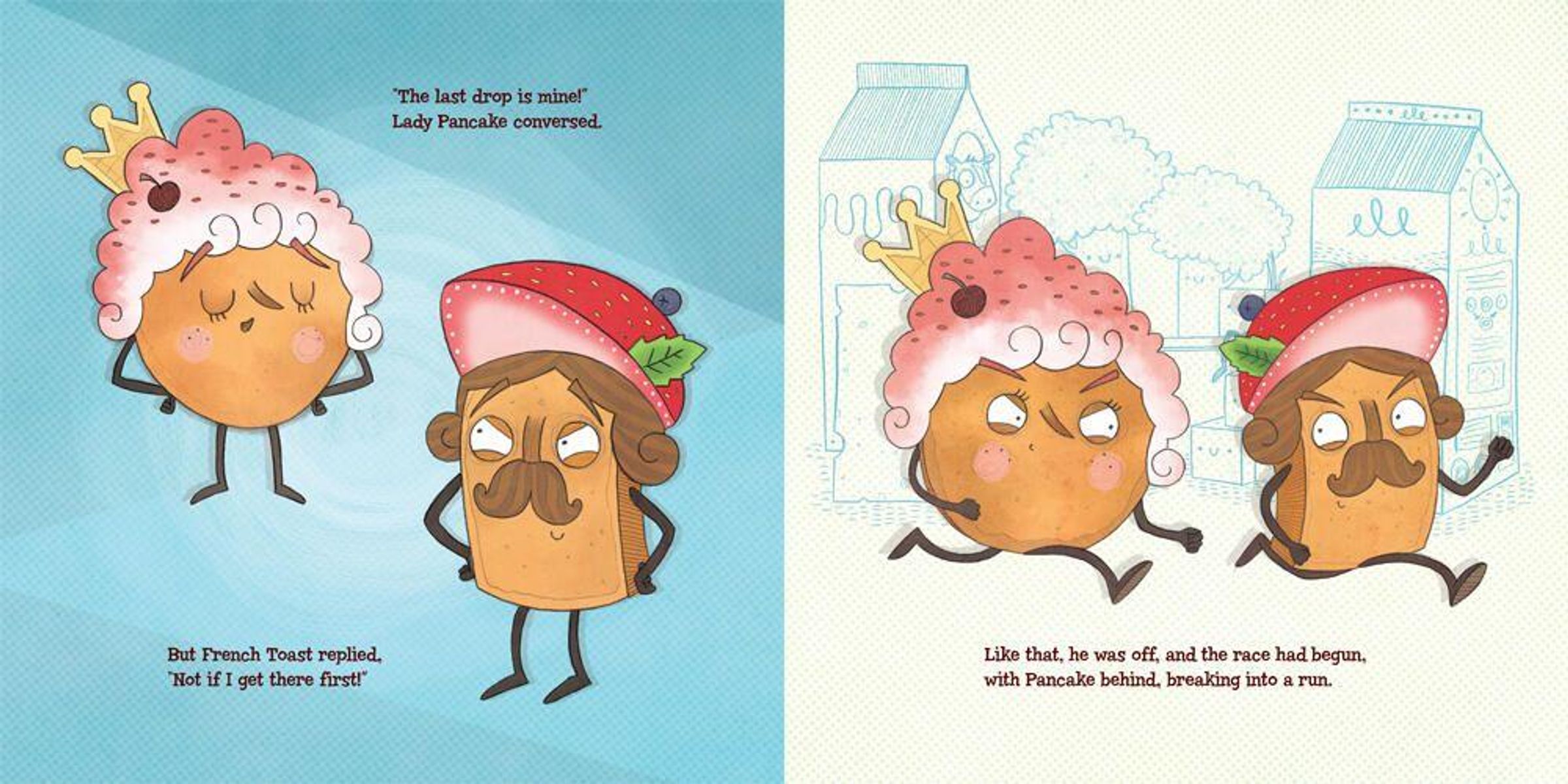 Lady Pancake and Sir French Toast have a beautiful friendship---until they discover that there's only one drop of maple syrup left! The race is ON! Off they go, racing past the Orange Juice Fountain, skiing through Sauerkraut Peak, and reeling down the linguini.