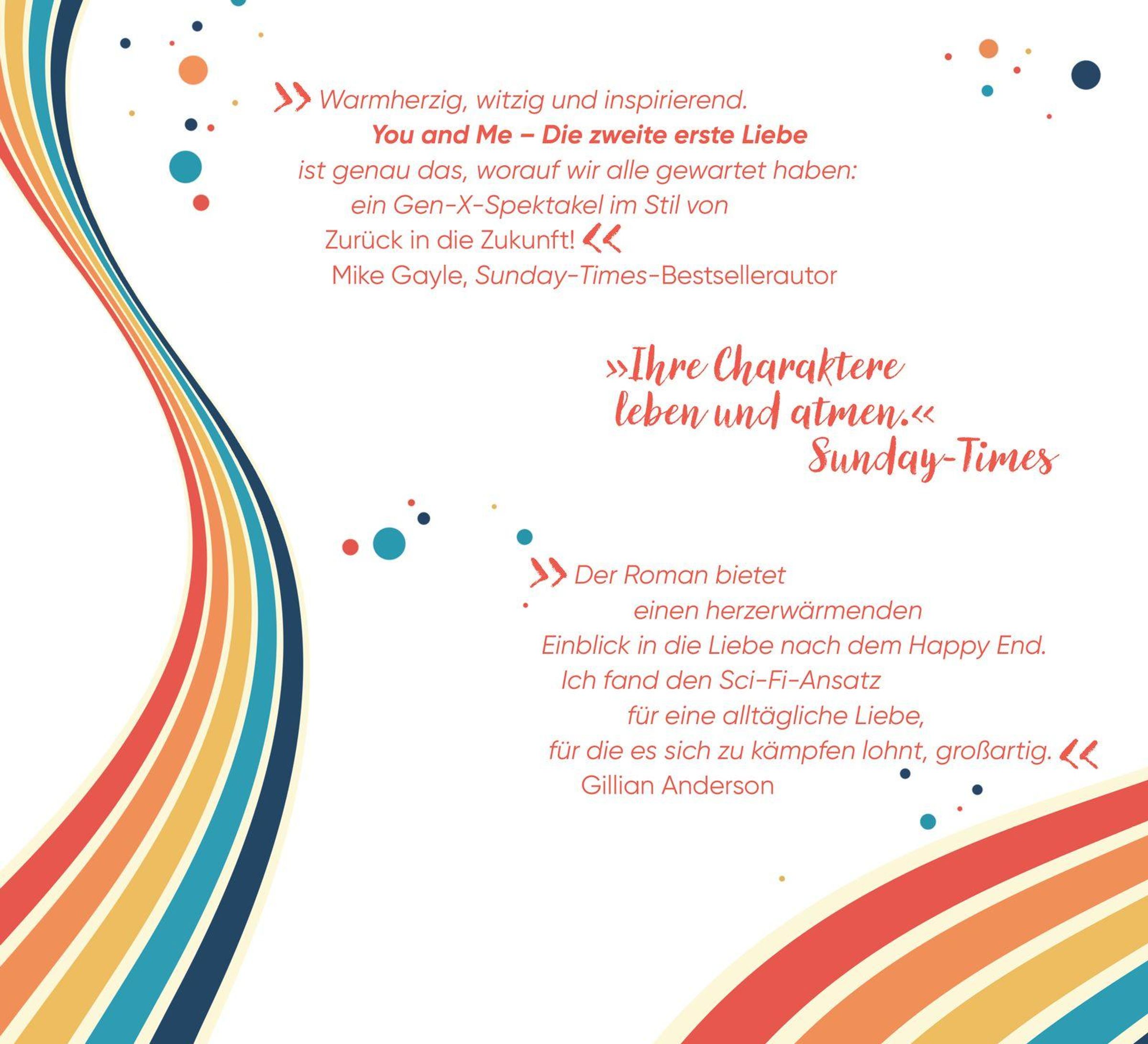 'You and Me - Die zweite erste Liebe bietet einen herzerwärmenden Einblick in die Liebe nach dem Happy End. Ich fand den Sci-Fi-Ansatz für eine alltägliche Liebe, für die es sich zu kämpfen lohnt, großartig.' Gillian Anderson
