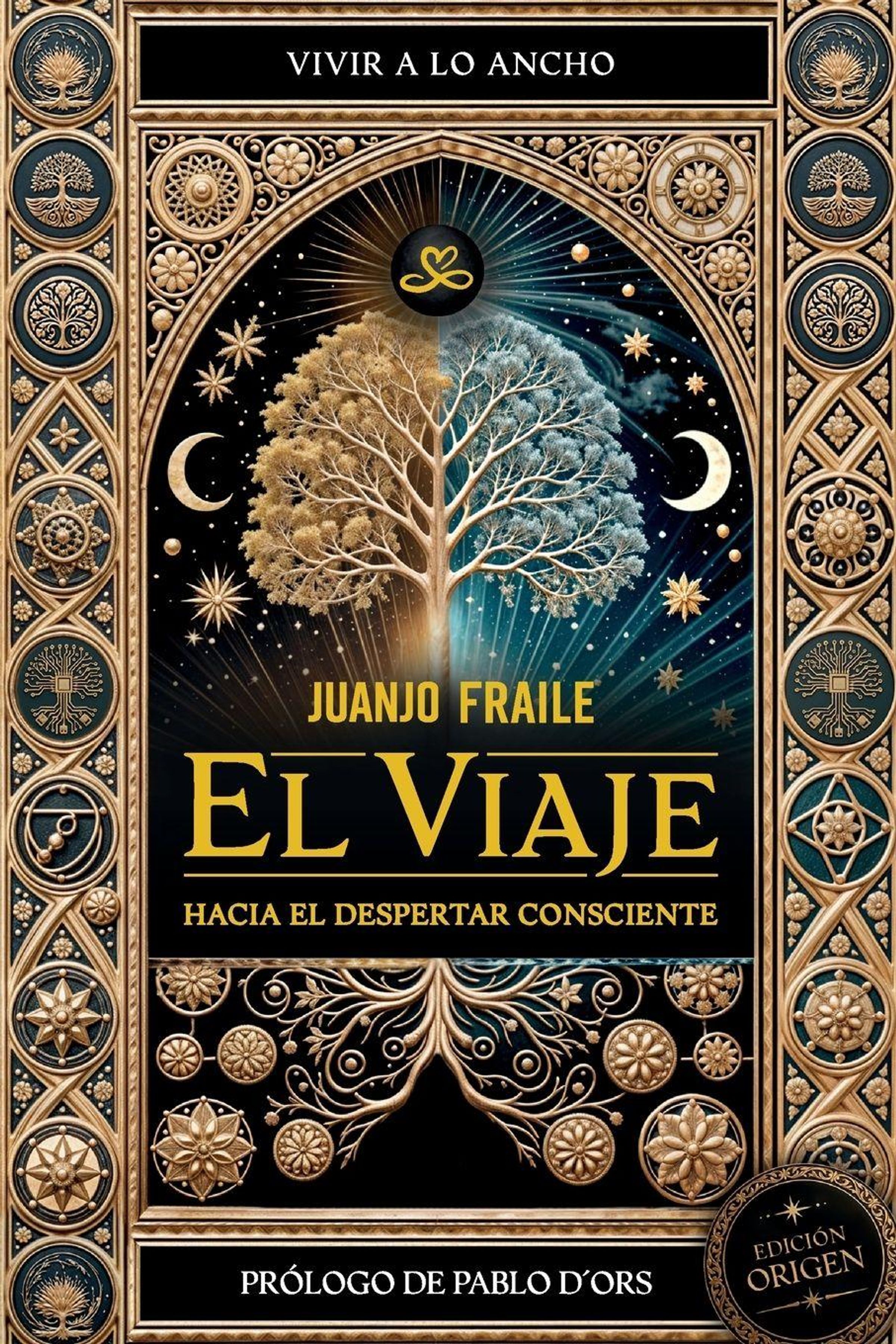 "VIVIR A LO ANCHO", "JUANJO FRAILE", "EL VIAJE", "HACIA EL DESPERTAR CONSCIENTE". Baum im Zentrum, symbolische Verzierungen., Buch