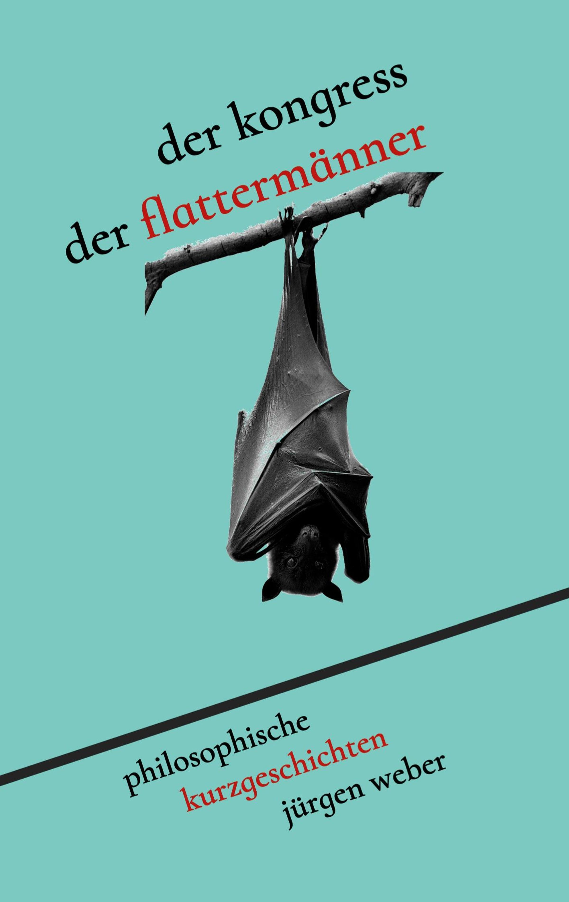 Text: "der kongress der flattermänner, philosophische kurzgeschichten, jürgen weber." Eine Fledermaus hängt kopfüber an einem Ast., Buch