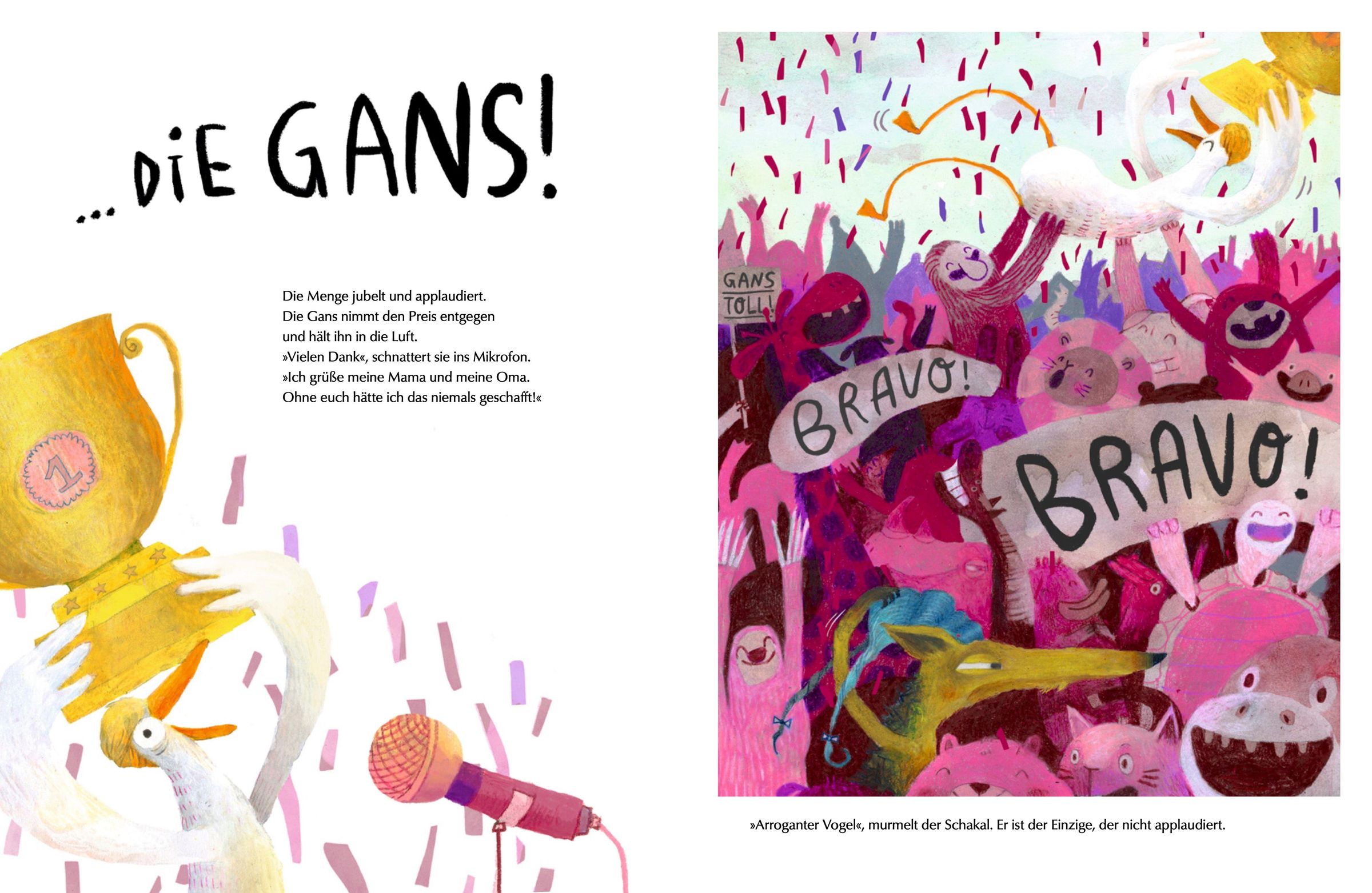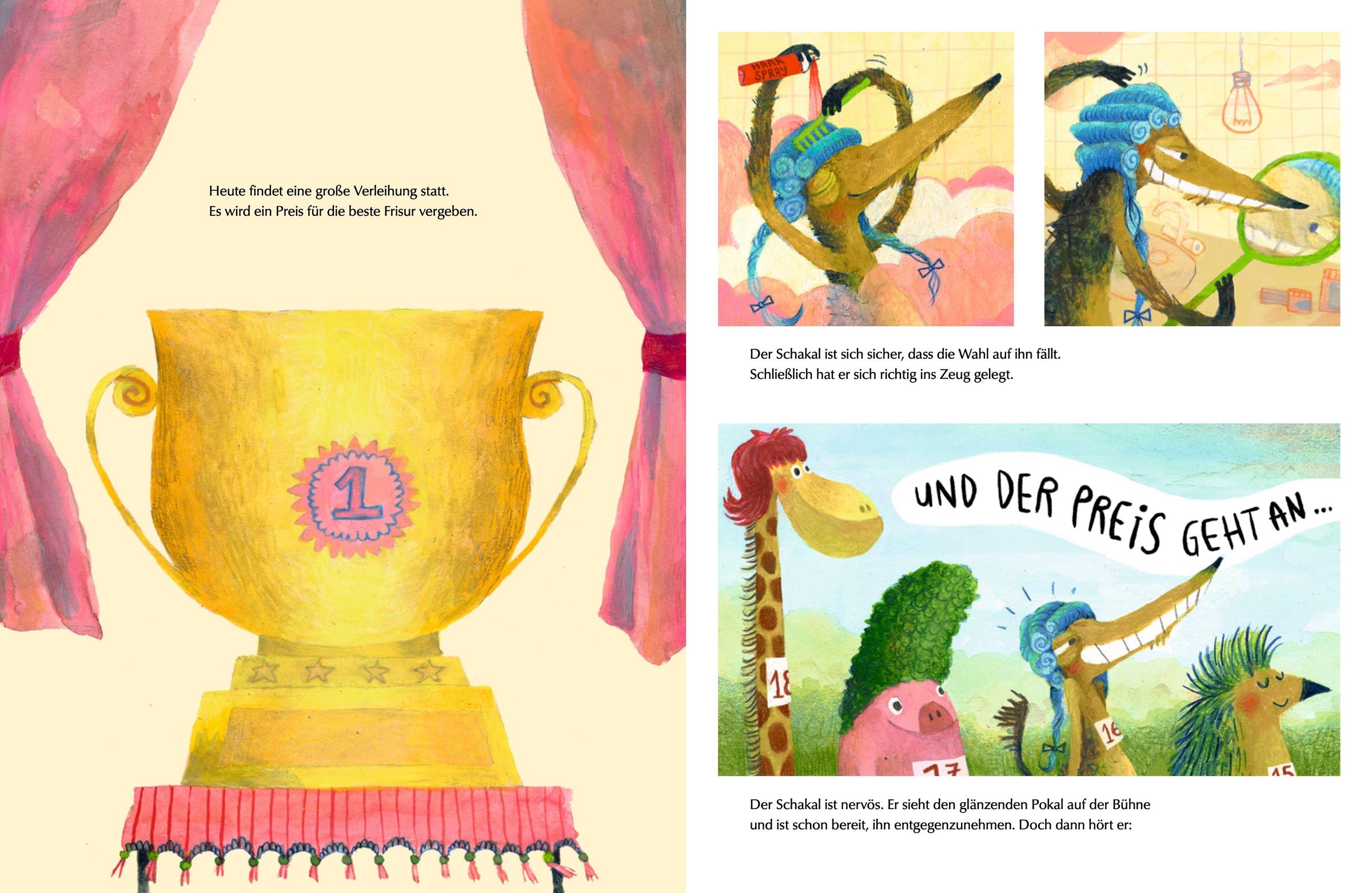 Der Schakal träumt von einem Pokal. Nur blöd, räumt die Gans den Preis für die schönste Frisur ab. Kurzerhand veranstaltet der Schakal eine neue Preisverleihung mit der Auszeichnung für 'den besten Schakal', die er natürlich gewinnt. Kein Wunder, dass sich nun ein Tier nach dem anderen seinen eigenen Preis verleiht! Das passt dem Schakal gar nicht, denn er verdient doch die größte aller Auszeichnungen...