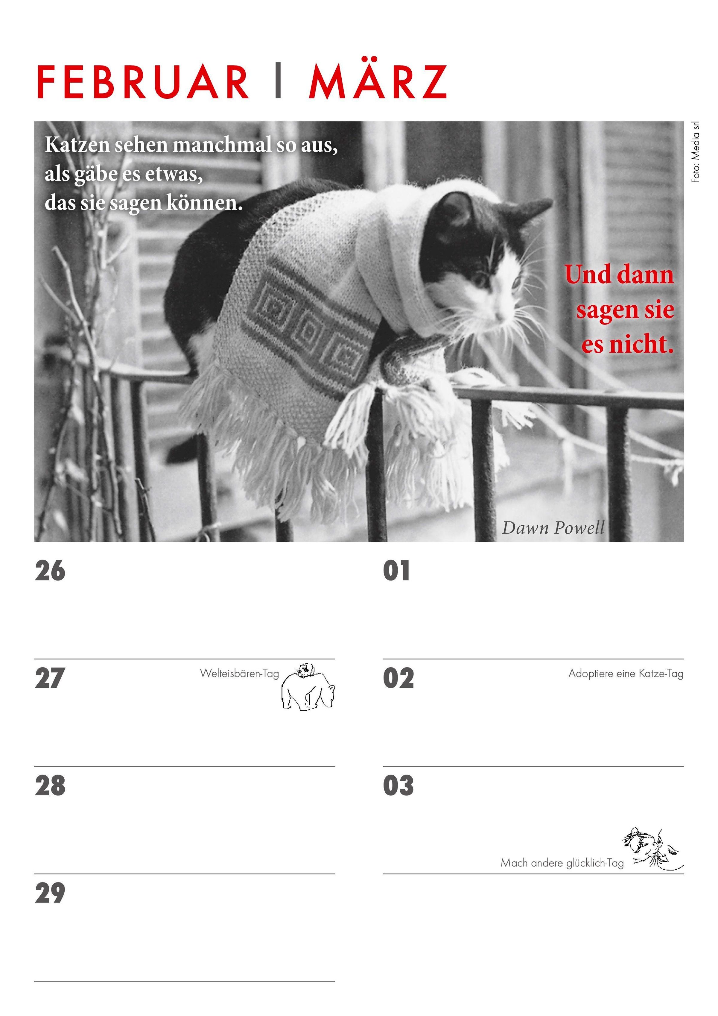 Der immerwährende Geburtstagskalender erscheint auf vielfachen Wunsch und ist der ideale jahresunabhängige Begleiter des großen Katzenkalenders. Das Kalendarium bietet ausreichend Freiraum zum Notieren von Geburtstagen aller Familienmitglieder und Freunde. So mu¿ssen sie nicht von einem Jahr aufs nächste U¿bertragen werden.