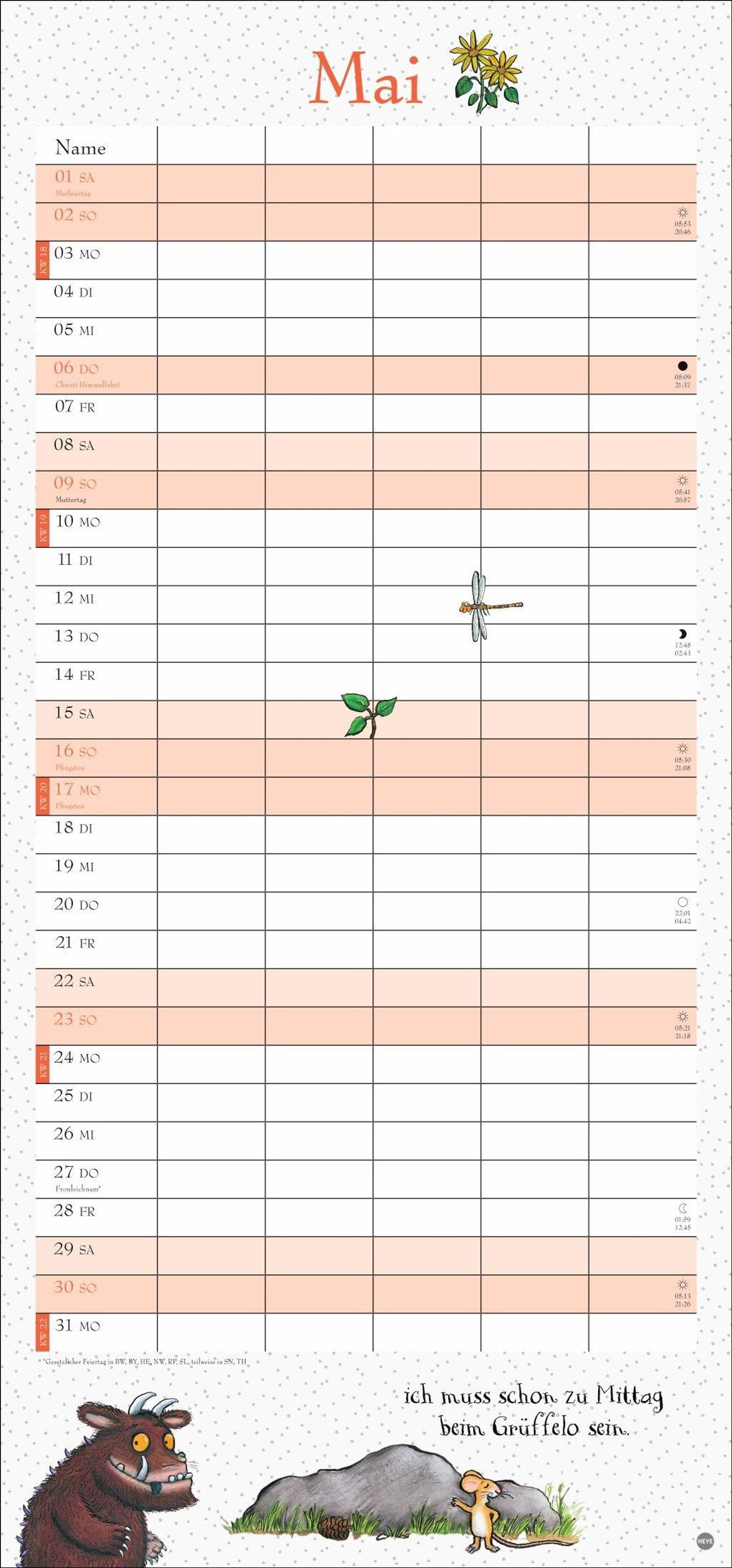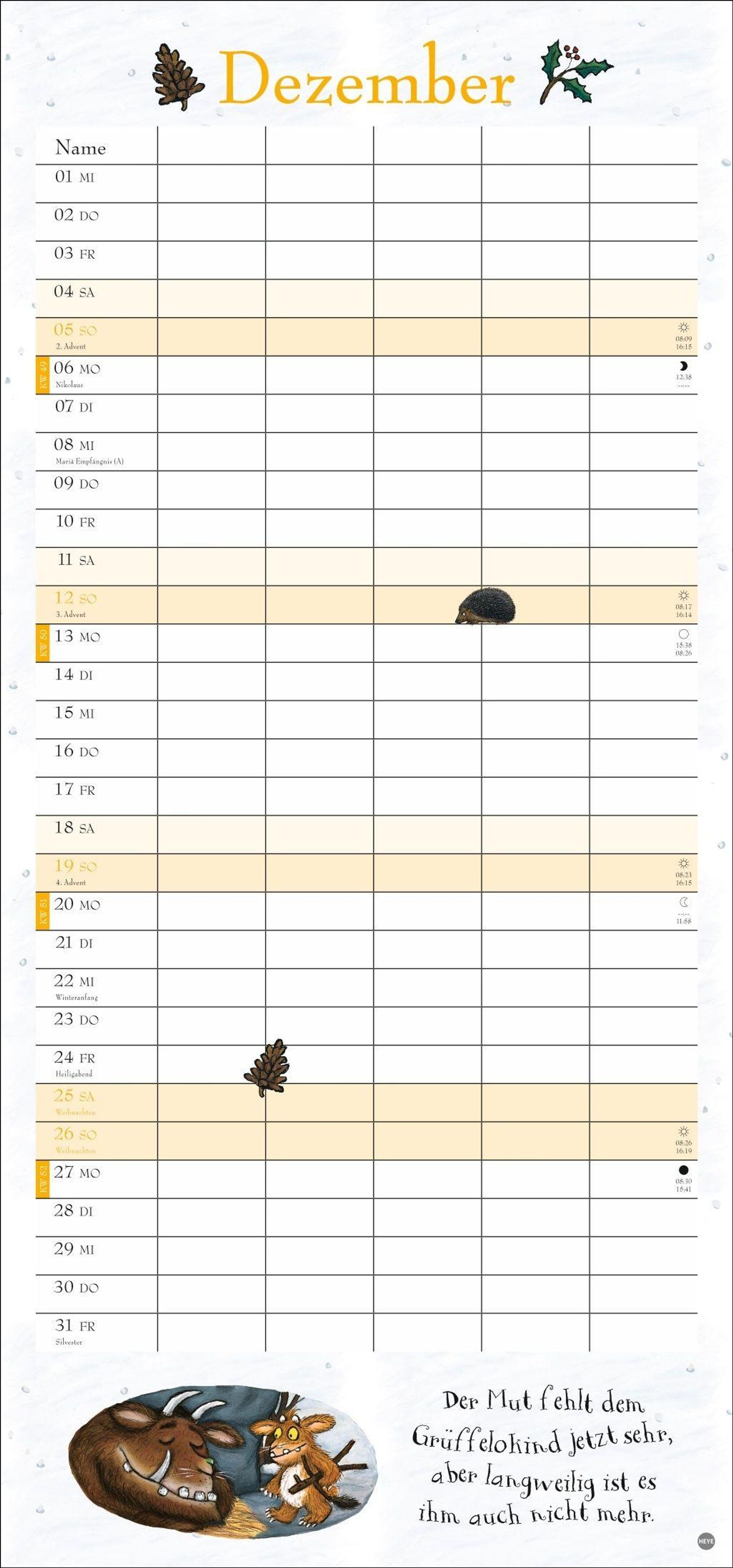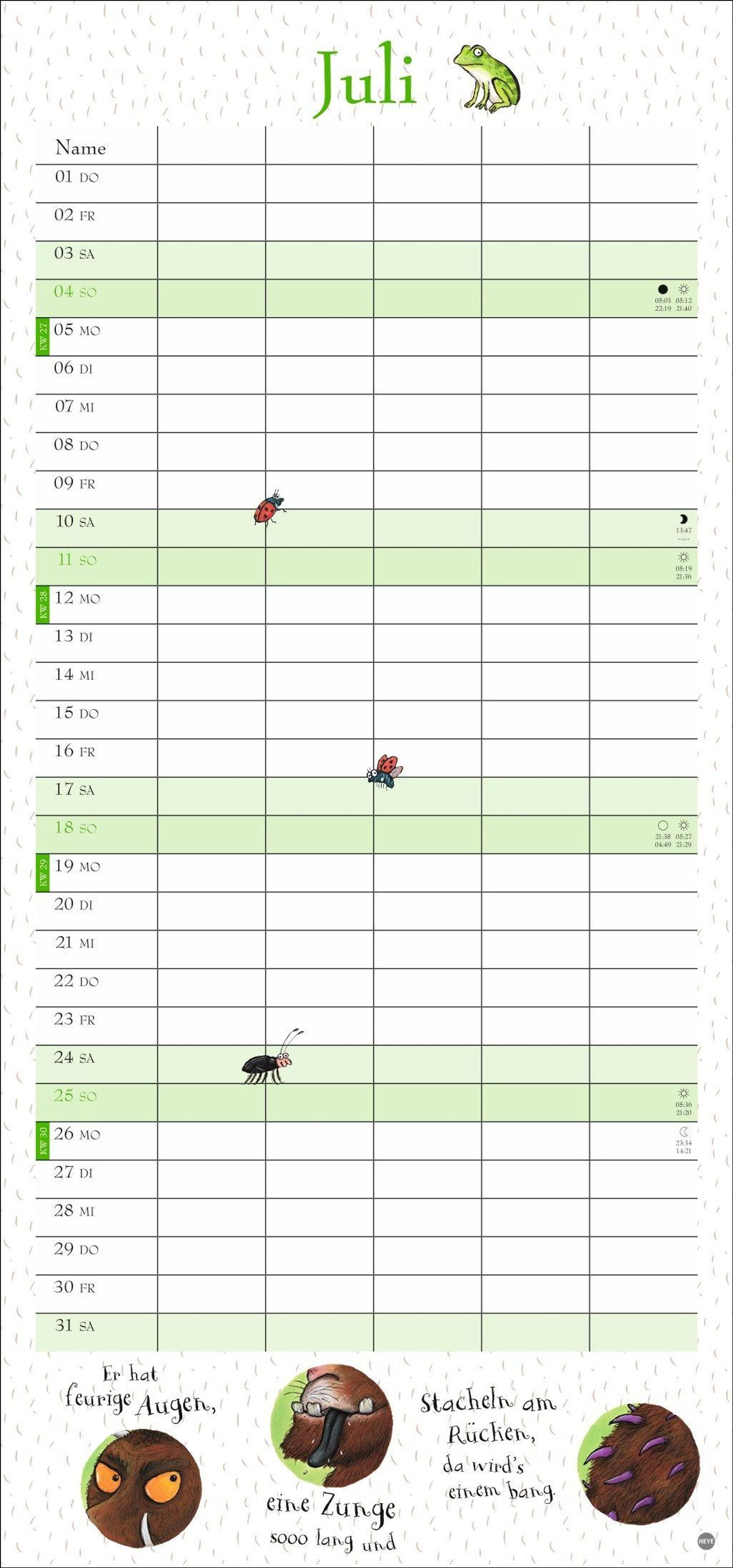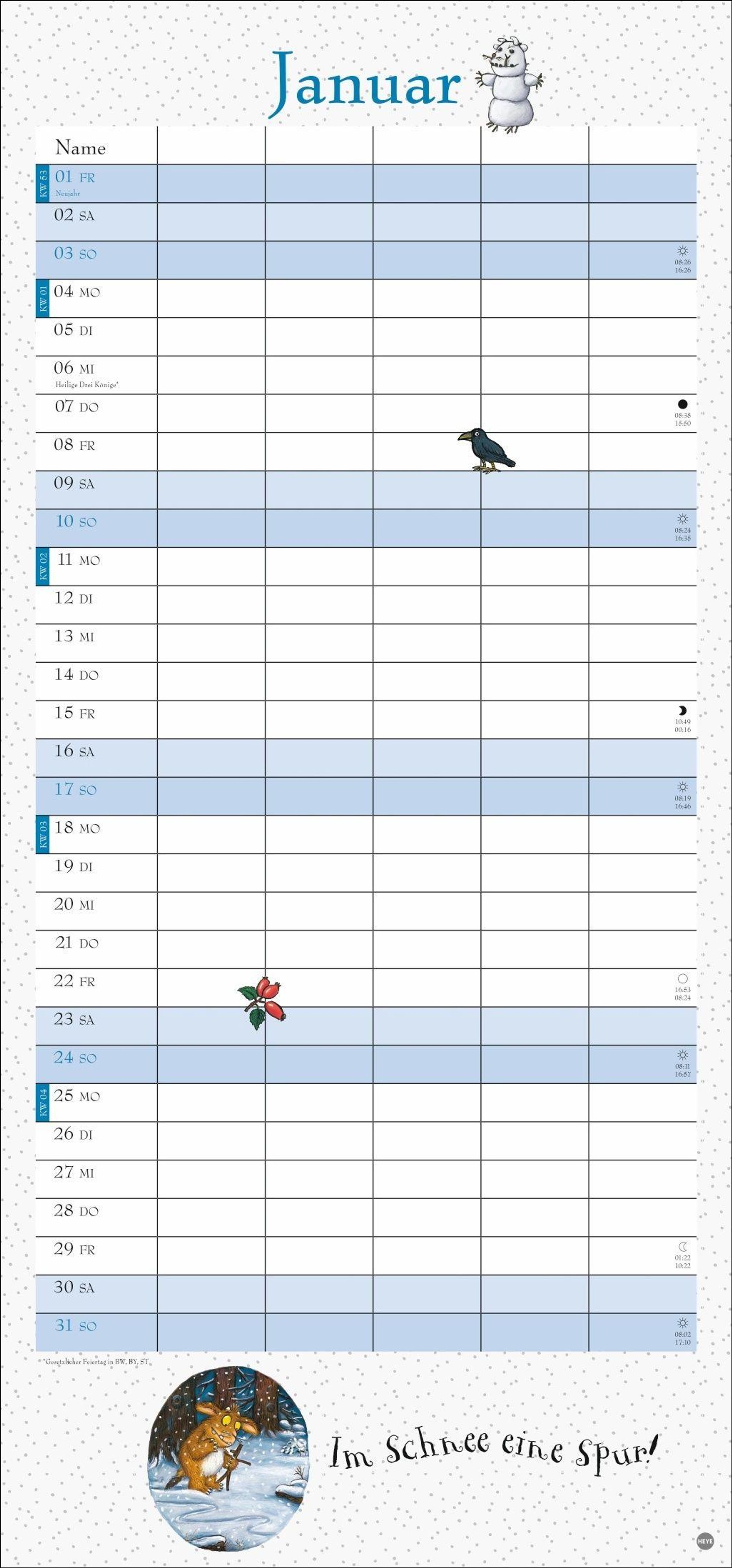 - Witziger Kalender mit den bekannten Figuren aus dem Kinderbuch-Klassiker. Hochkant-Format: Langer Kalender mit 5 Spalten für Übersicht und Planung.