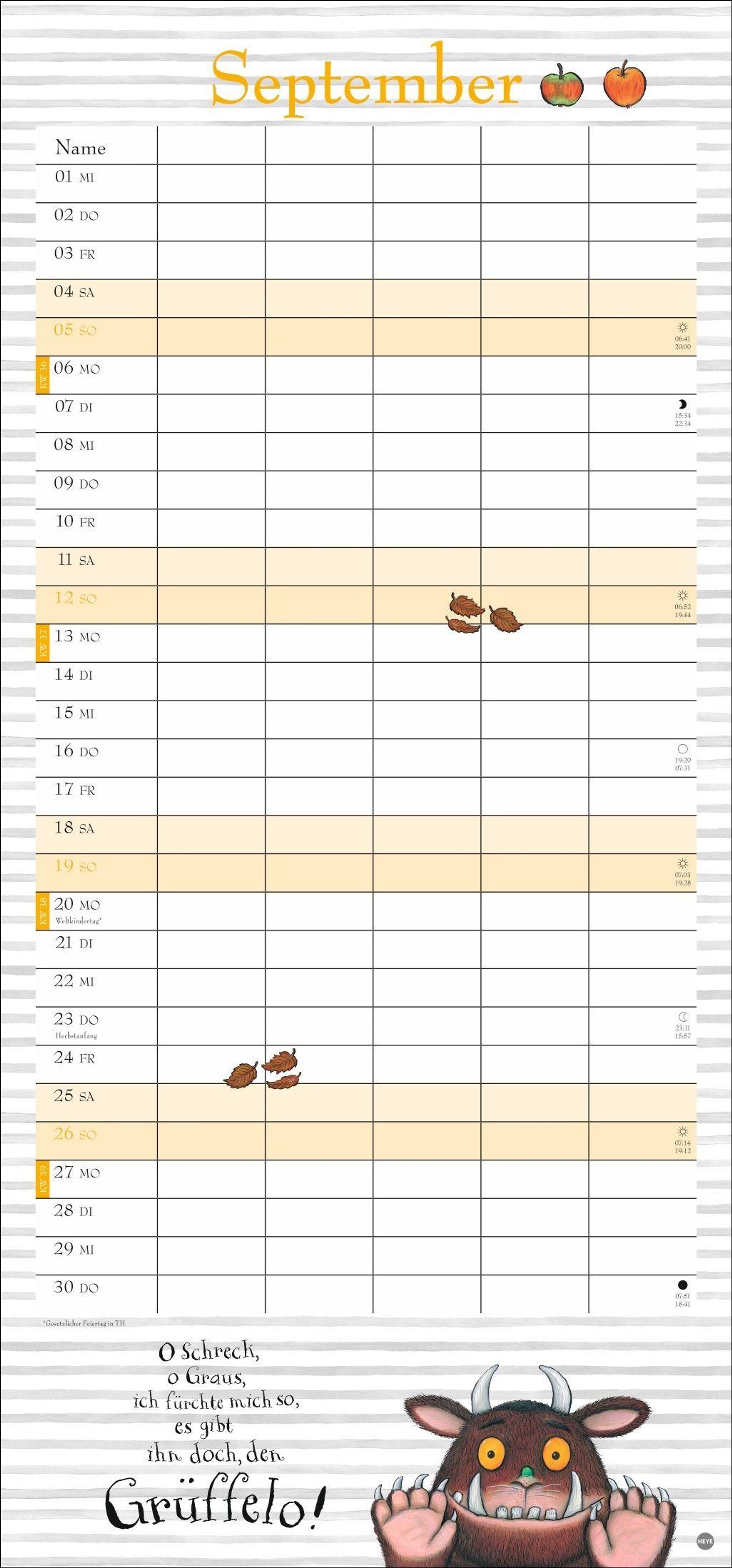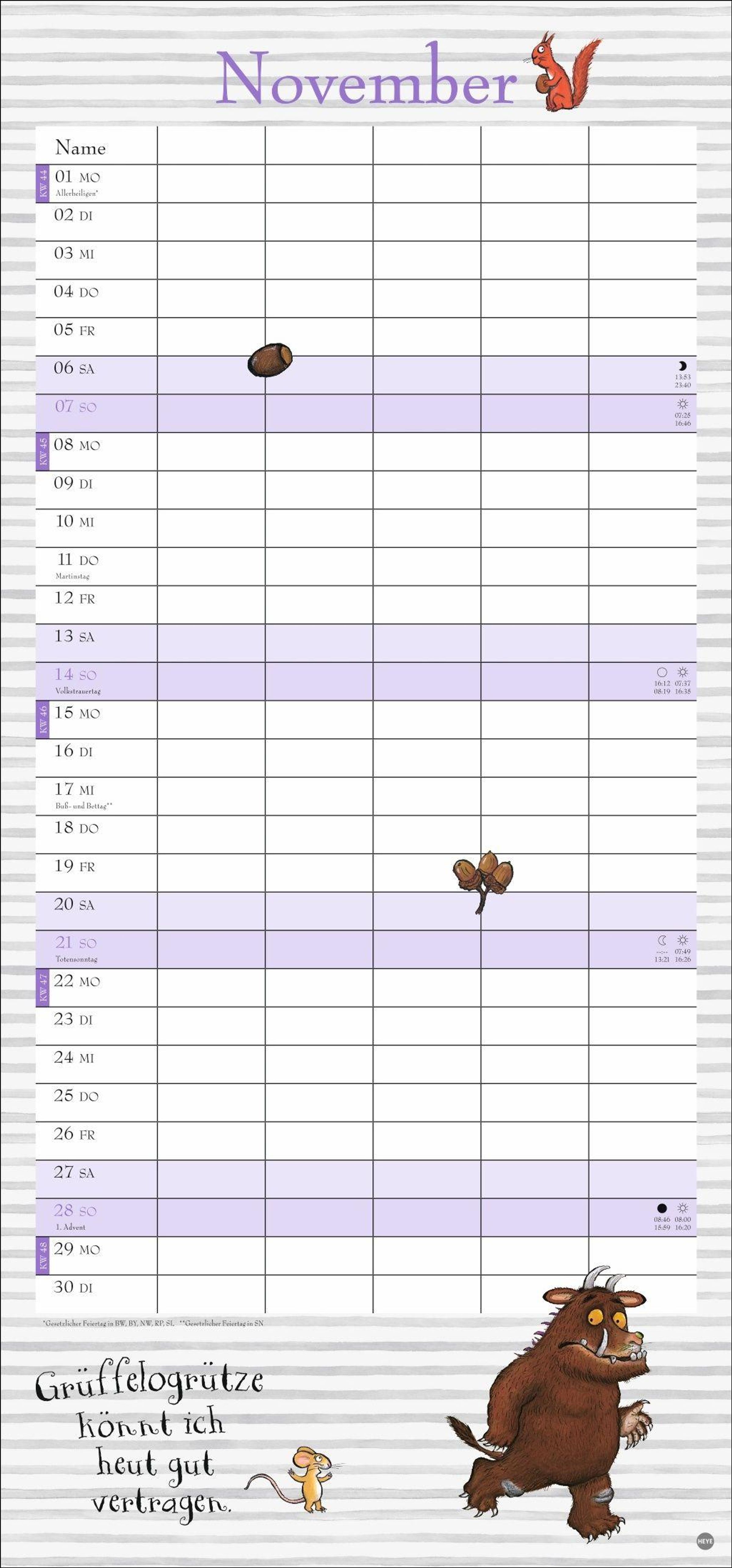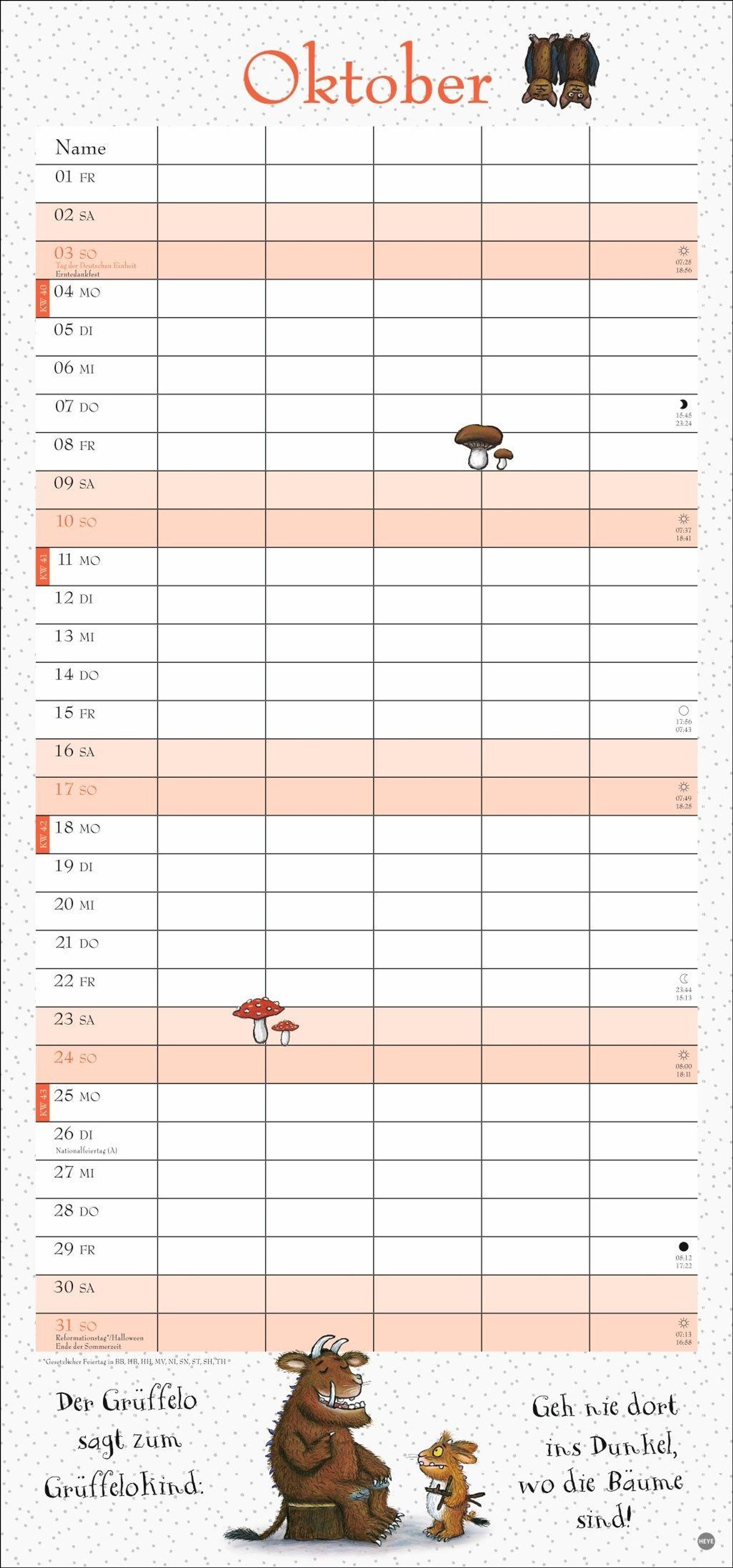 Das ideale Geschenk für alle kleinen Mäuse und ihre Eltern: Der Grüffelo-Familienkalender mit 5 Spalten und 3-Monatsvorschau aufs Folgejahr