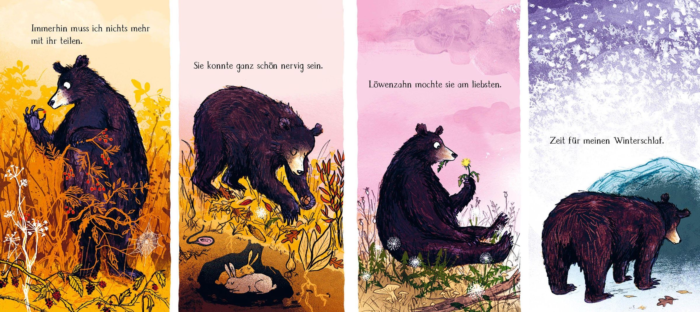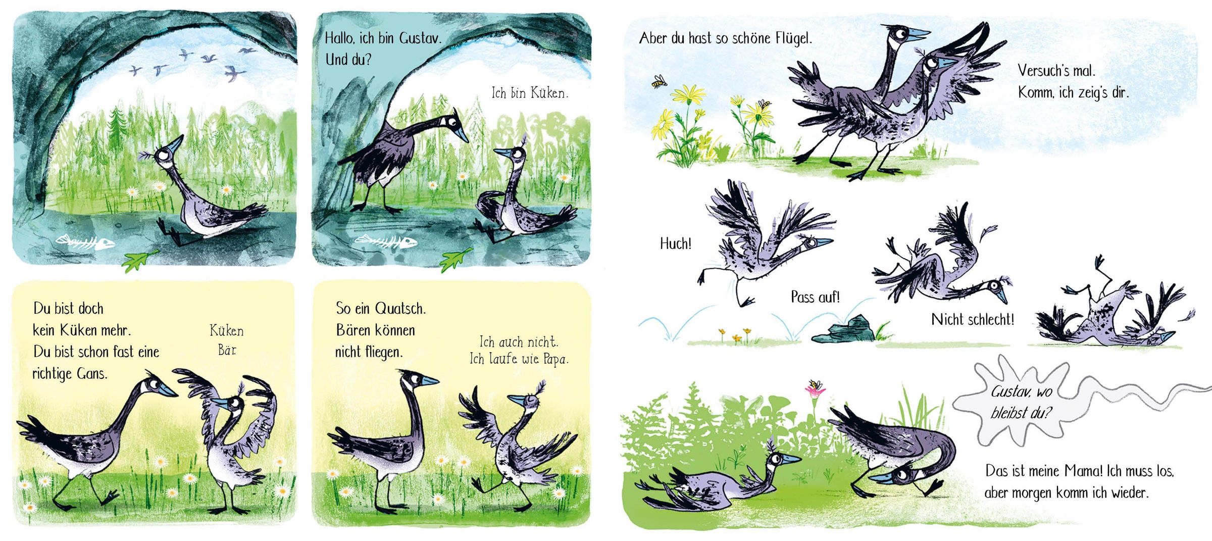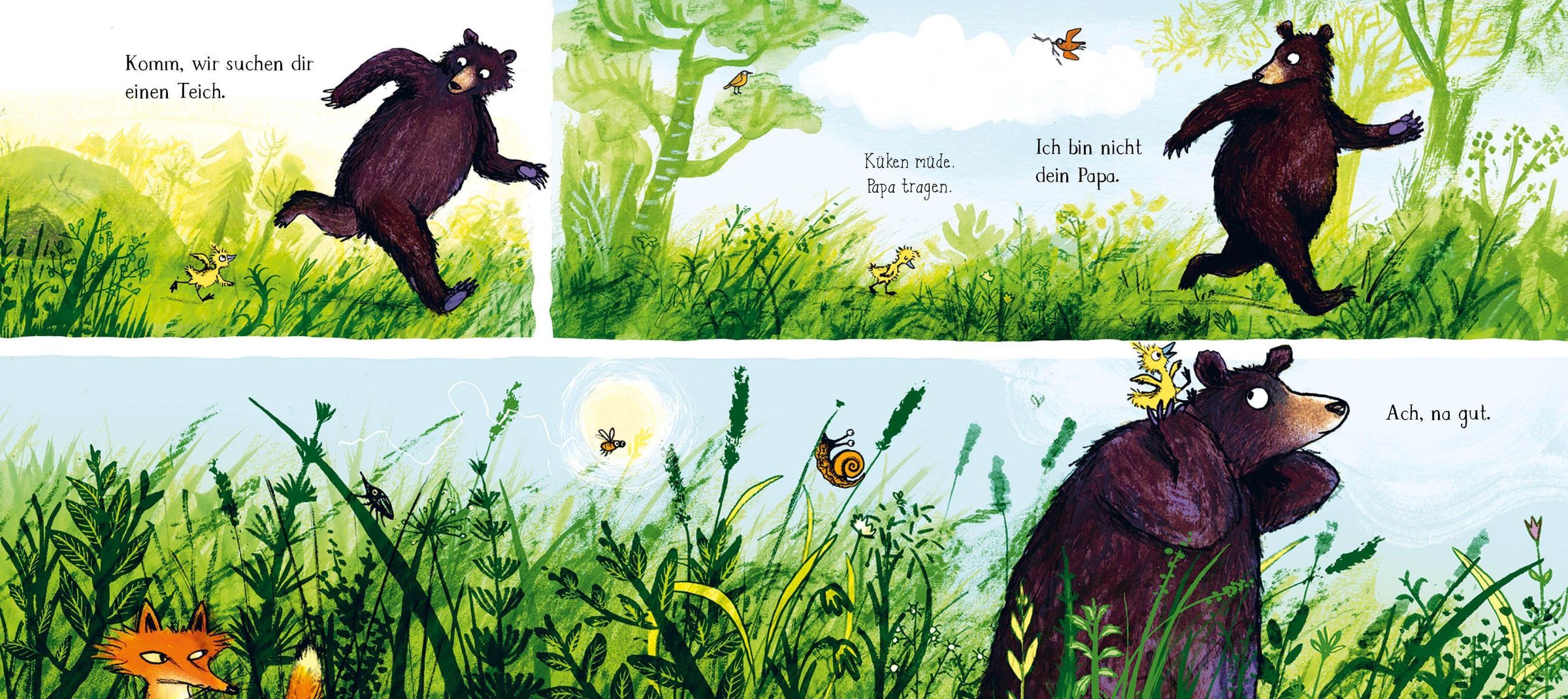 Als der Bär hungrig aus seinem Winterschlaf aufwacht, findet er eine frisch geschlüpfte Gans: Küken kürt ihn kurzerhand zu ihrem Papa, folgt ihm überall hin und macht ihm alles nach. Honig verklebt ihr zwar die Flügel, schmeckt aber fantastisch. Und in der Bärenhöhle schläft es sich wunderbar. Wenn nicht der Bär immer so brummelig und abweisend wäre. Mit der Zeit fügt er sich immer mehr in seine neue Rolle und kümmert sich um das kleine Gänslein. Bis der Herbst kommt und die Gans flügge wird. Erst als sie sich dem großen Gänseschwarm anschließt und in den Süden fliegt, begreift der Bär, was es wirklich bedeutet, Vater zu sein - gut, dass sie sich im Frühjahr wiedersehen.