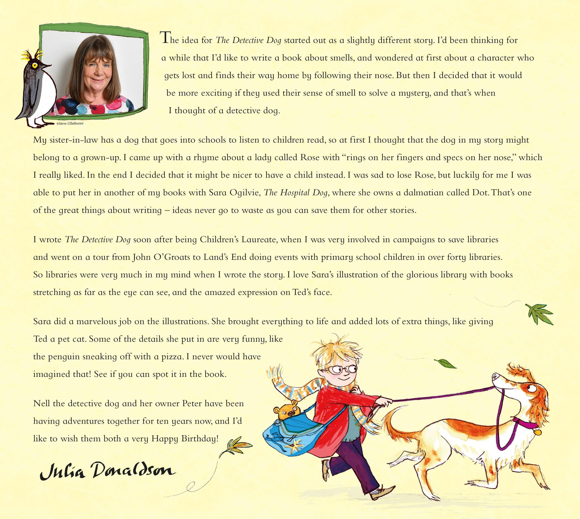 Written by Julia Donaldson, author of The Gruffalo , and illustrated by the multi-talented illustrator Sara Ogilvie, The Detective Dog 10th Anniversary Edition has a shiny gold foiled cover and includes a letter from the author and a sneak peek inside the illustrator's sketchbook.