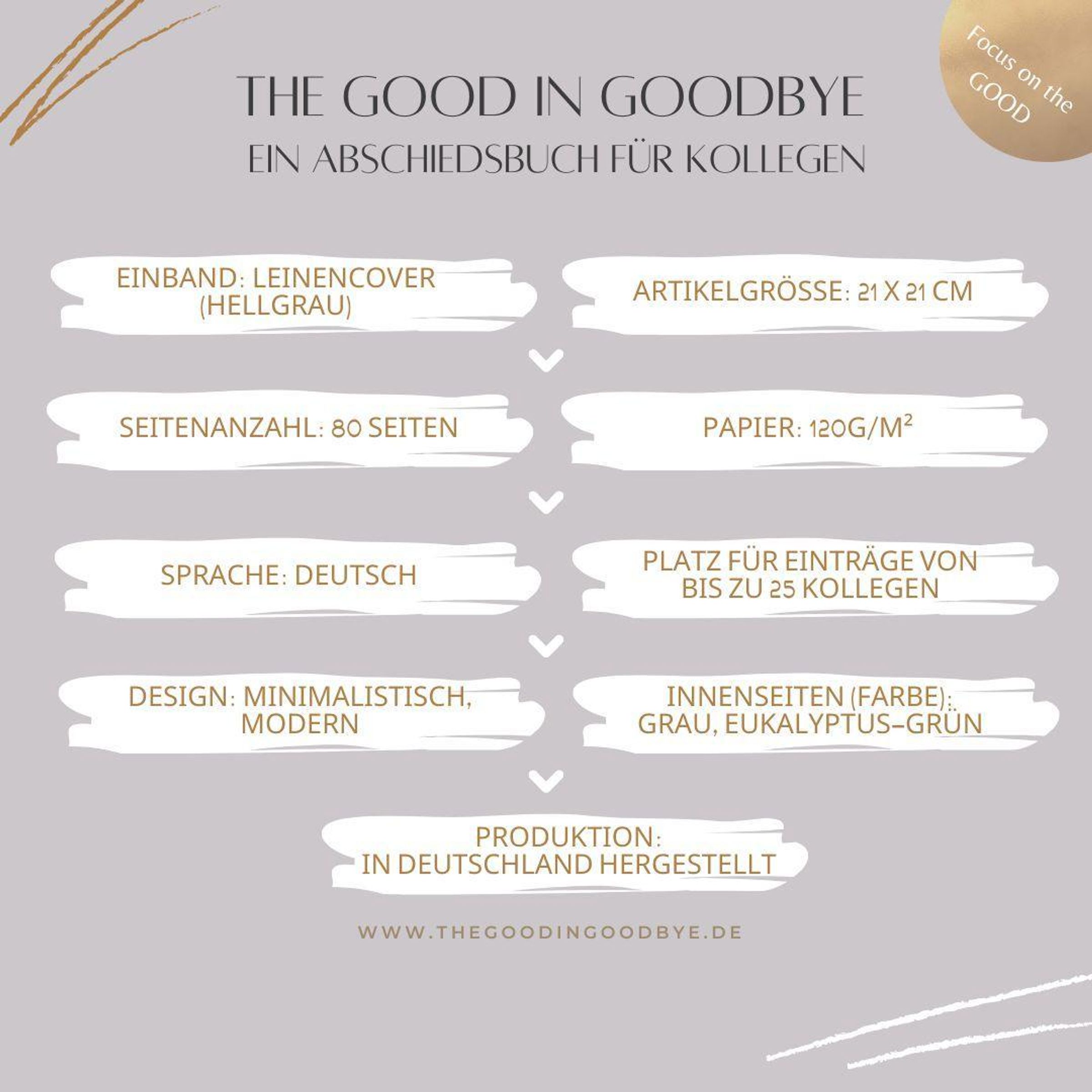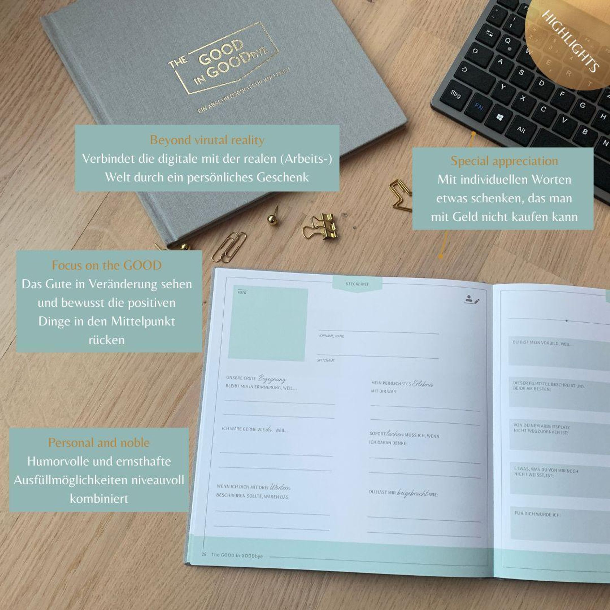 The GOOD in GOODbye ist ein Abschiedsbuch für Kollegen. Ob Jobwechsel, Rente, Ausstand, Sabbatical, Elternzeit oder Jubiläum, eine persönliche und kreative Sammlung individueller Erinnerungen macht aus jedem Abschied etwas Einmaliges.