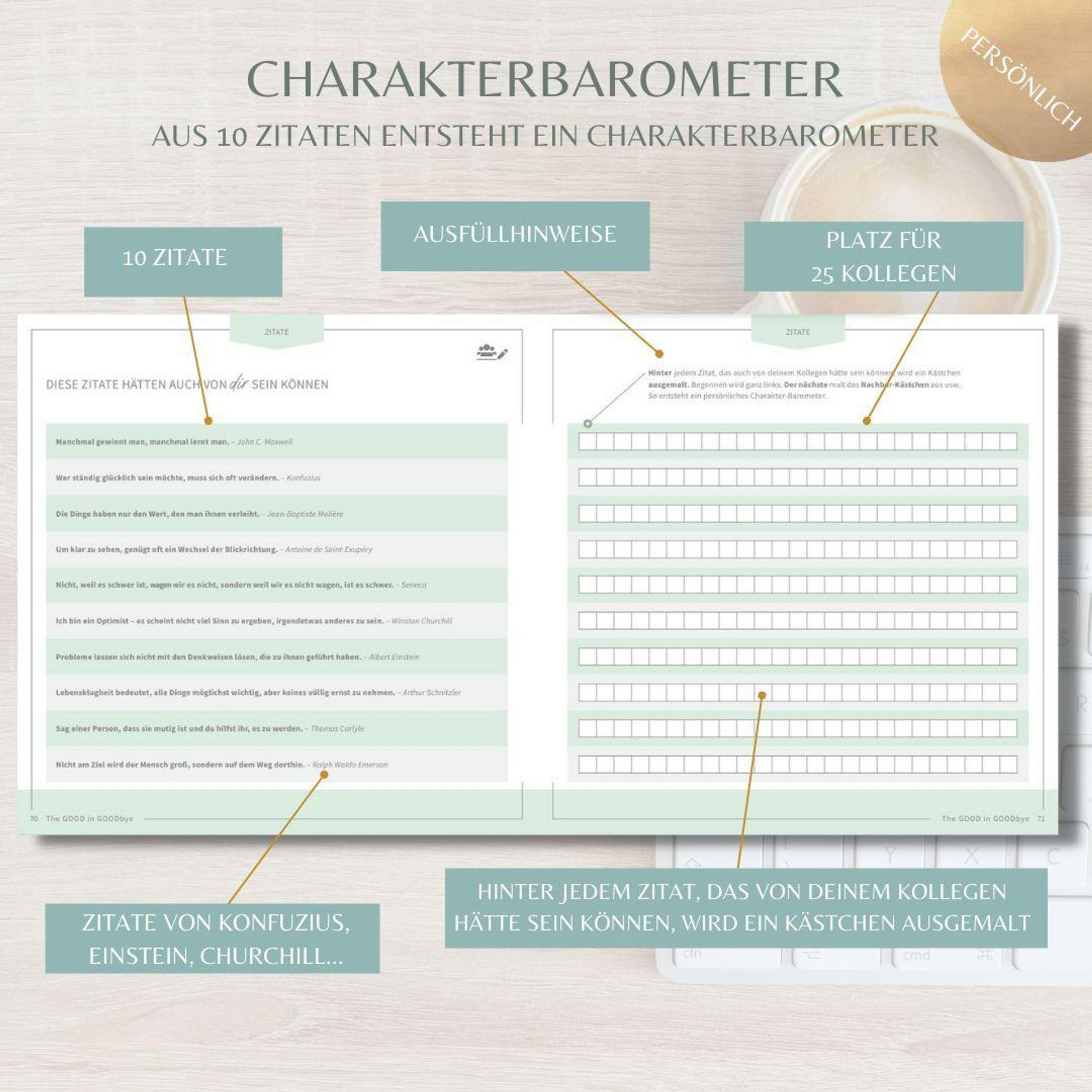 Dabei wird bewusst der Fokus auf das Gute gelegt: schöne Erinnerungen, tolle Erlebnisse und das Gute an Veränderung. Das Buch eignet sich durch seine hochwertige und geschmackvolle Gestaltung als wertschätzendes (Abschieds-) Geschenk im Bürokontext, in dem es humorvolle und ernsthafte Fragen bzw. Ausfüllmöglichkeiten niveauvoll kombiniert. Eine zunehmend digitale (Arbeits-) Welt wird so mit der realen Welt durch ein Geschenk von Mensch zu Mensch kombiniert.