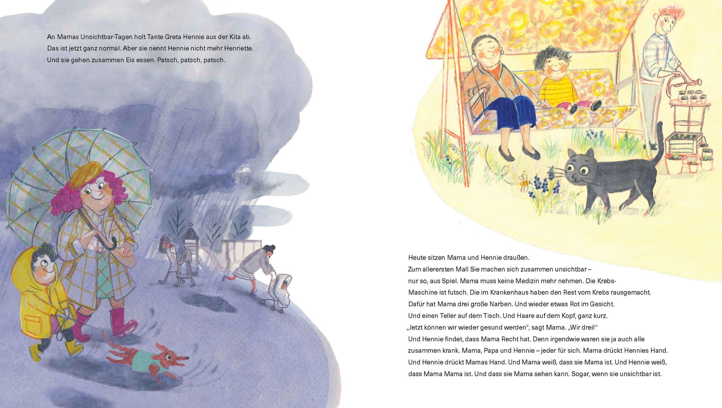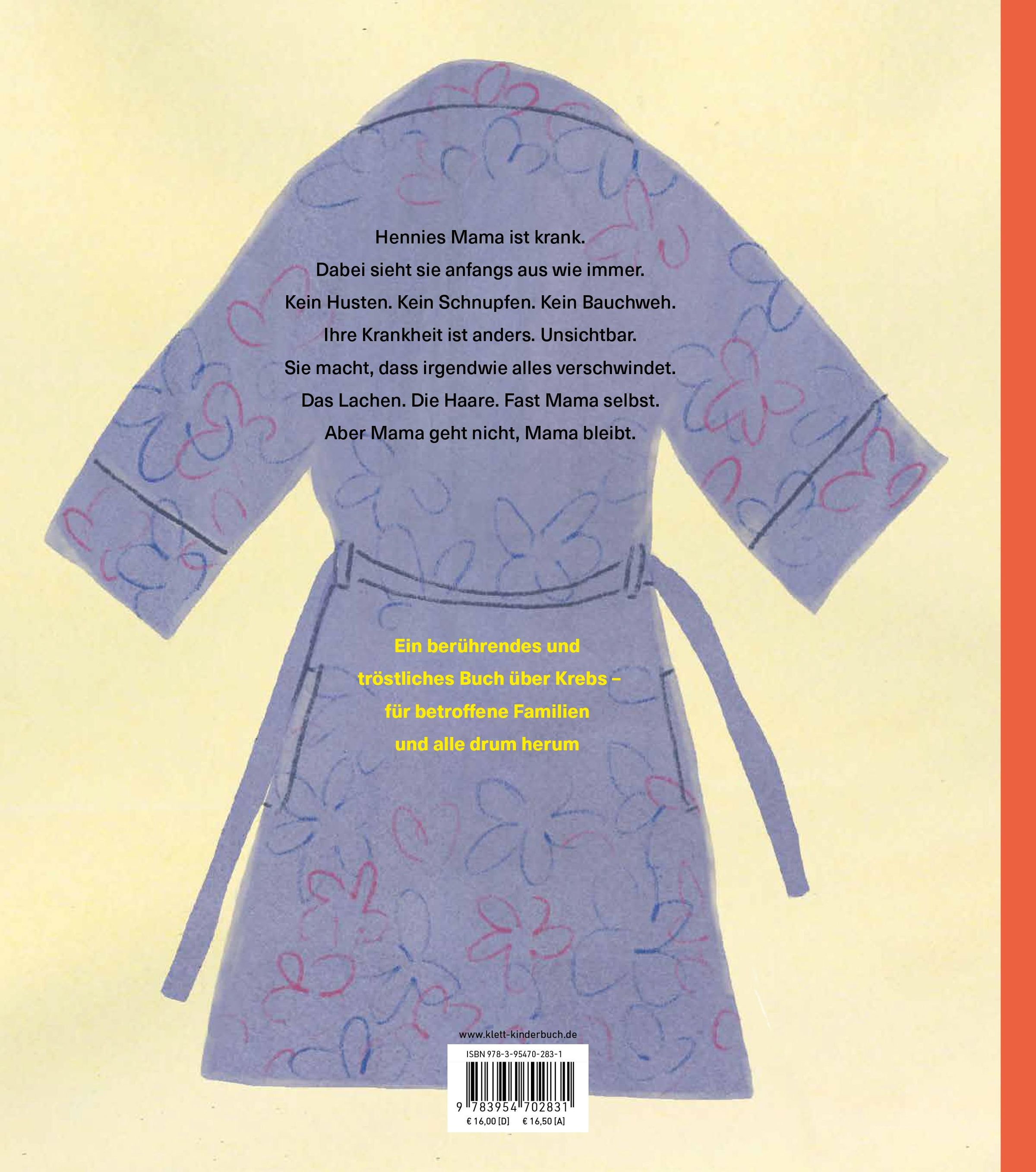 Hennies Mama ist krank. Dabei sieht sie anfangs aus wie immer. Kein Husten. Kein Schnupfen. Kein Bauchweh. Kein Auf-dem-Sofa-Liegen, Fernsehen und dann ist alles wieder gut. Mamas Kranksein ist anders. Unsichtbar. Der Krebs macht, dass irgendwie alles verschwindet. Erst die Wörter, dann das Lachen, Mamas Appetit und Mamas Haare. Bis sogar Mama selbst fast verschwindet. Aber Hennie und Mama finden einen geheimen Trick, um Mama sichtbar zu machen.