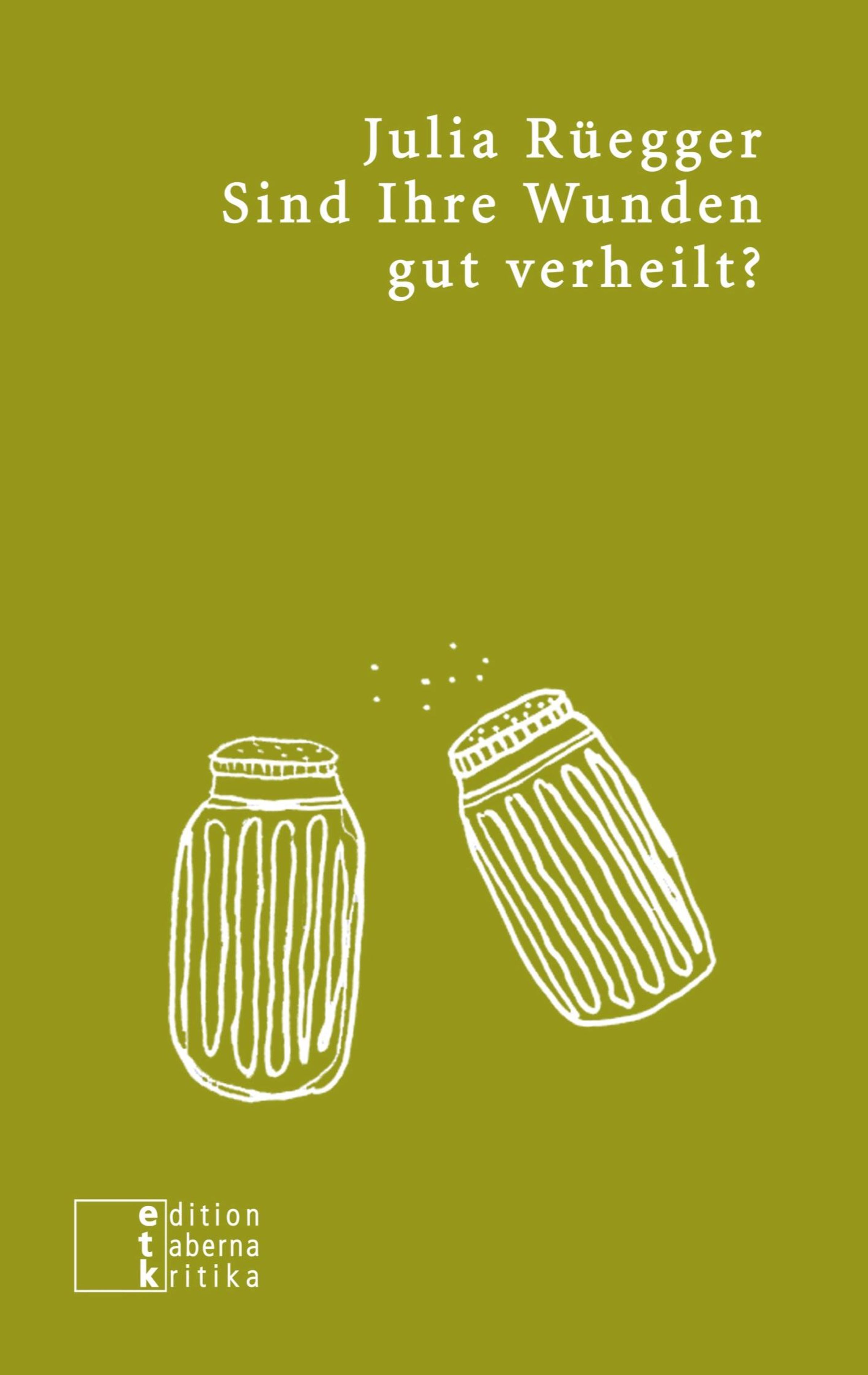 "Julia Rüegger - Sind Ihre Wunden gut verheilt?" Zwei schüttelnde Salzstreuer auf olivgrünem Hintergrund., Buch