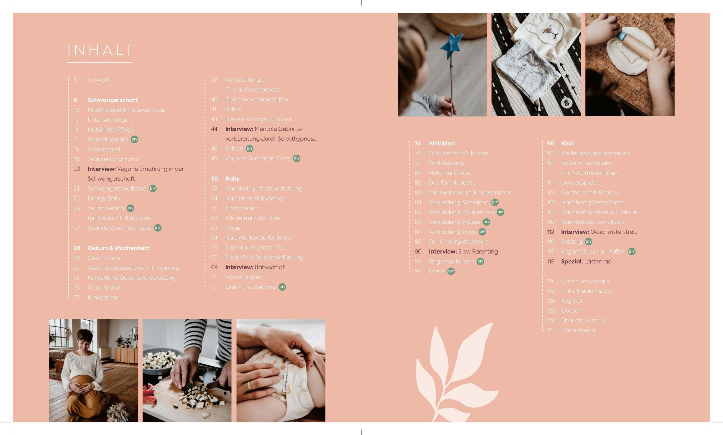 Außerdem gibt es Ideen für Spiele an die Hand, mit denen man (Klein-)Kinder für die Natur und ihre Umwelt sensibilisieren kann. Für die grüne Bloggerin und frisch gebackene 2-fach-Mama Julia Zohren bedeutet nachhaltiges Familienleben aber noch mehr: So gibt sie zudem Impulse für eine achtsame Geburtsvorbereitung, die natürliche Geburt sowie einen ruhigen, bewussten und natürlichen Umgang mit Kindern. Spannende Experten-Interviews mit weiteren erfolgreichen Bloggerinnen, wie zum Beispiel @langsam. achtsam. echt, zu den Themen Vegane Ernährung in der Schwangerschaft, Mentale Geburtsvorbereitung, Slow Parenting, Bedürfnisorientiert leben mit Kindern und Geschwisterbeziehungen runden die große inhaltliche Bandbreite dieses Buches ab.