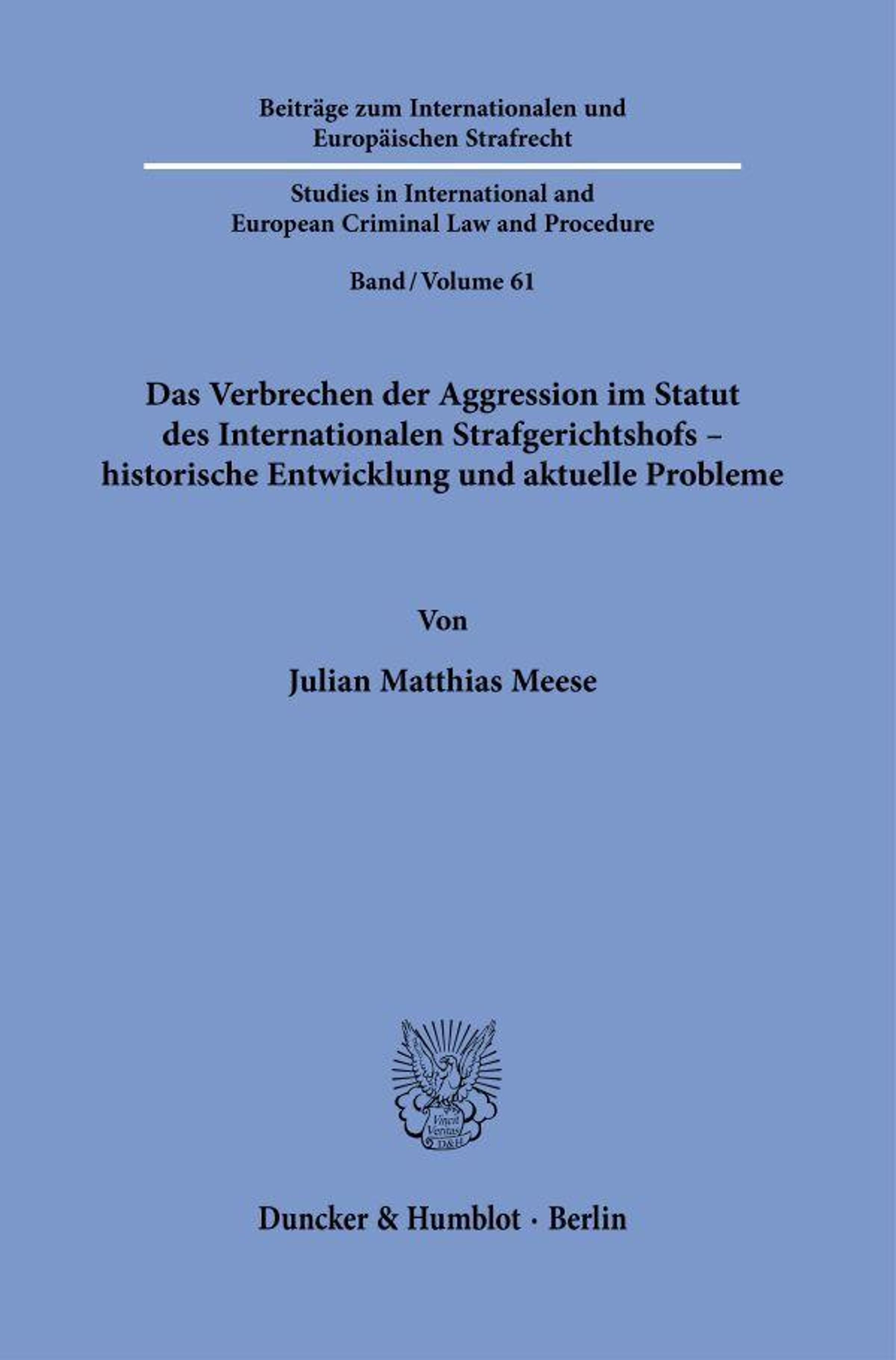 'The Crime of Aggression in the Statute of the International Criminal Court. Historical Development and Current Issues': The thesis deals with the crime of aggression in the ICC Statute and its foundations in international criminal law. Based on a historical analysis, the author examines the obstacles that stood in the way of codifying the criminal provision. The core of the thesis is a comprehensive analysis of the crime of aggression in the ICC Statute. In this context, problems in the application of the criminal provision are identified and examined to determine whether it is merely symbolic in nature.