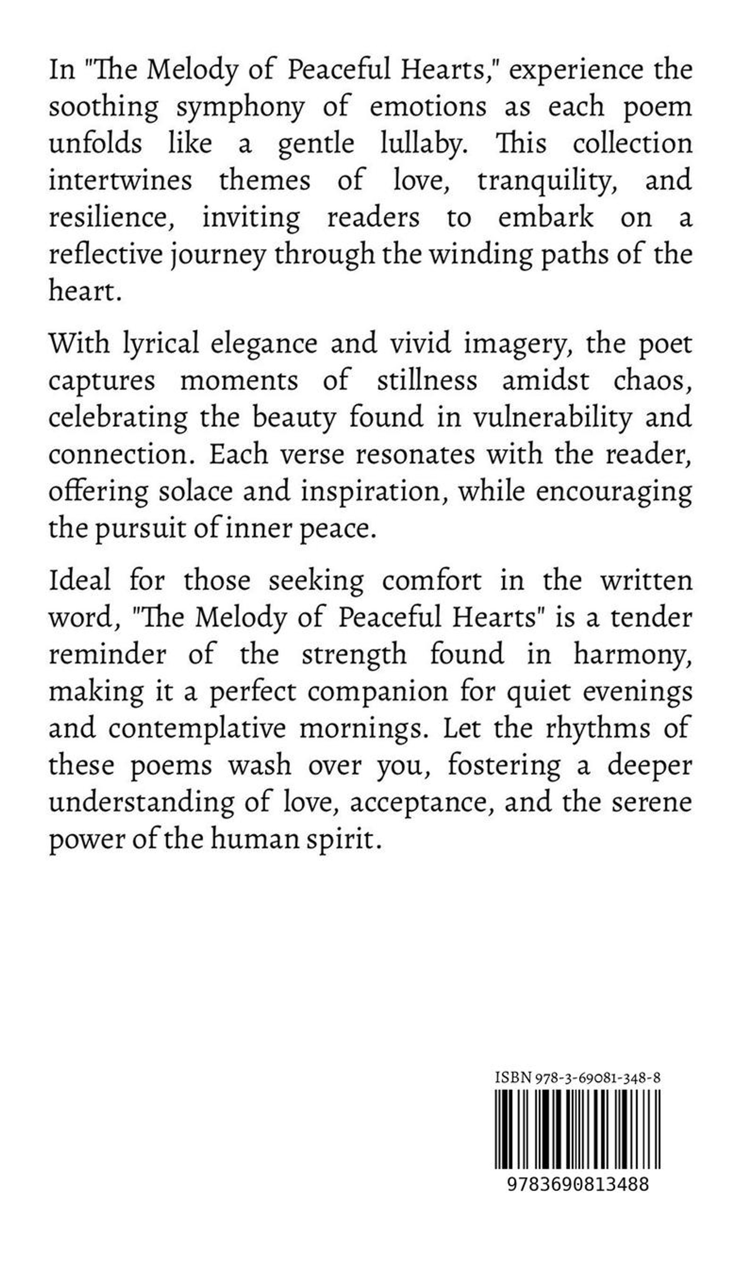 In "The Melody of Peaceful Hearts," experience the soothing symphony of emotions as each poem unfolds like a gentle lullaby. This collection intertwines themes of love, tranquility, and resilience, inviting readers to embark on a reflective journey through the winding paths of the heart. With lyrical elegance and vivid imagery, the poet captures moments of stillness amidst chaos, celebrating the beauty found in vulnerability and connection. Each verse resonates with the reader, offering solace and inspiration, while encouraging the pursuit of inner peace. Ideal for those seeking comfort in the written word, "The Melody of Peaceful Hearts" is a tender reminder of the strength found in harmony, making it a perfect companion for quiet evenings and contemplative mornings. Let the rhythms of these poems wash over you, fostering a deeper understanding of love, acceptance, and the serene power of the human spirit.