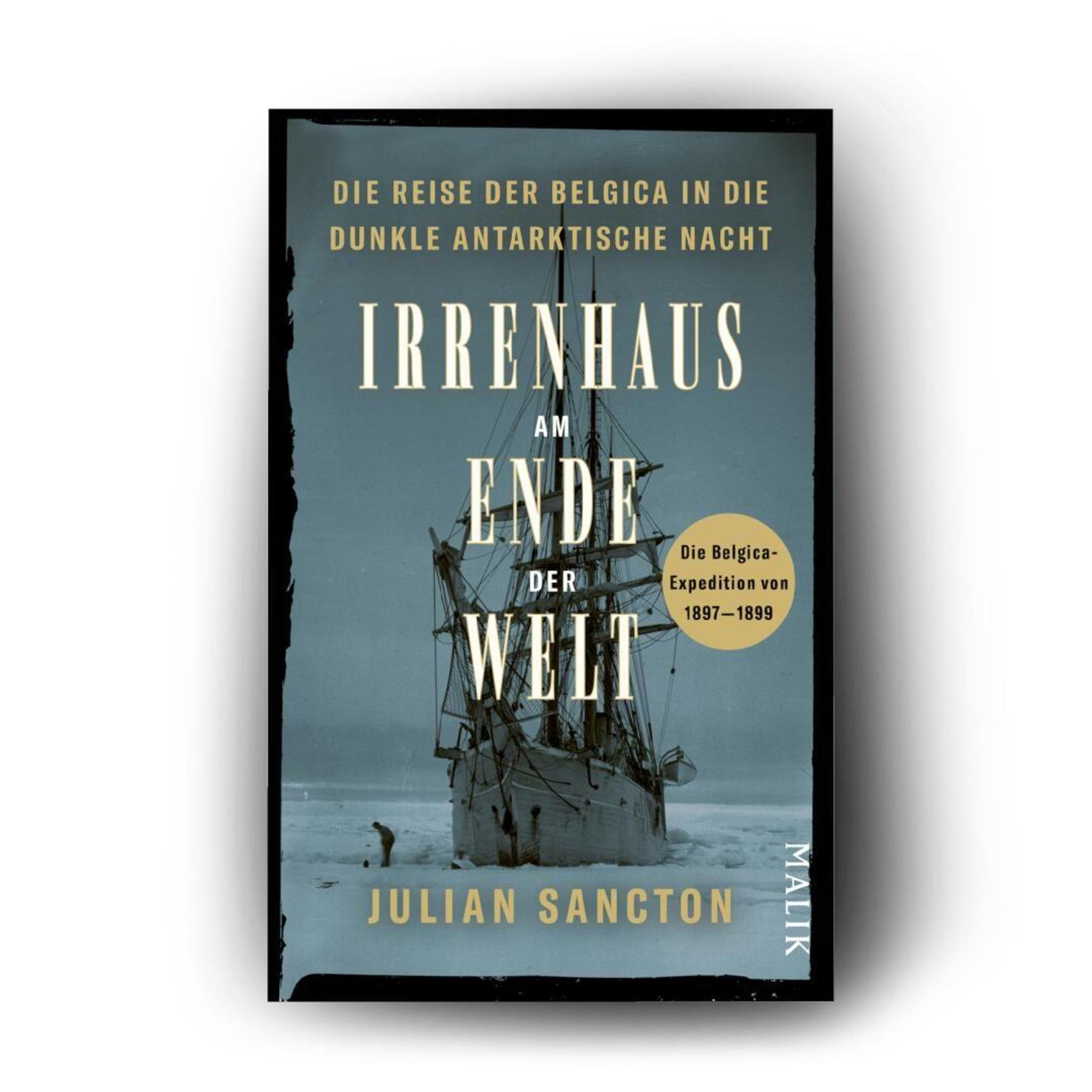 Buchtitel: "Irrenhaus am Ende der Welt". Ein Schiff steckt im Eis, oben Menschen auf Eis. Autor: Julian Sancton., Buch