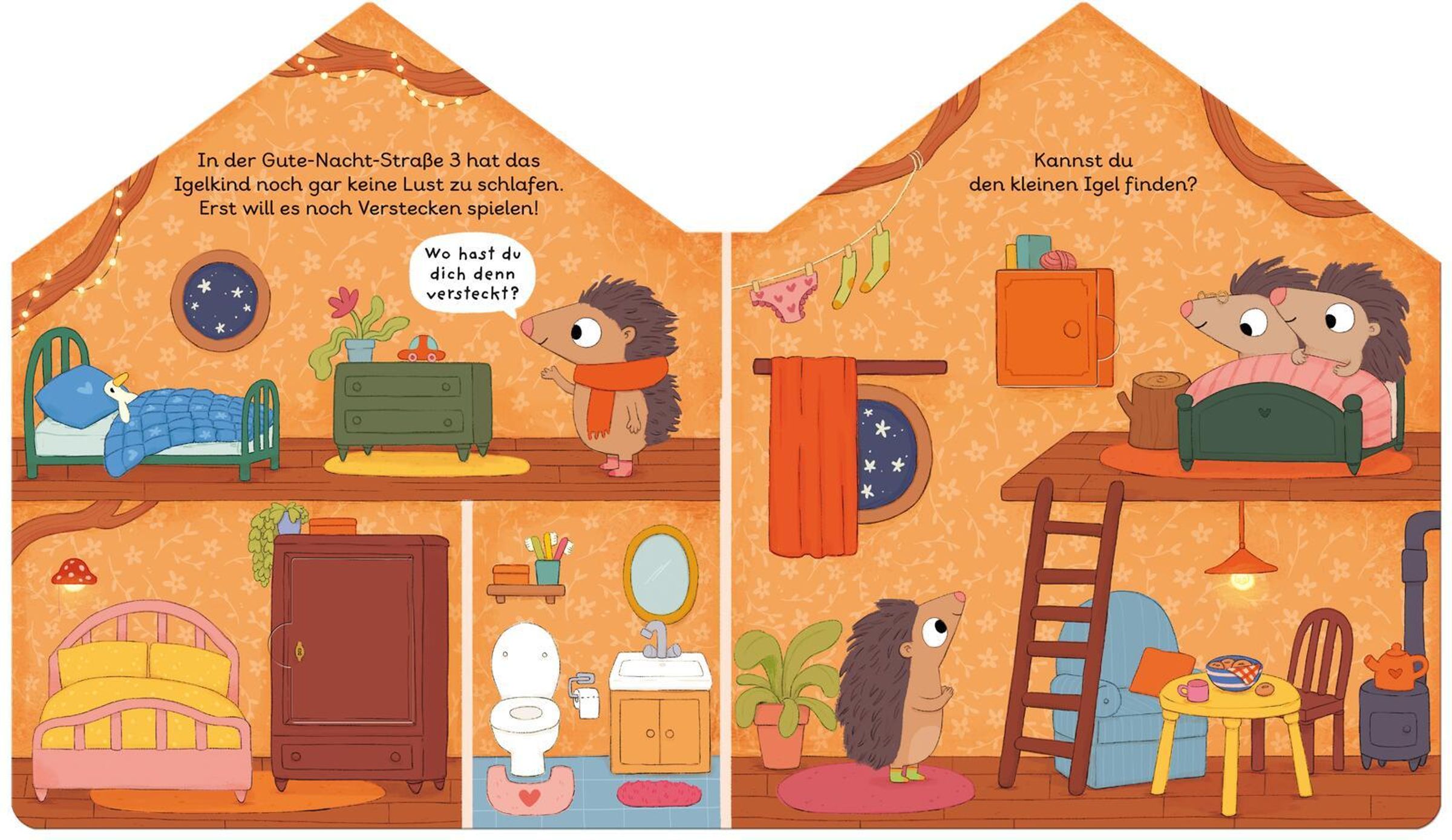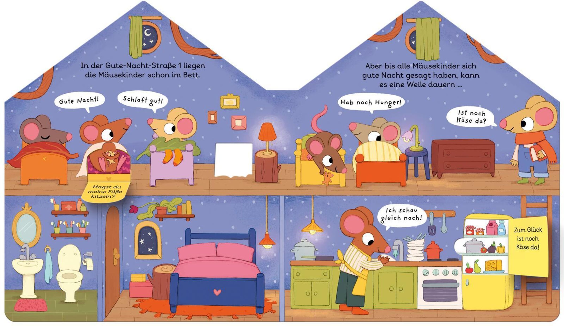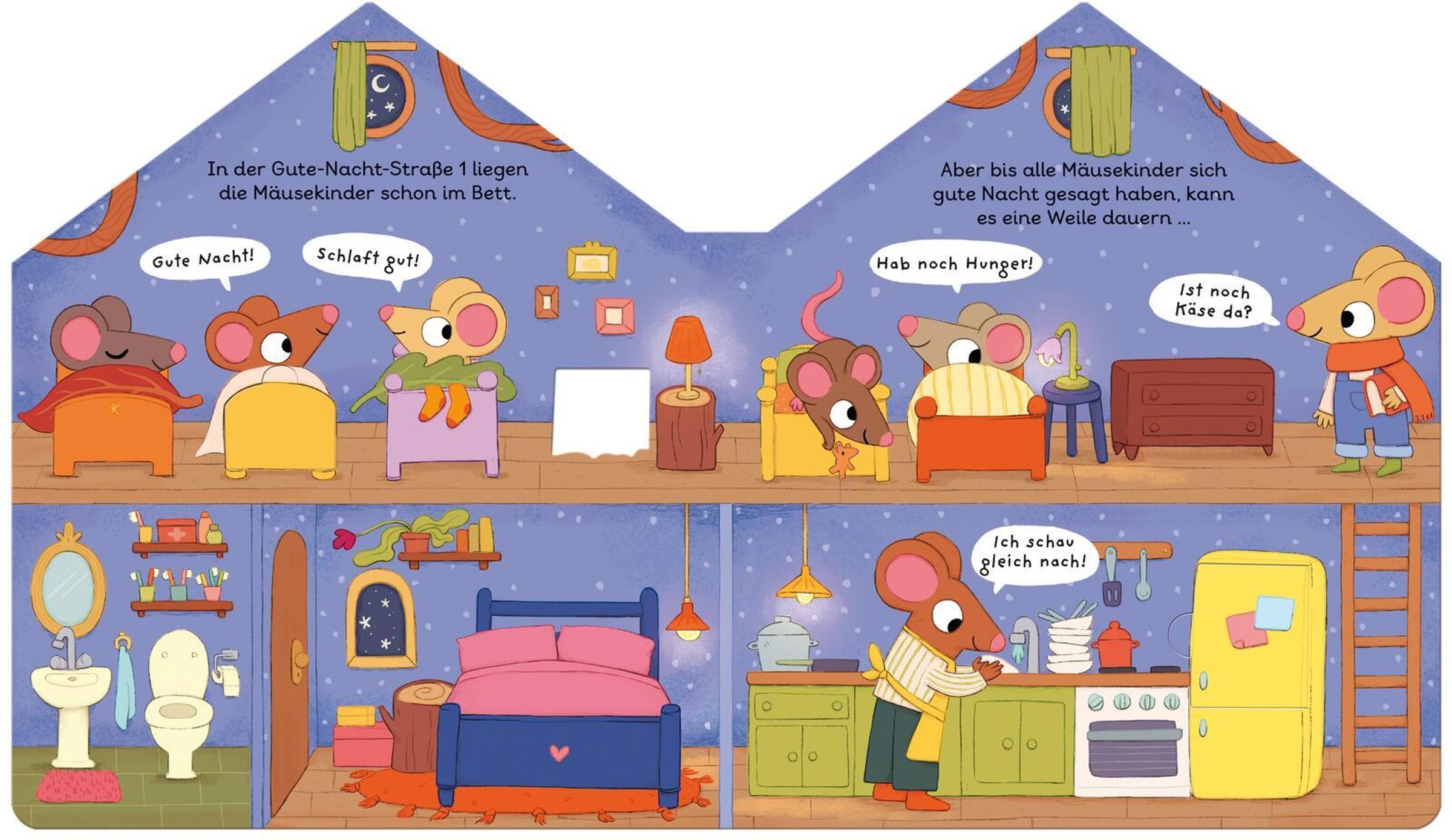 „Die Gute Nacht Straße“, zwei Mäuse schauen aus einem Haus mit Herzblumentöpfen und Lichterkette, Illustration., Buch