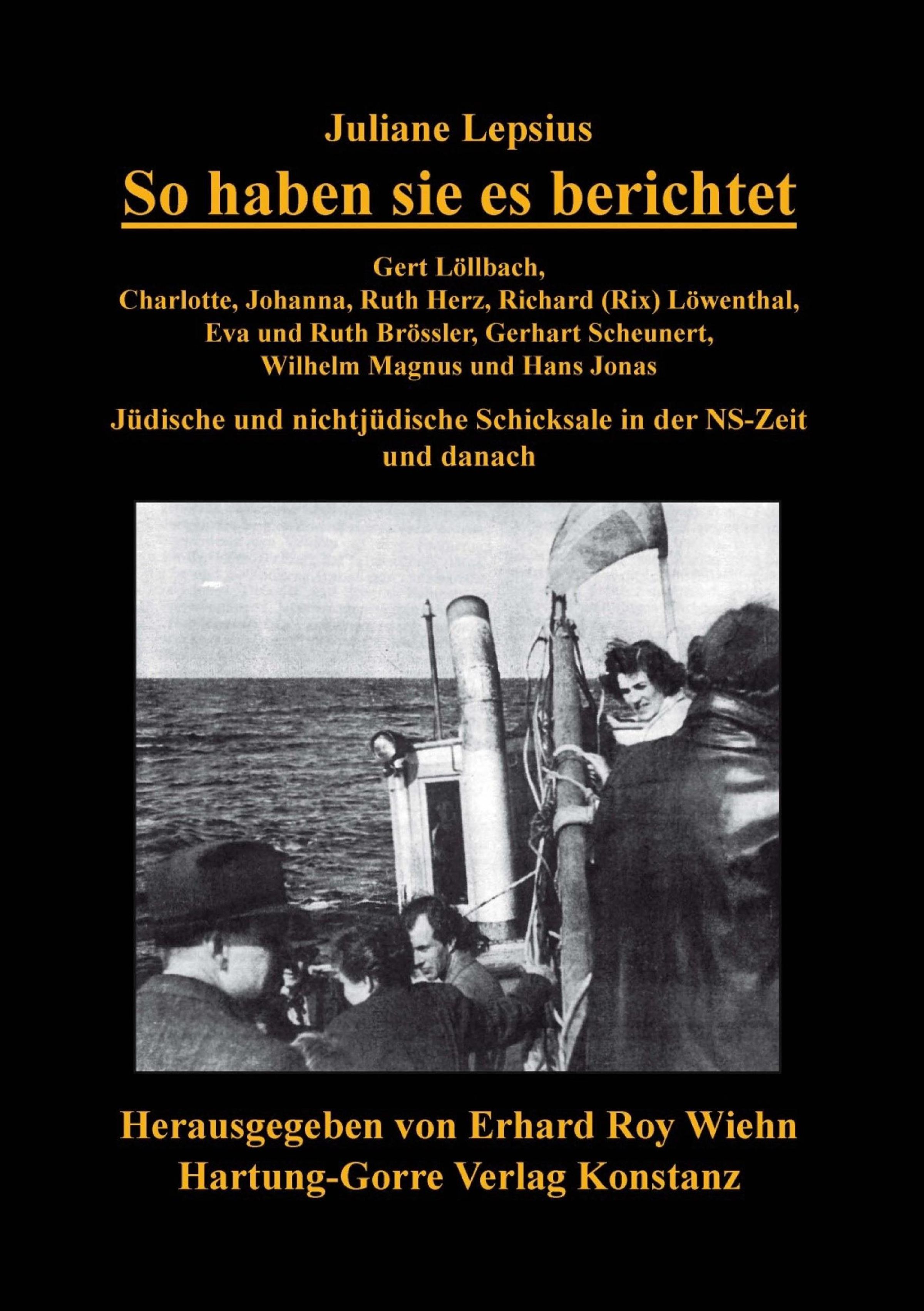 Juliane Lepsius: So haben sie es berichtet. Jüdische und nichtjüdische Schicksale. Herausgegeben von Erhard Roy Wiehn. Unten: Schwarz-weiß Foto von Menschen auf einem Schiff., Buch