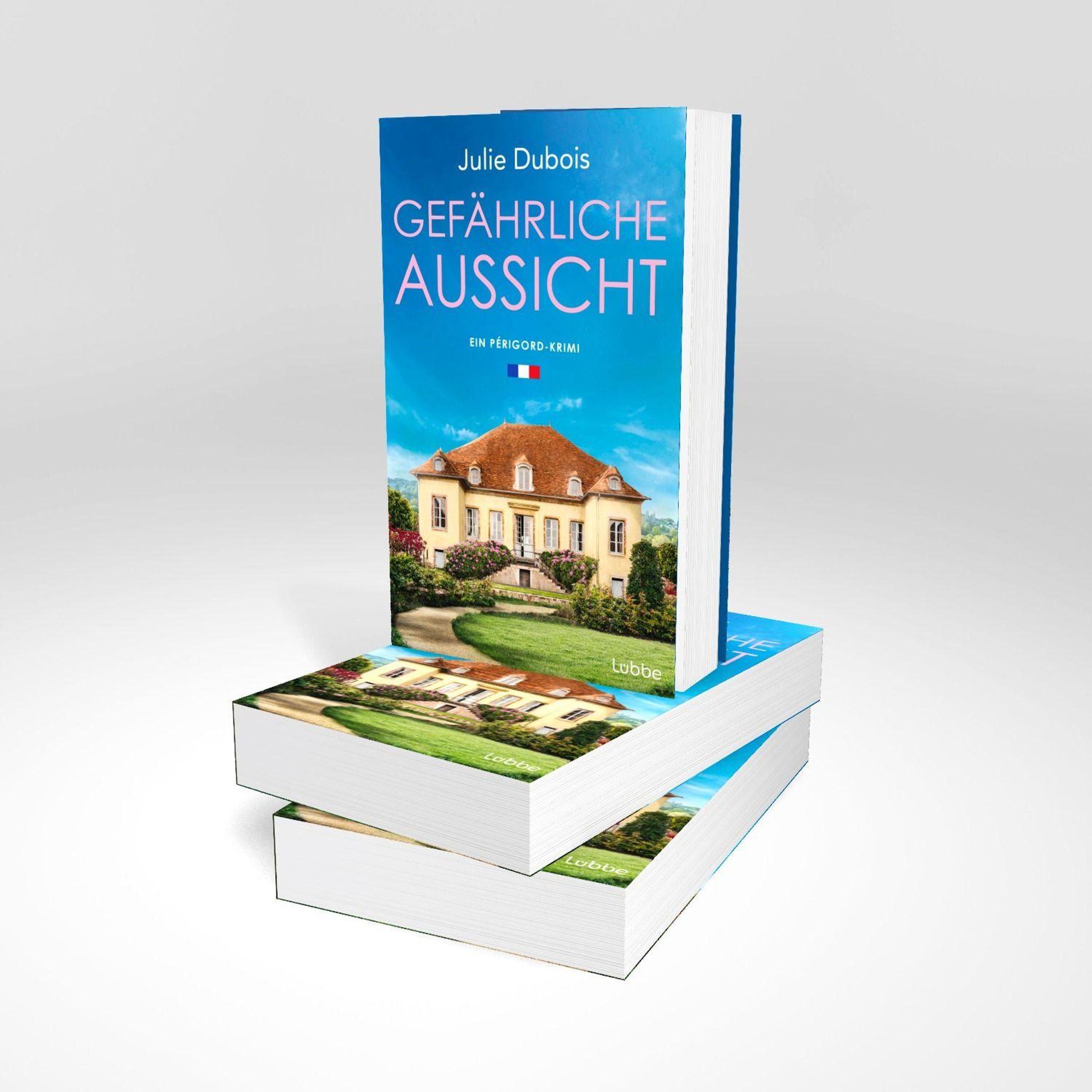 "Julie Dubois: Gefährliche Aussicht. Ein Périgord-Krimi." Ein elegantes Haus mit Garten unter klarem, blauem Himmel., Buch