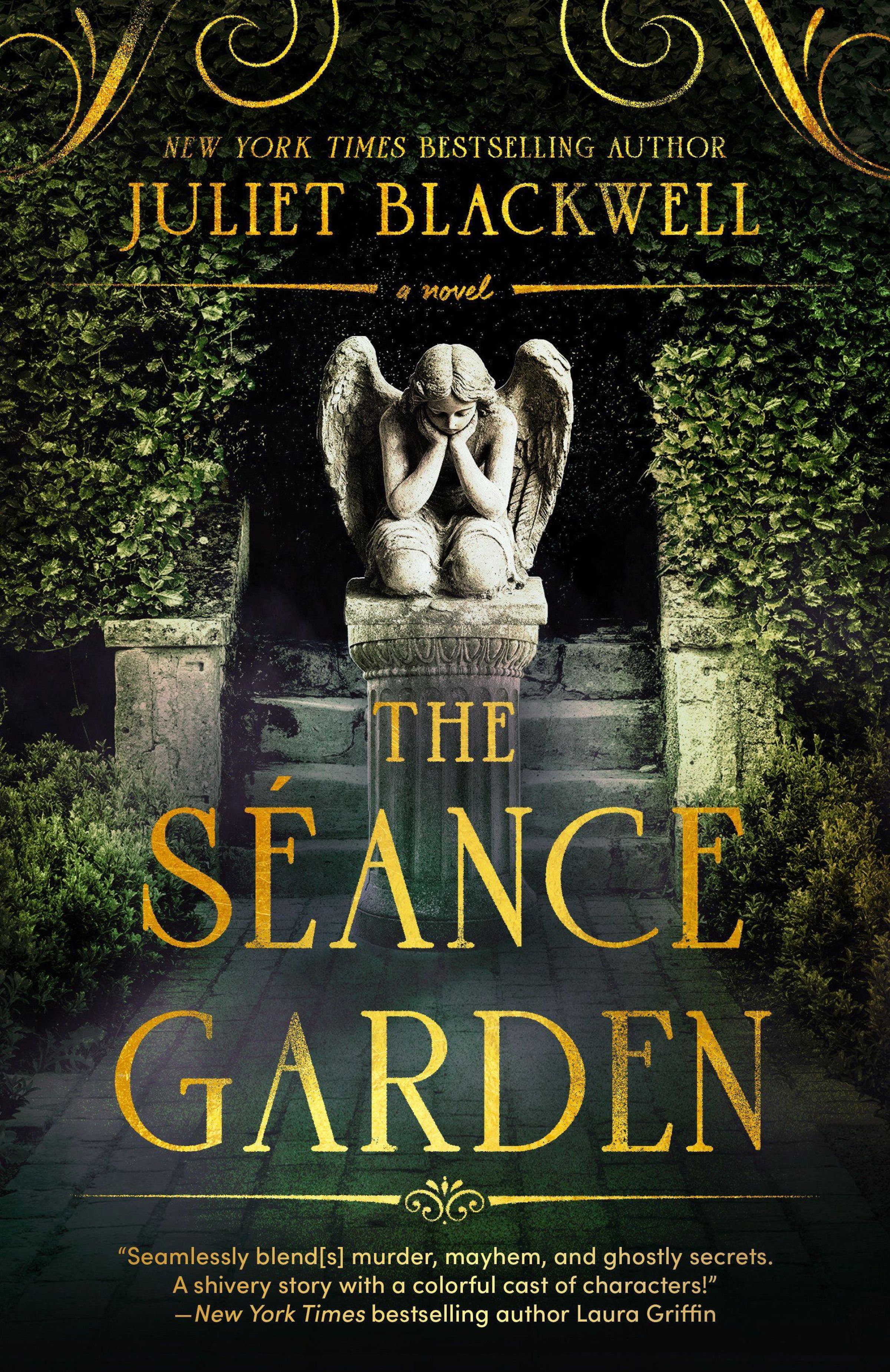 „The Séance Garden“, Juliet Blackwell, Engelsstatue in einem Garten vor dichtem Laub als Hintergrund., Buch
