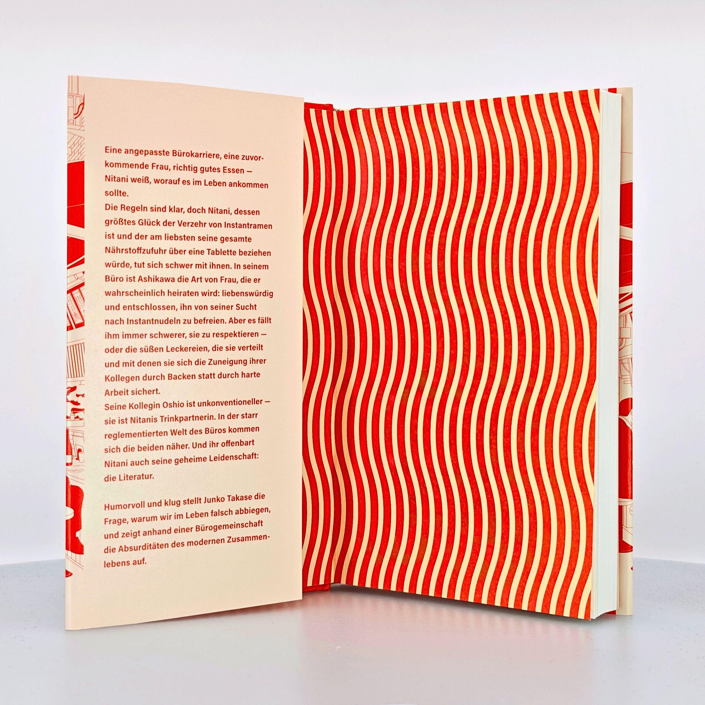 Eine angepasste Bürokarriere, eine zuvorkommende Frau, richtig gutes Essen - Nitani weiß, worauf es im Leben ankommen sollte. Die Regeln sind klar, doch Nitani, dessen größtes Glück der Verzehr von Instantramen ist und der am liebsten seine gesamte Nährstoffzufuhr über eine Tablette beziehen würde, tut sich schwer mit ihnen. In seinem Büro ist Ashikawa die Art von Frau, die er wahrscheinlich heiraten wird: liebenswürdig und entschlossen, ihn von seiner Sucht nach Instantnudeln zu befreien. Aber es fällt ihm immer schwerer, sie zu respektieren - oder die süßen Leckereien, die sie verteilt und mit denen sie sich die Zuneigung ihrer Kollegen durch Backen statt durch harte Arbeit sichert. Seine Kollegin Oshio ist unkonventioneller - sie ist Nitanis Trinkpartnerin. In der starr reglementierten Welt des Büros kommen sich die beiden näher. Und ihr offenbart Nitani auch seine geheime Leidenschaft: die Literatur. Humorvoll und klug stellt Junko Takase die Frage, warum wir im Leben manchmal falsch abbiegen, und zeigt anhand einer Bürogemeinschaft die Absurditäten des modernen Zusammenlebens auf.