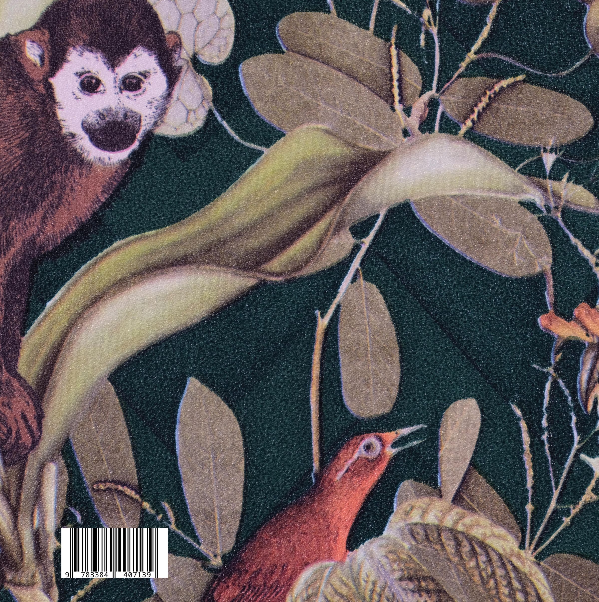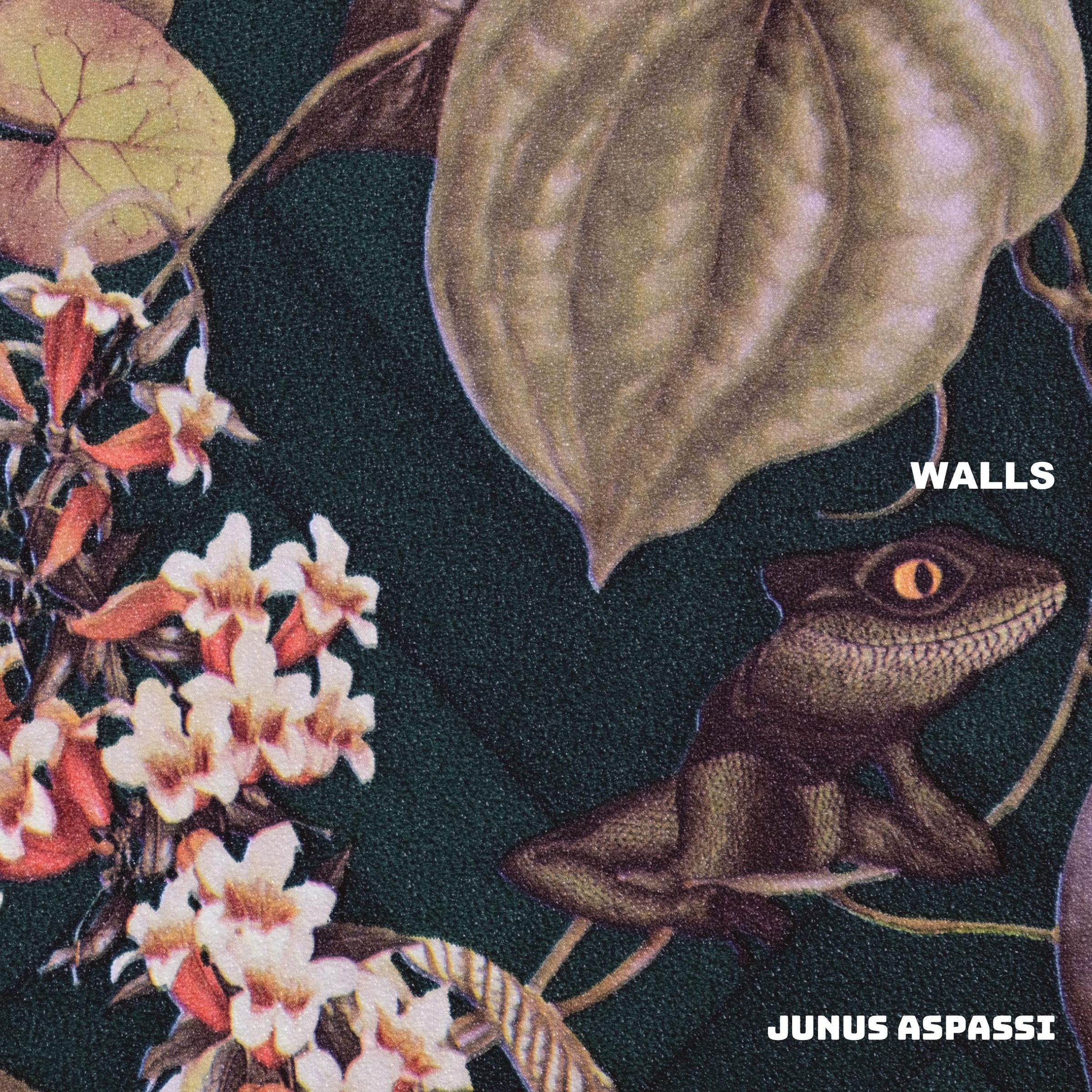 Text: "WALLS", "JUNUS ASPASSI". Illustration mit Blättern, Blumen und einer Eidechse auf dunklem Hintergrund., Buch