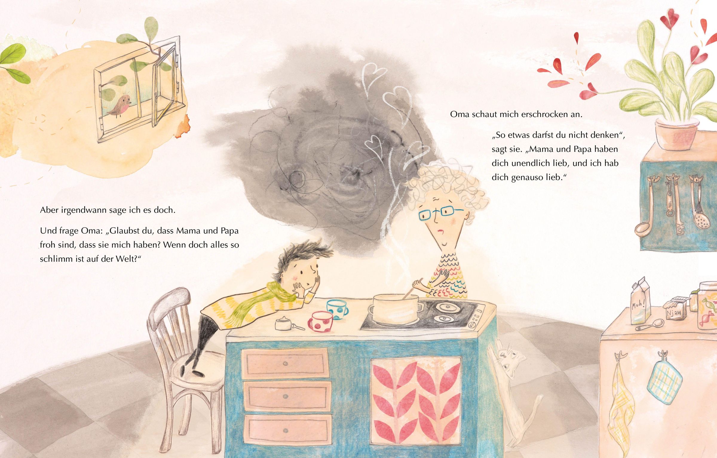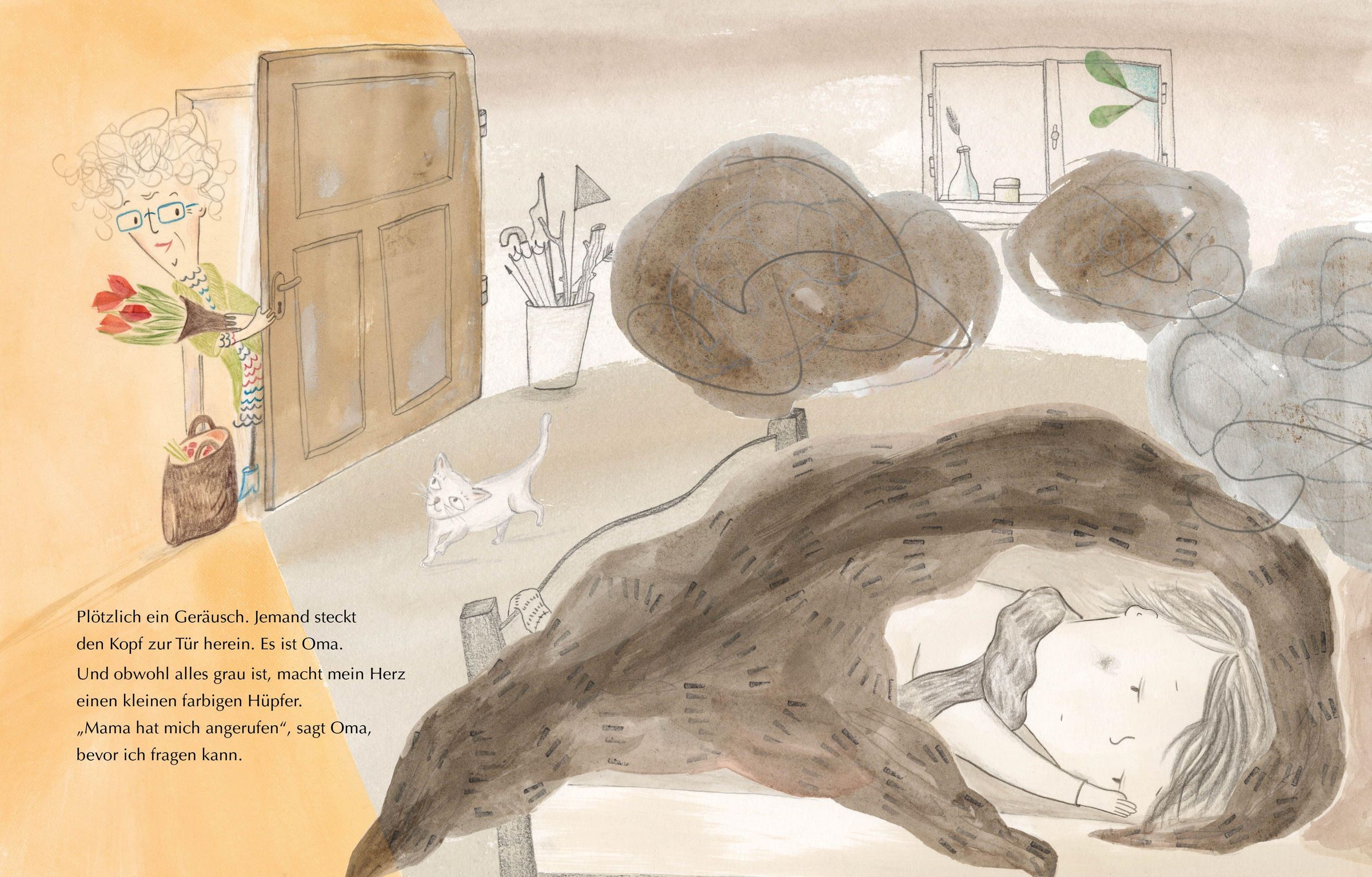 Zuerst ist das Lachen gegangen. Danach sind die Farben verschwunden. Alles fühlt sich schwer und grau an. Doch dann kommt Oma - mit offenen Armen, warmen Worten und einem Licht aus Hoffnung . Ganz langsam kehren die Farben zurück, und mit ihnen das Lachen.