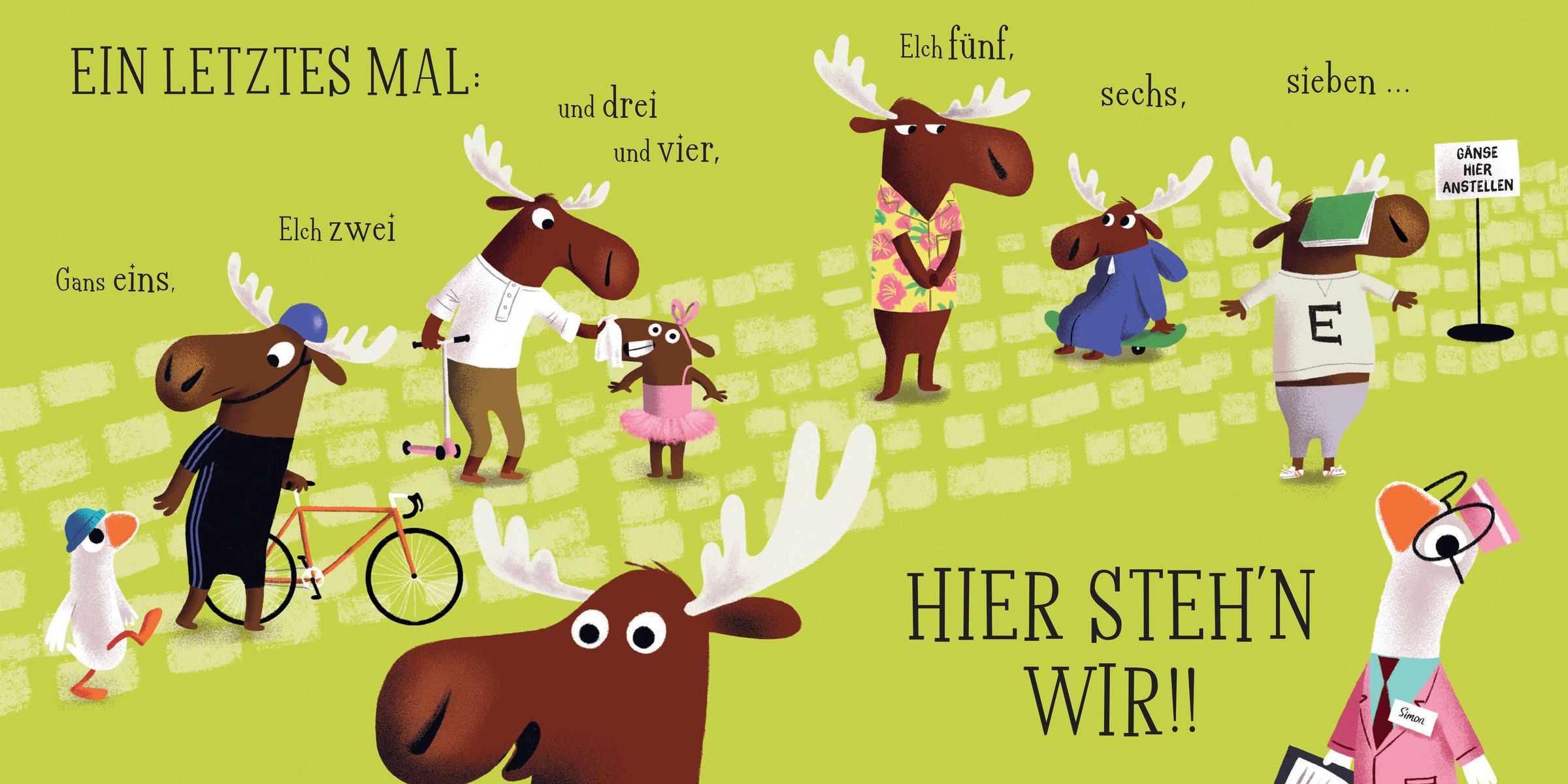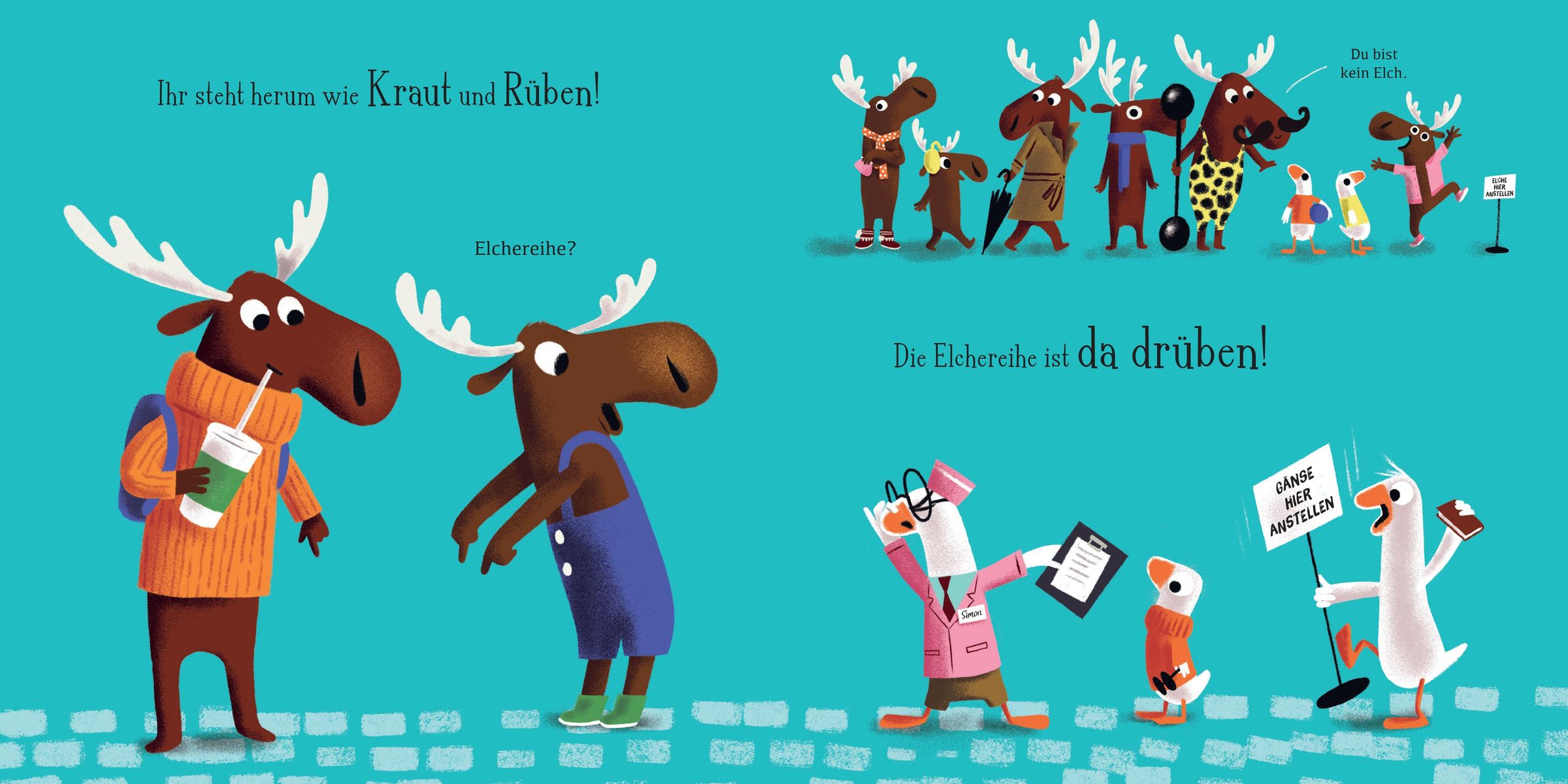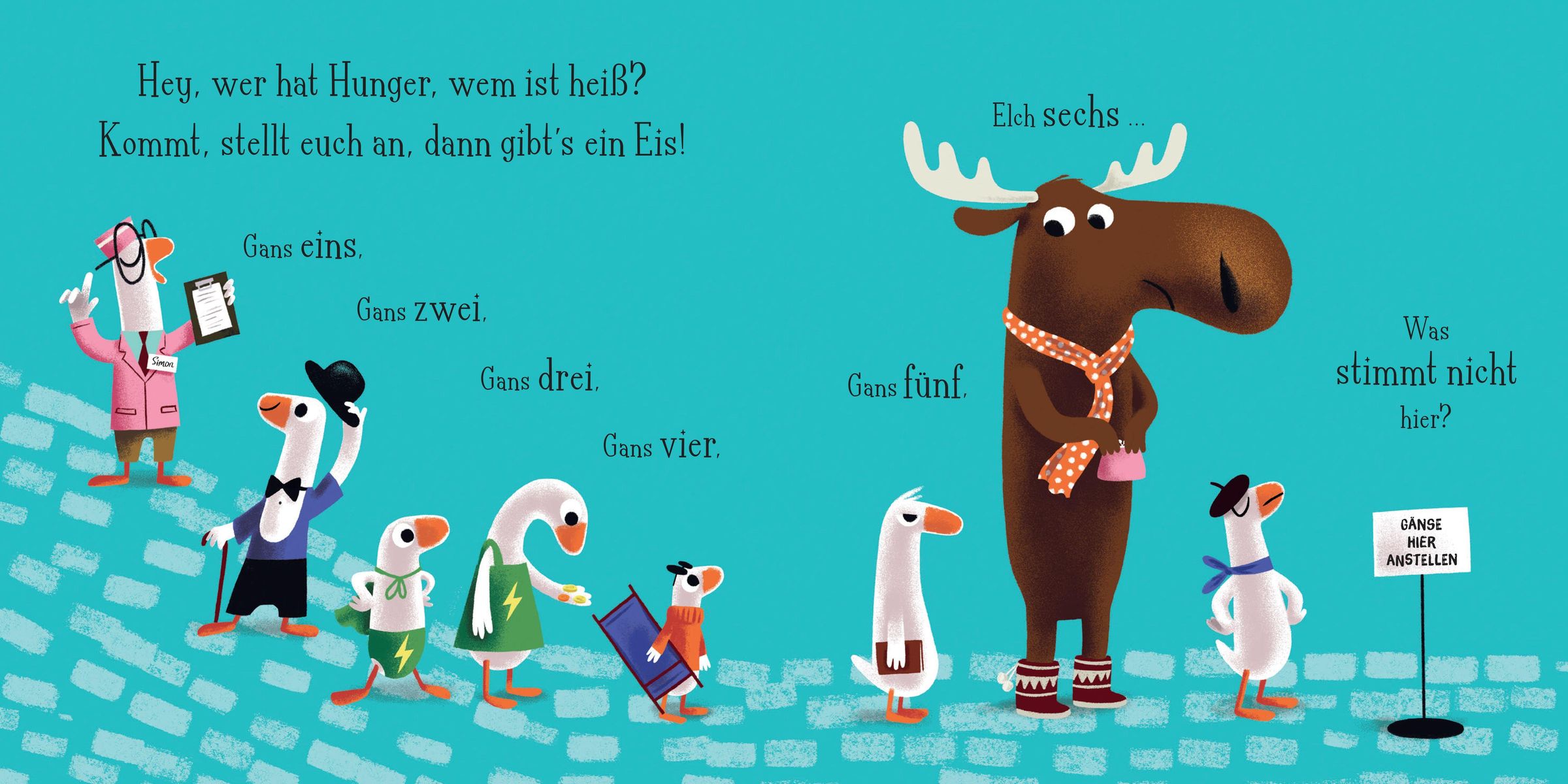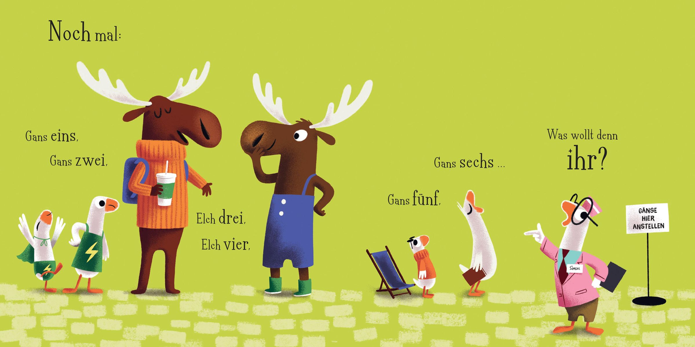 An einem heißen Sommertag wollen alle nur eins: ein Eis! Die Gänse stellen sich brav an, und der kleine Gänse-Eisverkäufer zählt gewissenhaft durch: Gans eins, Gans zwei ... Elch drei?! Moment mal - ein Elch in der Gänsereihe? Unerhört! So beginnt ein herrlich turbulenter Zählspaß mit jeder Menge tierischem Durcheinander. Als dann auch noch eine Maus auftaucht, ist das Chaos komplett!
