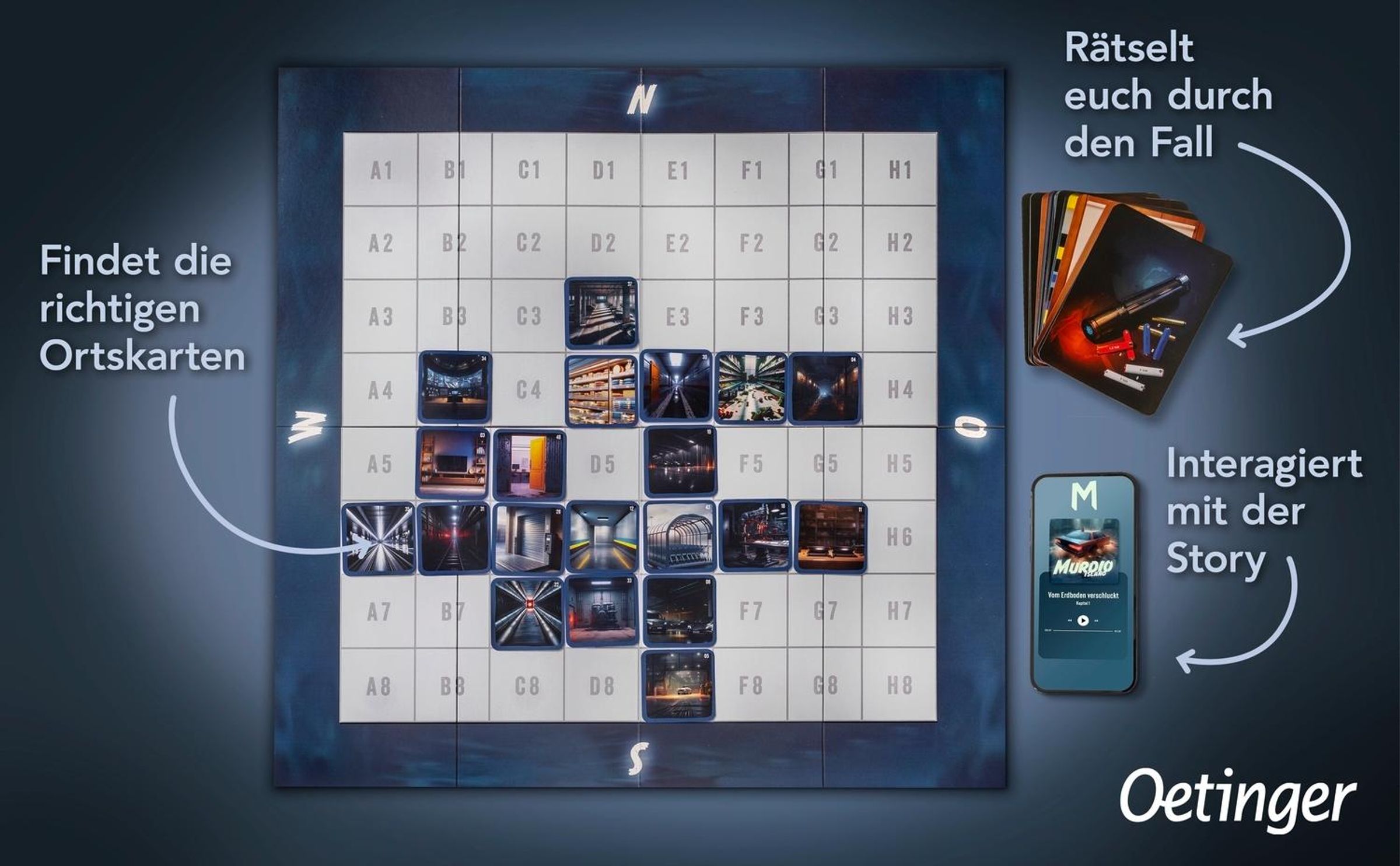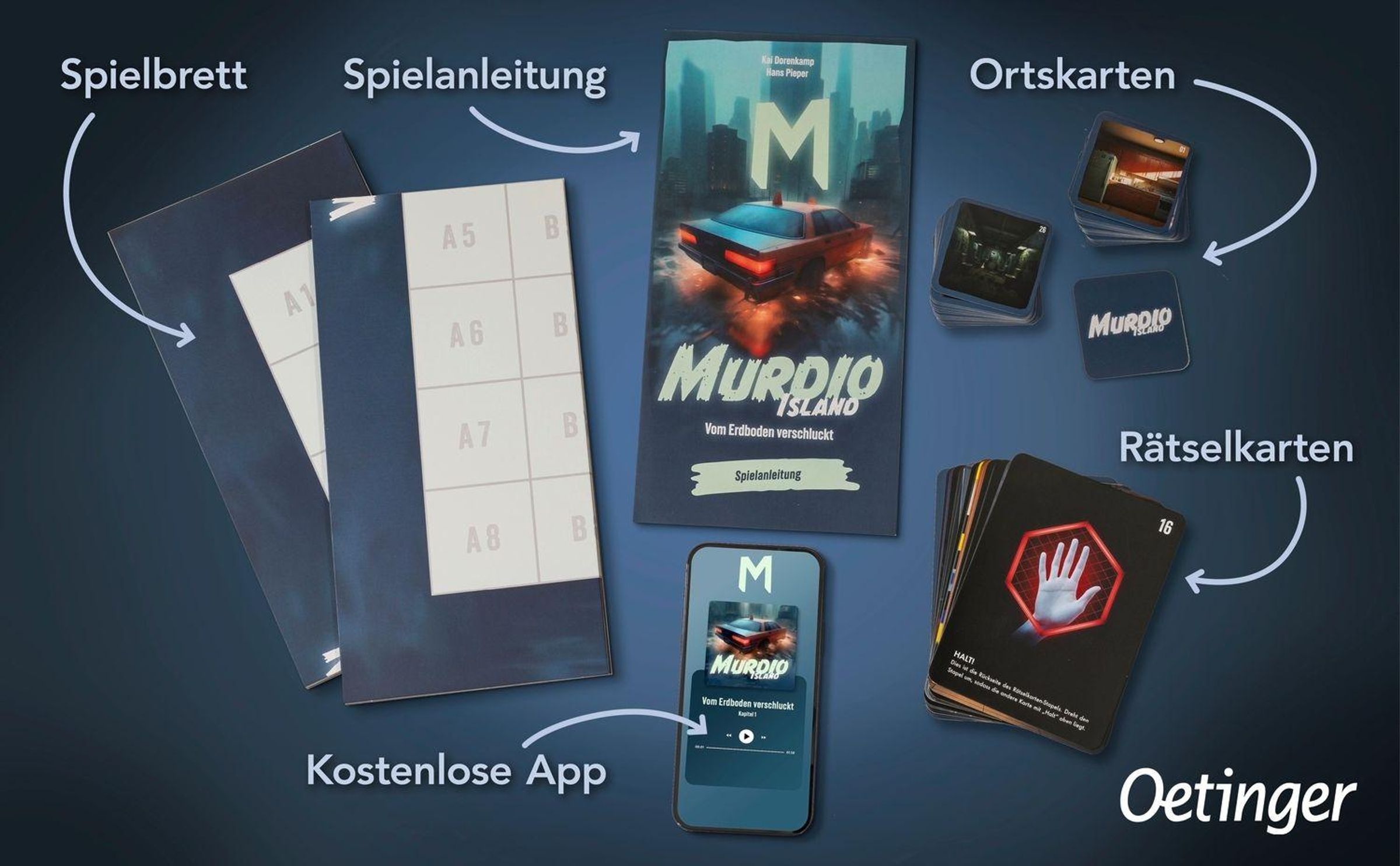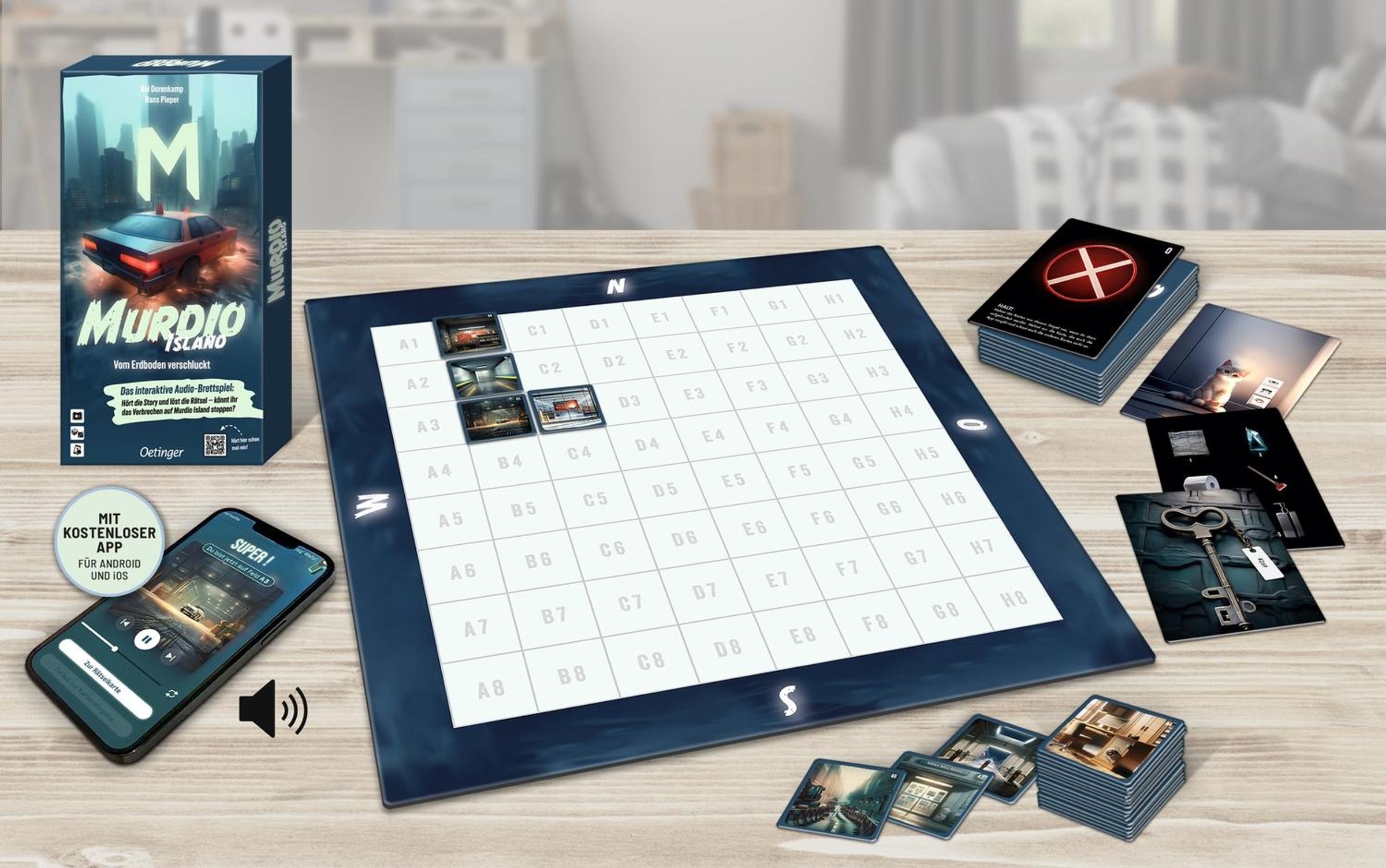 - Kombination aus einem großen, faltbaren Spielplan , analogen Spielkarten und einer kostenfreien Audio-App mit Eingabemöglichkeit.