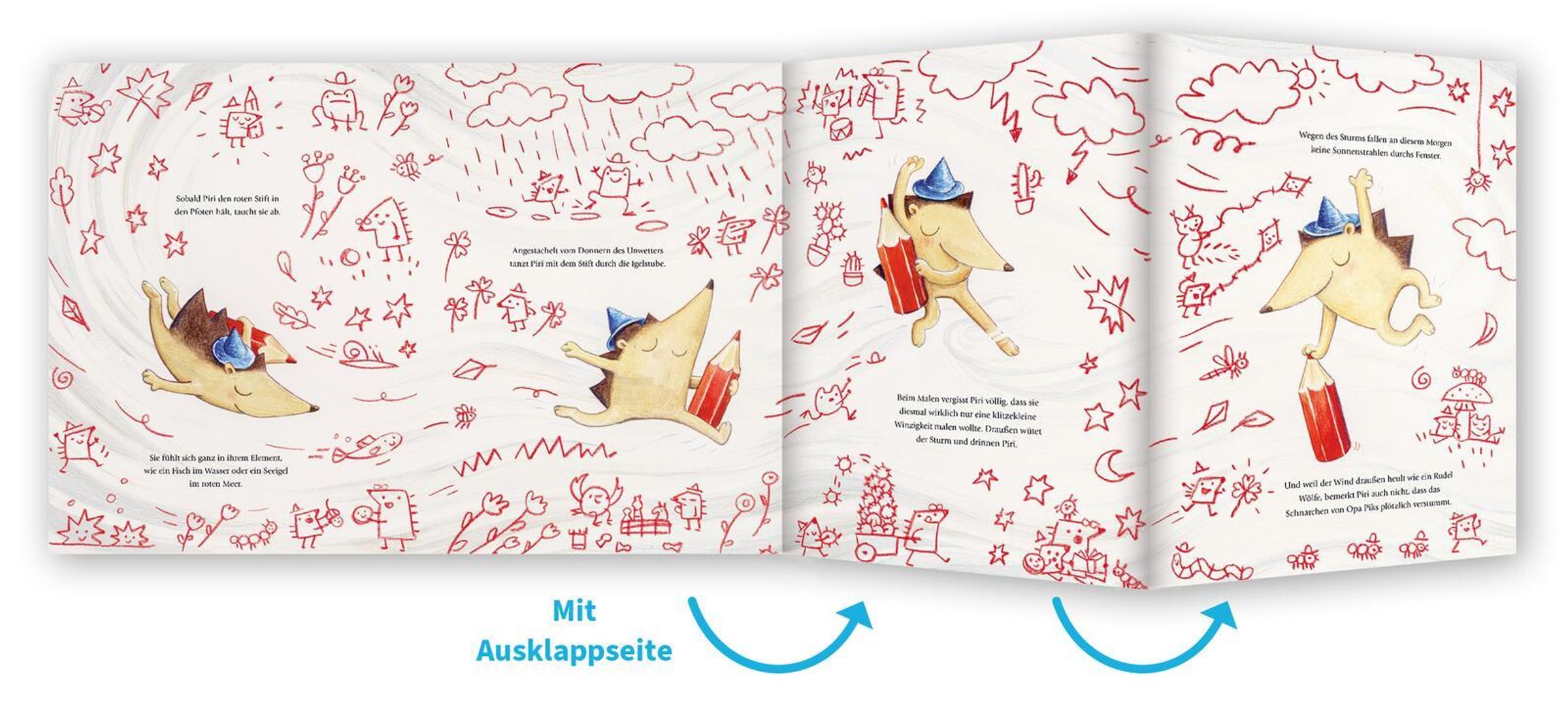 Igelmädchen Piri lebt mit ihrem Opa unter der gemütlichen alten Buche. Sie mag schaukeln und blaue Hüte stricken und liebt es zu malen! Kein Wunder, dass sie Opas knallroten Stift so faszinierend findet. Aber der ist streng verboten! Opa Piks möchte damit all seine Abenteuer aufschreiben. Erst malt Piri nur ein kleines Bild an die Wand. Doch Nacht für Nacht werden es mehr! Der knallrote Stift lässt Piri tanzen! Trotzdem wächst mit jedem Bild ihr schlechtes Gewissen. Und die Angst davor, Opa alles zu erzählen. Als er ihre Wandbilder schließlich entdeckt, fürchtet Piri das Schlimmste. Bis Opa ihr zeigt, dass hinter ihrem Geheimnis etwas ganz Wunderbares steckt.