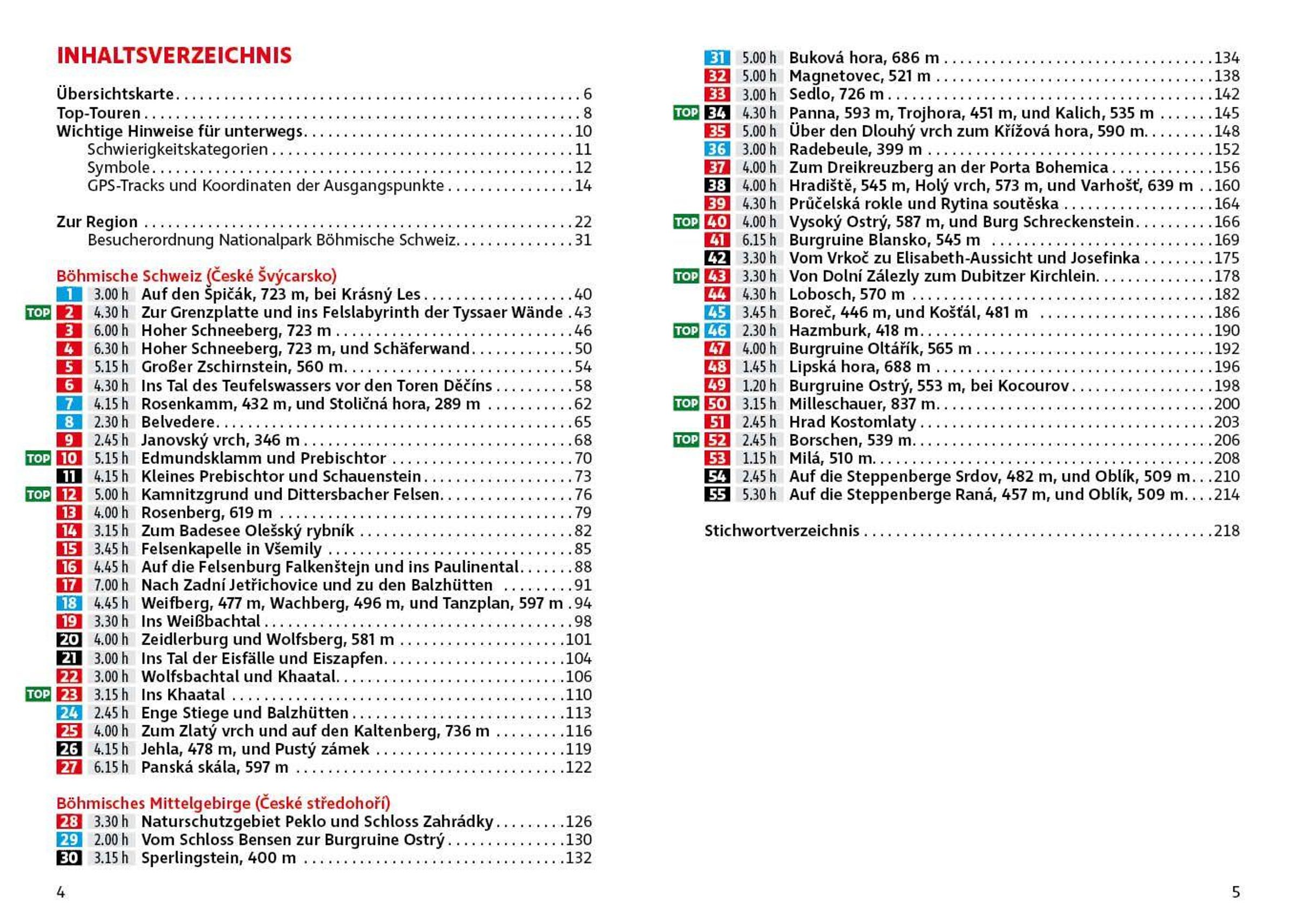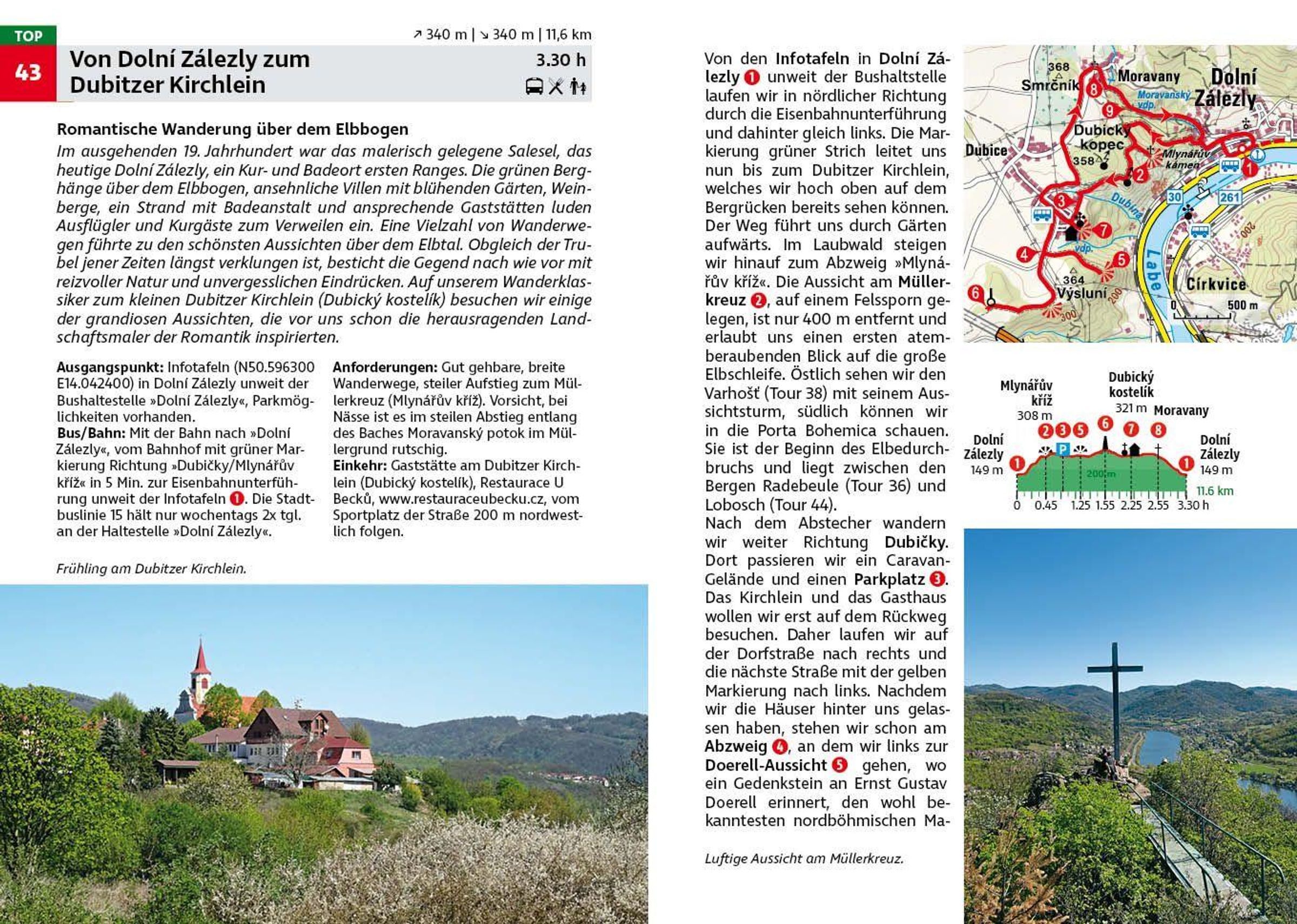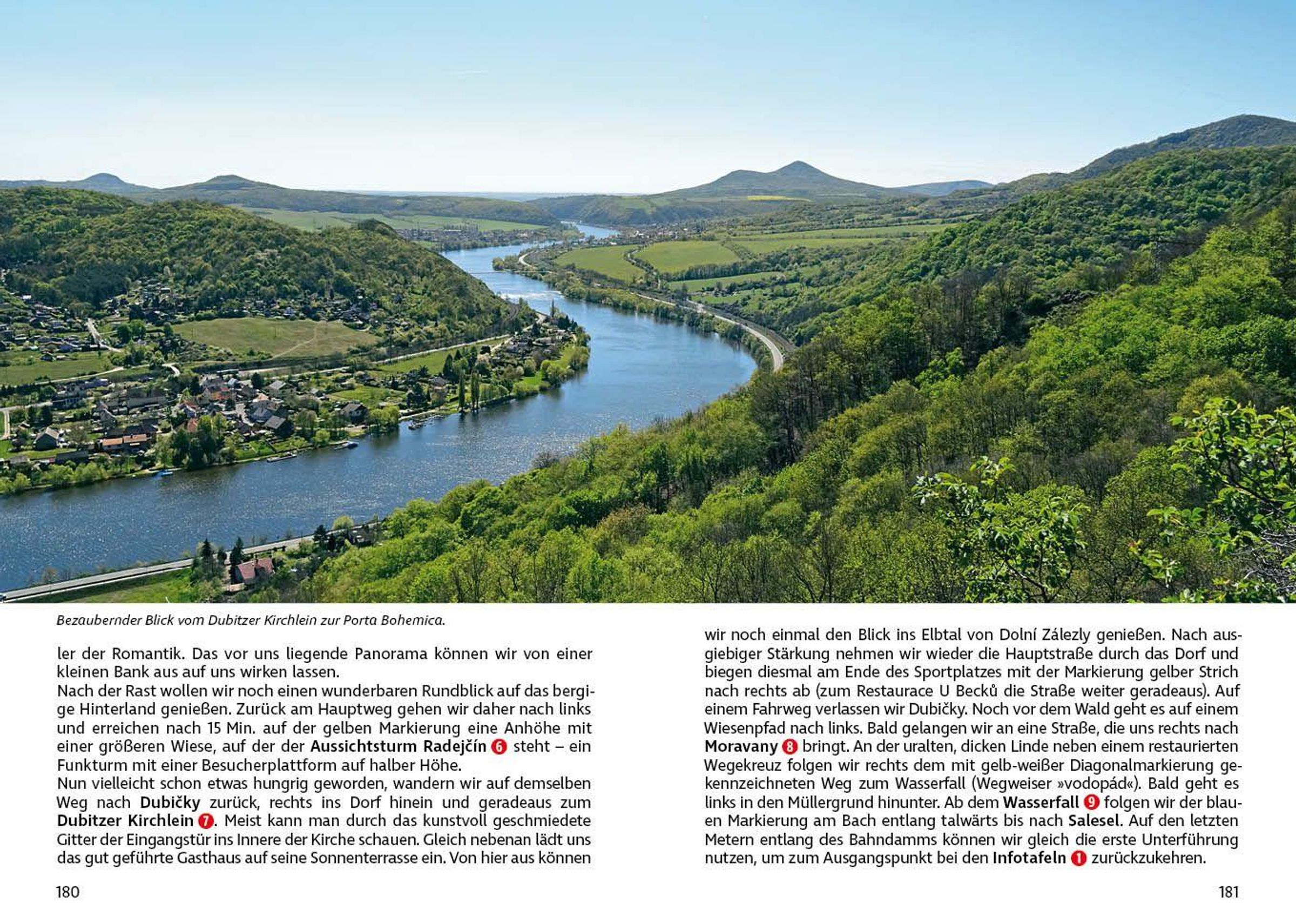 Die berühmtesten Aushängeschilder sind wohl das gigantische Prebischtor und die Edmundsklamm, außerdem der Marienfels, dessen Spitze ein kleiner Pavillon ziert. Stille, verwunschene Pfade führen zum Elbe-Canyon und auf die Tafelberge. Landschaftliche Wahrzeichen des Böhmischen Mittelgebirges sind die Porta Bohemica, die doppeltürmige Hasenburg und die hoch über der Elbe thronende Burg Schreckenstein. Sie inspirierten bereits die Maler der Romantik. Auch der von Goethe bestiegene Borschen, der kegelförmige Milleschauer und die einzigartigen Steppenberge im Westen sind in der Tourenauswahl enthalten, ebenso wie beschauliche Wanderungen durch Obsthaine und Blumenwiesen, zu mittelalterlichen Burgruinen und luftigen Aussichtstürmen.